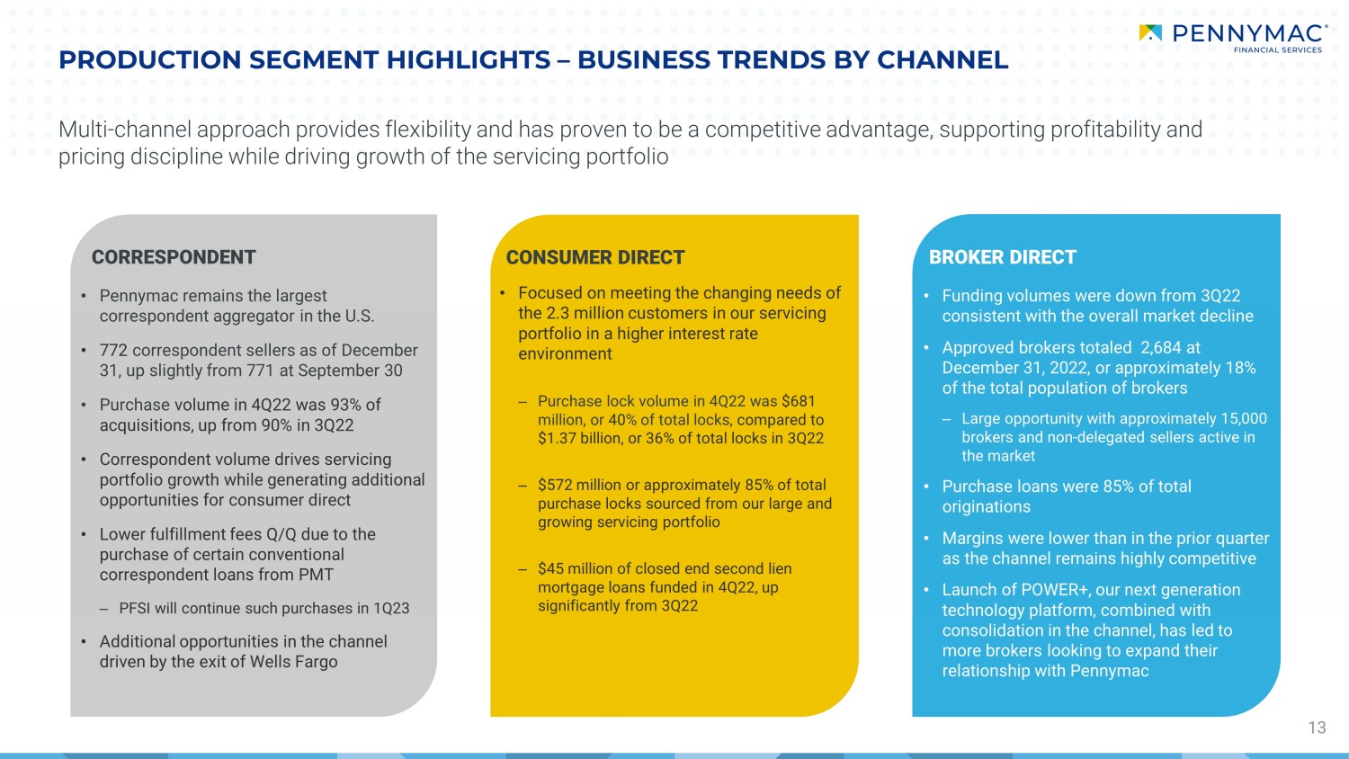 12 (1) Expected revenue net of direct origination costs at time of lock (2) Includes government - insured or guaranteed loans, as well as certain conventional loans for PFSI’s own account in 4Q22 (3) Reflects timing of revenue and loan origination expense recognition, hedging, pricing & execution changes, and other items DRIVERS OF PRODUCTION SEGMENT RESULTS • Production revenue margins were lower in all channels ; revenue per fallout adjusted lock for PFSI’s own account was 55 basis points in 4Q22, down from 3Q22 driven primarily by lower volumes in Consumer Direct • PFSI Correspondent includes $3.9 billion in UPB of lower margin conventional production from PMT which resulted in a reduction of margins in 4Q22 • Production expenses decreased 7% from the prior quarter while fallout adjusted locks were up 11% Fallout Adjusted Locks Margin / Fulfillment Fee (bps) (1) Revenue Contribution (net of Loan origination expense) % of Production Revenue Fallout Adjusted Locks Margin / Fulfillment Fee (bps) (1) Revenue Contribution (net of Loan origination expense) % of Production Revenue Fallout Adjusted Locks Margin / Fulfillment Fee (bps) (1) Revenue Contribution (net of Loan origination expense) % of Production Revenue PFSI Correspondent (2) 15,059$ 24 36.3$ 11% 12,014$ 24 29.4$ 17% 14,873$ 21 30.5$ 29% Consumer Direct 10,070 336 338.7 99% 2,140 366 78.3 46% 894 358 32.0 30% Broker Direct 3,155 68 21.4 6% 1,319 70 9.3 5% 1,466 56 8.2 8% Other (3) n/a n/a (75.6) -22% n/a n/a 35.7 21% n/a n/a 23.6 22% Total PFSI account revenues (net of Loan origination expense) 28,284$ 113 320.8$ 94% 15,473$ 99 152.7$ 89% 17,234$ 55 94.4$ 89% PMT Conventional Correspondent 13,991 14 20.2 6% 10,232 18 18.4 11% 6,683 18 12.2 11% Total Production revenues (net of Loan origination expense) 81 340.9$ 100% 67 171.1$ 100% 45 106.6$ 100% Production expenses (less Loan origination expense) 55 234.4$ 69% 52 132.5$ 77% 48 115.6$ 108% Production segment pretax income 25 106.5$ 31% 15 38.6$ 23% (4) (9.0)$ -8% 4Q22 23,916$ 3Q22 25,705$ 4Q21 42,275$