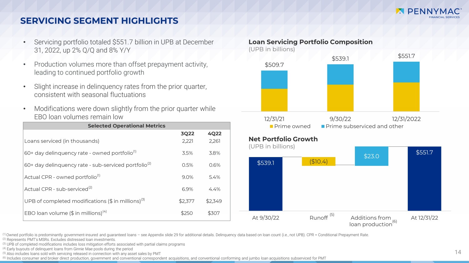 PRODUCTION SEGMENT HIGHLIGHTS – BUSINESS TRENDS BY CHANNEL 13 • Pennymac remains the largest correspondent aggregator in the U.S. • 772 correspondent sellers as of December 31, up slightly from 771 at September 30 • Purchase volume in 4Q22 was 93% of acquisitions, up from 90% in 3Q22 • Correspondent volume drives servicing portfolio growth while generating additional opportunities for consumer direct • Lower fulfillment fees Q/Q due to the purchase of certain conventional correspondent loans from PMT ‒ PFSI will continue such purchases in 1Q23 • Additional opportunities in the channel driven by the exit of Wells Fargo • Focused on meeting the changing needs of the 2.3 million customers in our servicing portfolio in a higher interest rate environment ‒ Purchase lock volume in 4Q22 was $681 million, or 40 % of total locks, compared to $1.37 billion, or 36% of total locks in 3Q22 ‒ $572 million or approximately 85% of total purchase locks sourced from our large and growing servicing portfolio ‒ $45 million of closed end second lien mortgage loans funded in 4Q22, up significantly from 3Q22 • Funding volumes were down from 3Q22 consistent with the overall market decline • Approved brokers totaled 2,684 a t December 31, 2022, or approximately 18% of the total population of brokers ‒ Large opportunity with approximately 15,000 brokers and non - delegated sellers active in the market • Purchase loans were 85% of total originations • Margins were lower than in the prior quarter as the channel remains highly competitive • Launch of POWER+, our next generation technology platform, combined with consolidation in the channel, has led to more brokers looking to expand their relationship with Pennymac CORRESPONDENT CONSUMER DIRECT BROKER DIRECT Multi - channel approach provides flexibility and has proven to be a competitive advantage, supporting profitability and pricing discipline while driving growth of the servicing portfolio