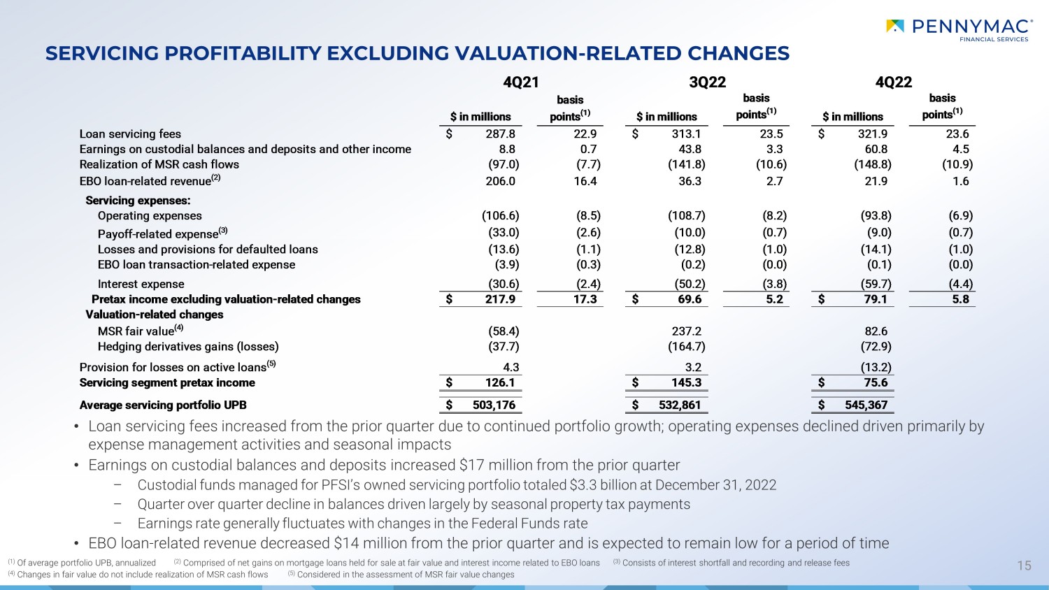 $539.1 $551.7 ($10.4) $23.0 At 9/30/22 Runoff Additions from loan production At 12/31/22 SERVICING SEGMENT HIGHLIGHTS 14 • Servicing portfolio totaled $551.7 billion in UPB at December 31, 2022, up 2% Q/Q and 8% Y/Y • Production volumes more than offset prepayment activity, leading to continued portfolio growth • Slight increase in delinquency rates from the prior quarter, consistent with seasonal fluctuations • Modifications were down slightly from the prior quarter while EBO loan volumes remain low Loan Servicing Portfolio Composition (UPB in billions) Net Portfolio Growth (UPB in billions) (1) Owned portfolio is predominantly government - insured and guaranteed loans – see Appendix slide 29 for additional details. Delinqu ency data based on loan count (i.e., not UPB). CPR = Conditional Prepayment Rate. (2) Represents PMT’s MSRs. Excludes distressed loan investments. (3) UPB of completed modifications includes loss mitigation efforts associated with partial claims programs (4) Early buyouts of delinquent loans from Ginnie Mae pools during the period (5) Also includes loans sold with servicing released in connection with any asset sales by PMT (6) Includes consumer and broker direct production, government and conventional correspondent acquisitions , and conventional conforming and jumbo loan acquisitions subserviced for PMT (5) (6) 3Q22 4Q22 Loans serviced (in thousands) 2,221 2,261 60+ day delinquency rate - owned portfolio (1) 3.5% 3.8% 60+ day delinquency rate - sub-serviced portfolio (2) 0.5% 0.6% Actual CPR - owned portfolio (1) 9.0% 5.4% Actual CPR - sub-serviced (2) 6.9% 4.4% UPB of completed modifications ($ in millions) (3) $2,377 $2,349 EBO loan volume ($ in millions) (4) $250 $307 Selected Operational Metrics $509.7 $539.1 $551.7 12/31/21 9/30/22 12/31/2022 Prime owned Prime subserviced and other