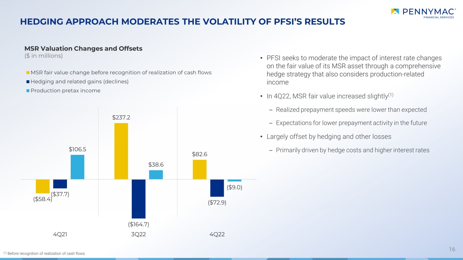 SERVICING PROFITABILITY EXCLUDING VALUATION - RELATED CHANGES 15 (1) Of average portfolio UPB, annualized (2) Comprised of net gains on mortgage loans held for sale at fair value and interest income related to EBO loans (3) Consists of interest shortfall and recording and release fees (4) Changes in fair value do not include realization of MSR cash flows (5) Considered in the assessment of MSR fair value changes • Loan servicing fees increased from the prior quarter due to continued portfolio growth; operating expenses declined driven pr ima rily by expense management activities and seasonal impacts • Earnings on custodial balances and deposits increased $17 million from the prior quarter – Custodial funds managed for PFSI’s owned servicing portfolio totaled $3.3 billion at December 31, 2022 – Quarter over quarter decline in balances driven largely by seasonal property tax payments – Earnings rate generally fluctuates with changes in the Federal Funds rate • EBO loan - related revenue decreased $14 million from the prior quarter and is expected to remain low for a period of time $ in millions basis points (1) $ in millions basis points (1) $ in millions basis points (1) Loan servicing fees 287.8$ 22.9 313.1$ 23.5 321.9$ 23.6 Earnings on custodial balances and deposits and other income 8.8 0.7 43.8 3.3 60.8 4.5 Realization of MSR cash flows (97.0) (7.7) (141.8) (10.6) (148.8) (10.9) EBO loan-related revenue (2) 206.0 16.4 36.3 2.7 21.9 1.6 Servicing expenses: Operating expenses (106.6) (8.5) (108.7) (8.2) (93.8) (6.9) Payoff-related expense (3) (33.0) (2.6) (10.0) (0.7) (9.0) (0.7) Losses and provisions for defaulted loans (13.6) (1.1) (12.8) (1.0) (14.1) (1.0) EBO loan transaction-related expense (3.9) (0.3) (0.2) (0.0) (0.1) (0.0) Interest expense (30.6) (2.4) (50.2) (3.8) (59.7) (4.4) Pretax income excluding valuation-related changes 217.9$ 17.3 69.6$ 5.2 79.1$ 5.8 Valuation-related changes MSR fair value (4) (58.4) 237.2 82.6 Hedging derivatives gains (losses) (37.7) (164.7) (72.9) Provision for losses on active loans (5) 4.3 3.2 (13.2) Servicing segment pretax income 126.1$ 145.3$ 75.6$ Average servicing portfolio UPB 503,176$ 532,861$ 545,367$ 4Q21 4Q223Q22