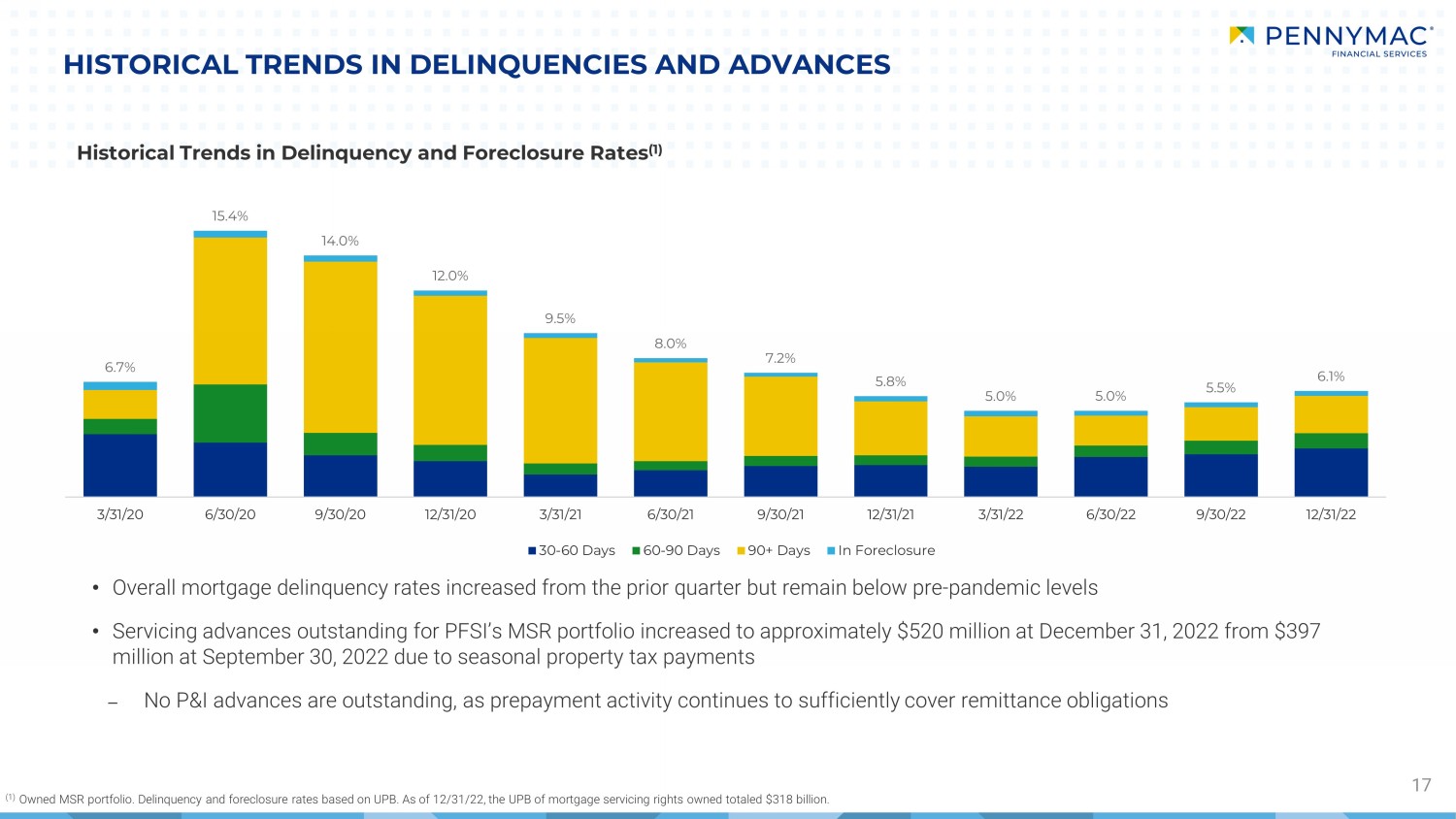 ($58.4) $237.2 $82.6 ($37.7) ($164.7) ($72.9) $106.5 $38.6 ($9.0) 4Q21 3Q22 4Q22 MSR fair value change before recognition of realization of cash flows Hedging and related gains (declines) Production pretax income 16 HEDGING APPROACH MODERATES THE VOLATILITY OF PFSI’S RESULTS MSR Valuation Changes and Offsets ($ in millions) • PFSI seeks to moderate the impact of interest rate changes on the fair value of its MSR asset through a comprehensive hedge strategy that also considers production - related income • In 4Q22, MSR fair value increased slightly (1) – Realized prepayment speeds were lower than expected – E xpectations for lower prepayment activity in the future • Largely o ffset by hedging and other losses – Primarily driven by hedge costs and higher interest rates (1) Before recognition of realization of cash flows