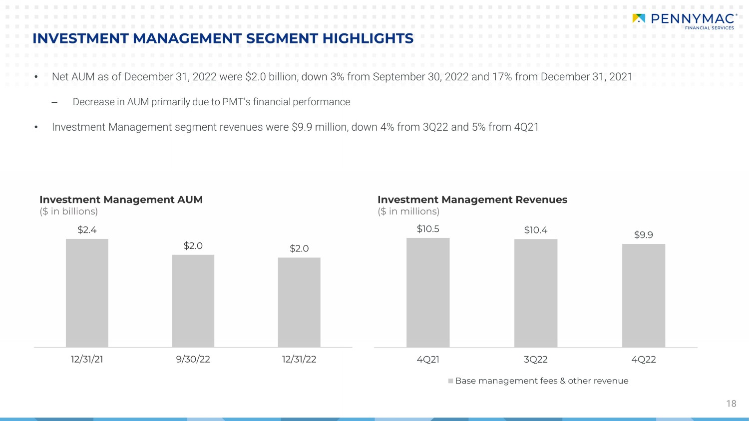 6.7% 15.4% 14.0% 12.0% 9.5% 8.0% 7.2% 5.8% 5.0% 5.0% 5.5% 6.1% 3/31/20 6/30/20 9/30/20 12/31/20 3/31/21 6/30/21 9/30/21 12/31/21 3/31/22 6/30/22 9/30/22 12/31/22 30-60 Days 60-90 Days 90+ Days In Foreclosure • Overall mortgage delinquency rates increased from the prior quarter but remain below pre - pandemic levels • Servicing advances outstanding for PFSI’s MSR portfolio increased to approximately $520 million at December 31, 2022 from $397 million at September 30, 2022 due to seasonal property tax payments – No P&I advances are outstanding, as prepayment activity continues to sufficiently cover remittance obligations HISTORICAL TRENDS IN DELINQUENCIES AND ADVANCES 17 Historical Trends in Delinquency and Foreclosure Rates (1) (1) Owned MSR portfolio. Delinquency and foreclosure rates based on UPB. As of 12/31/22, the UPB of mortgage servicing rights own ed totaled $318 billion.