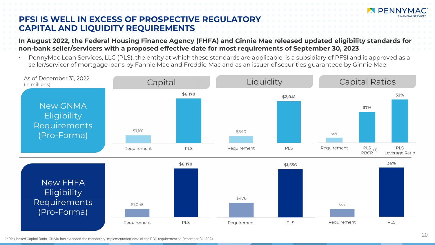 In August 2022, the Federal Housing Finance Agency (FHFA) and Ginnie Mae released updated eligibility standards for non - bank seller/servicers with a proposed effective date for most requirements of September 30, 2023 • PennyMac Loan Services, LLC (PLS), the entity at which these standards are applicable, is a subsidiary of PFSI and is approve d a s a seller/servicer of mortgage loans by Fannie Mae and Freddie Mac and as an issuer of securities guaranteed by Ginnie Mae PFSI IS WELL IN EXCESS OF PROSPECTIVE REGULATORY CAPITAL AND LIQUIDITY REQUIREMENTS 20 New GNMA Eligibility Requirements (Pro - Forma) New FHFA Eligibility Requirements (Pro - Forma) Capital Liquidity Capital Ratios (1) Risk - based Capital Ratio. GNMA has extended the mandatory implementation date of the RBC requirement to December 31, 2024. As of Decem ber 31, 2022 (in millions) (1) 6% 36% Requirement PLS 6% 37% 52% Requirement PLS RBCR PLS Leverage Ratio $340 $2,041 Requirement PLS $1,045 $6,170 Requirement PLS $1,101 $6,170 Requirement PLS $476 $1,556 Requirement PLS