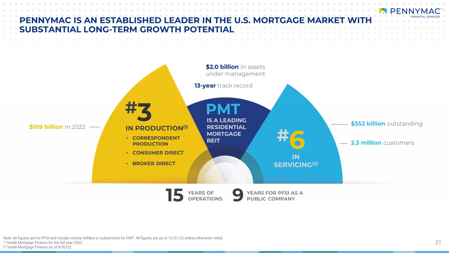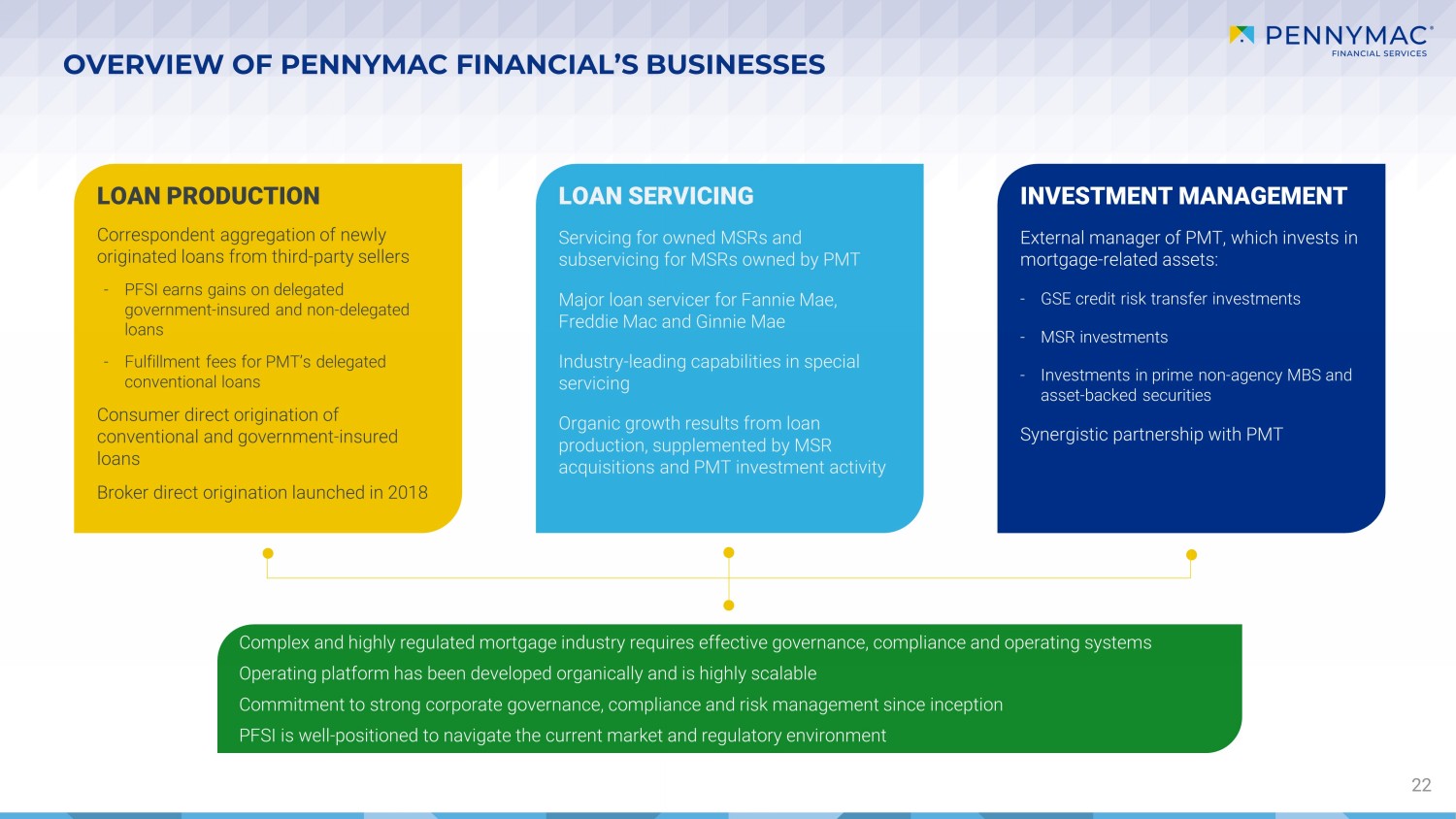 21 PENNYMAC IS AN ESTABLISHED LEADER IN THE U.S. MORTGAGE MARKET WITH SUBSTANTIAL LONG - TERM GROWTH POTENTIAL $552 billion outstanding IN SER VIC ING (2) YEARS FOR PFSI AS A PUBLIC COMPANY 9 15 YEARS OF OPERATIONS PMT # 3 • CORRESPONDENT PRODUCTION • CONSUMER DIRECT • BROKER DIRECT IN PRODUCTION (1) IS A LEADING RESIDENTIAL MORTGAGE REIT # 6 Note: All figures are for PFSI and include volume fulfilled or subserviced for PMT. All figures are as of 12/31/22 unless oth erw ise noted. (1) Inside Mortgage Finance for the full year 2022 (2) Inside Mortgage Finance as of 9/30/22 $2.0 billion in assets under management 13 - year track record 2.3 million customers $109 billion in 2022