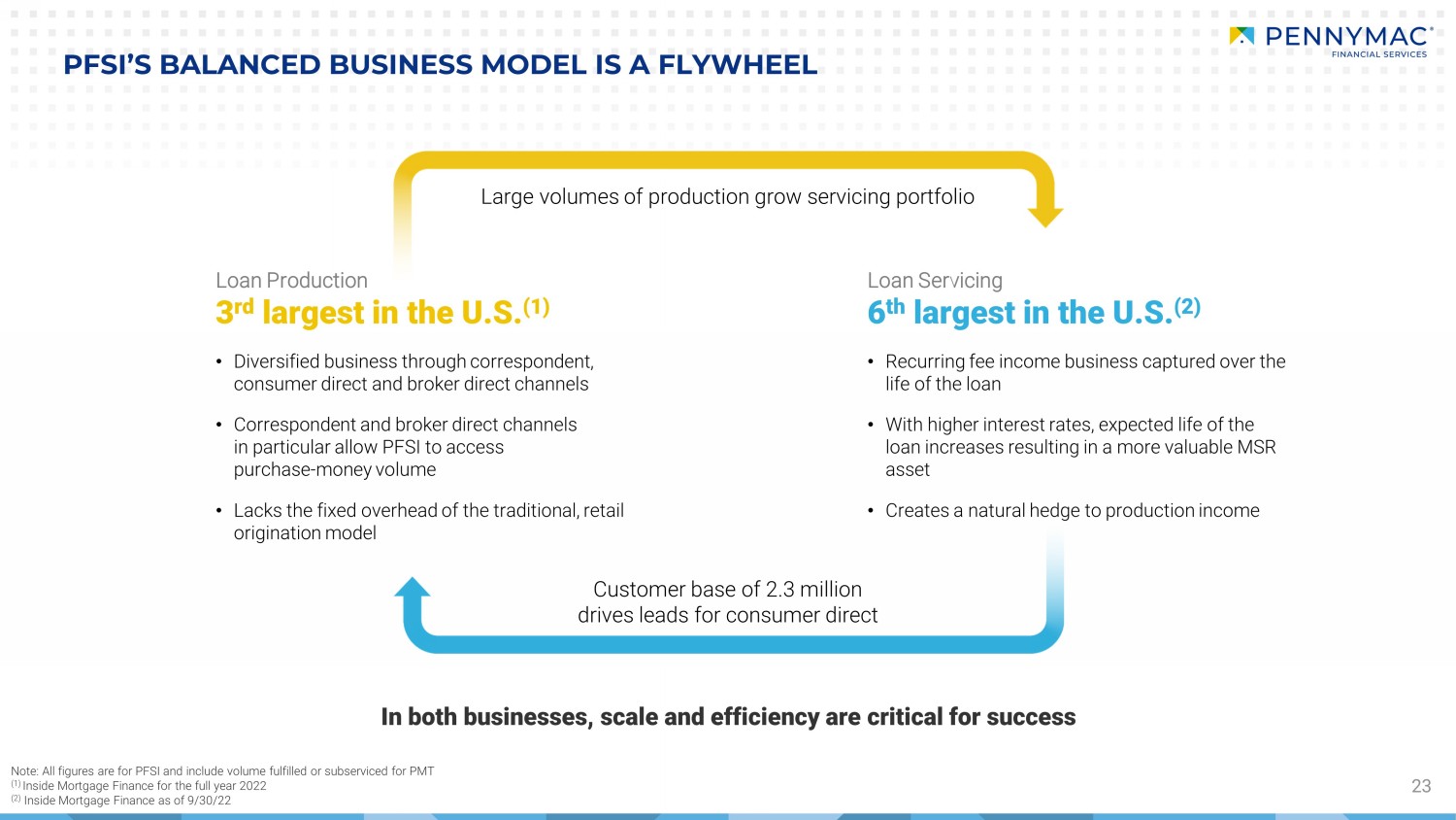OVERVIEW OF PENNYMAC FINANCIAL’S BUSINESSES 22 LOAN PRODUCTION Correspondent aggregation of newly originated loans from third - party sellers - PFSI earns gains on delegated government - insured and non - delegated loans - Fulfillment fees for PMT’s delegated conventional loans Consumer direct origination of conventional and government - insured loans Broker direct origination launched in 2018 LOAN SERVICING Servicing for owned MSRs and subservicing for MSRs owned by PMT Major loan servicer for Fannie Mae, Freddie Mac and Ginnie Mae Industry - leading capabilities in special servicing Organic growth results from loan production, supplemented by MSR acquisitions and PMT investment activity INVESTMENT MANAGEMENT External manager of PMT, which invests in mortgage - related assets: - GSE credit risk transfer investments - MSR investments - Investments in prime non - agency MBS and asset - backed securities Synergistic partnership with PMT Complex and highly regulated mortgage industry requires effective governance, compliance and operating systems Operating platform has been developed organically and is highly scalable Commitment to strong corporate governance, compliance and risk management since inception PFSI is well - positioned to navigate the current market and regulatory environment