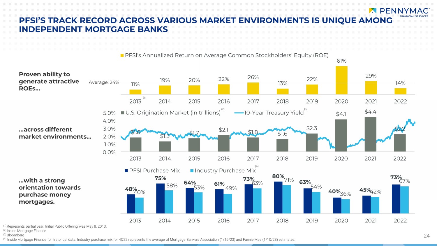 23 PFSI’S BALANCED BUSINESS MODEL IS A FLYWHEEL • Diversified business through correspondent, consumer direct and broker direct channels • Correspondent and broker direct channels in particular allow PFSI to access purchase - money volume • Lacks the fixed overhead of the traditional, retail origination model • Recurring fee income business captured over the life of the loan • With higher interest rates, expected life of the loan increases resulting in a more valuable MSR asset • Creates a natural hedge to production income Customer base of 2.3 million drives leads for consumer direct Large volumes of production grow servicing portfolio Loan Production 3 rd largest in the U.S. (1) Loan Servicing 6 th largest in the U.S. (2) In both businesses, scale and efficiency are critical for success Note: All figures are for PFSI and include volume fulfilled or subserviced for PMT (1) Inside Mortgage Finance for the full year 2022 (2) Inside Mortgage Finance as of 9/30/22