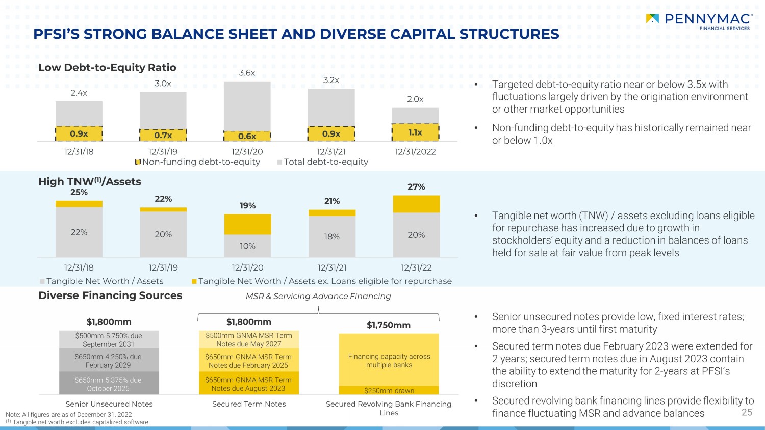 48% 75% 64% 61% 73% 80% 63% 40% 45% 73% 40% 58% 53% 49% 63% 71% 54% 36% 42% 67% 2013 2014 2015 2016 2017 2018 2019 2020 2021 2022 PFSI Purchase Mix Industry Purchase Mix 0.0% 1.0% 2.0% 3.0% 4.0% 5.0% 10-Year Treasury Yield 11% 19% 20% 22% 26% 13% 22% 61% 29% 14% 2013 2014 2015 2016 2017 2018 2019 2020 2021 2022 PFSI's Annualized Return on Average Common Stockholders' Equity (ROE) Proven ability to generate attractive ROEs… 24 PFSI’S TRACK RECORD ACROSS VARIOUS MARKET ENVIRONMENTS IS UNIQUE AMONG INDEPENDENT MORTGAGE BANKS …across different market environments… …with a strong orientation towards purchase money mortgages. (1) Represents partial year. Initial Public Offering was May 8, 2013. (2) Inside Mortgage Finance (3) Bloomberg (4) Inside Mortgage Finance for historical data. Industry purchase mix for 4 Q22 represents the average of Mortgage Bankers Association (1/19/23 ) and Fannie Mae ( 1/10/23) estimates . (1) (2) (3) (4) Average: 24% $1.8 $1.3 $1.7 $2.1 $1.8 $1.6 $2.3 $4.1 $4.4 $2.2 2013 2014 2015 2016 2017 2018 2019 2020 2021 2022 U.S. Origination Market (in trillions)