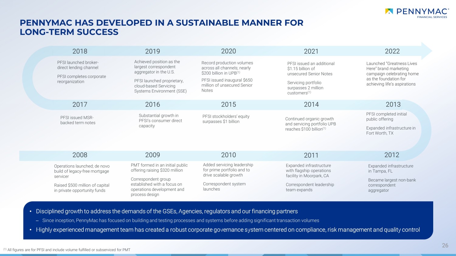 $1,800mm $1,800mm $1,750mm Senior Unsecured Notes Secured Term Notes Secured Revolving Bank Financing Lines $500mm GNMA MSR Term Notes due May 2027 PFSI’S STRONG BALANCE SHEET AND DIVERSE CAPITAL STRUCTURES 25 Low Debt - to - Equity Ratio Diverse Financing Sources High TNW (1) /Assets • Tangible net worth (TNW) / assets excluding loans eligible for repurchase has increased due to growth in stockholders’ equity and a reduction in balances of loans held for sale at fair value from peak levels $650mm GNMA MSR Term Notes due February 2025 $650mm GNMA MSR Term Notes due August 2023 $500mm 5.750% due September 2031 $650mm 4.250% due February 2029 $650mm 5.375% due October 2025 • Targeted debt - to - equity ratio near or below 3.5x with fluctuations largely driven by the origination environment or other market opportunities • Non - funding debt - to - equity has historically remained near or below 1.0x • Senior unsecured notes provide low, fixed interest rates; more than 3 - years until first maturity • Secured term notes due February 2023 were extended for 2 years; secured term notes due in August 2023 contain the ability to extend the maturity for 2 - years at PFSI’s discretion • Secured revolving bank financing lines provide flexibility to finance fluctuating MSR and advance balances MSR & Servicing Advance Financing Financing capacity across multiple banks Note: All figures are as of December 31, 2022 (1) Tangible net worth excludes capitalized software $ 250 mm drawn 22% 20% 10% 18% 20% 25% 22% 19% 21% 27% 12/31/18 12/31/19 12/31/20 12/31/21 12/31/22 Tangible Net Worth / Assets Tangible Net Worth / Assets ex. Loans eligible for repurchase 0.9x 0.7x 0.6x 0.9x 1.1x 2.4x 3.0x 3.6x 3.2x 2.0x 12/31/18 12/31/19 12/31/20 12/31/21 12/31/2022 Non-funding debt-to-equity Total debt-to-equity