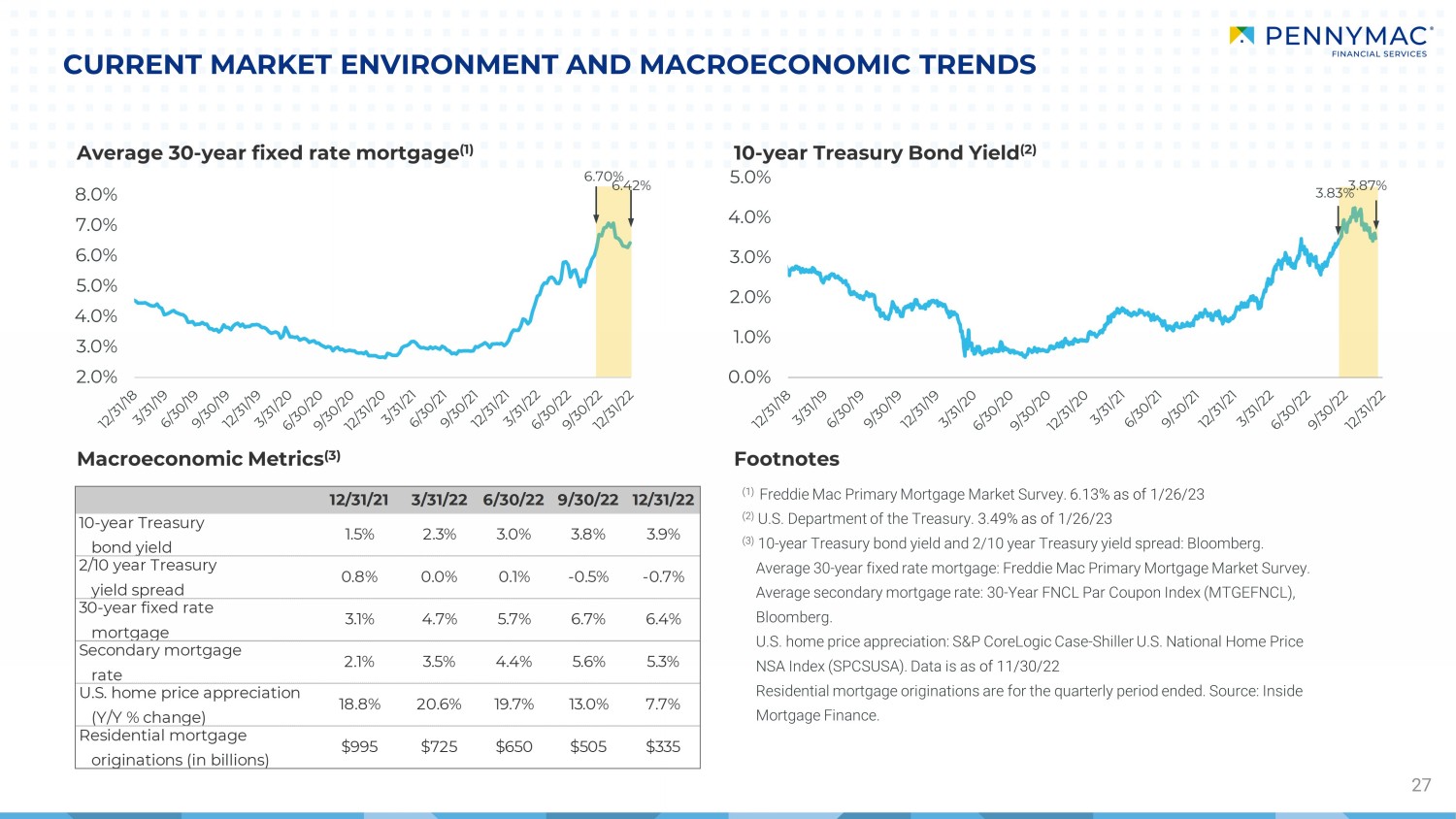 PENNYMAC HAS DEVELOPED IN A SUSTAINABLE MANNER FOR LONG - TERM SUCCESS 26 2008 2009 2010 2011 2012 2013 2014 2015 2016 2017 2018 2019 2020 2021 Operations launched; de novo build of legacy - free mortgage servicer Raised $500 million of capital in private opportunity funds PMT formed in an initial public offering raising $320 million Correspondent group established with a focus on operations development and process design Added servicing leadership for prime portfolio and to drive scalable growth Correspondent system launches Expanded infrastructure with flagship operations facility in Moorpark, CA Correspondent leadership team expands Expanded infrastructure in Tampa, FL Became largest non - bank correspondent aggregator PFSI completed initial public offering Expanded infrastructure in Fort Worth, TX Continued organic growth and servicing portfolio UPB reaches $100 billion (1) PFSI stockholders’ equity surpasses $1 billion Substantial growth in PFSI’s consumer direct capacity PFSI issued MSR - backed term notes PFSI launched broker - direct lending channel PFSI completes corporate reorganization Achieved position as the largest correspondent aggregator in the U.S. PFSI launched proprietary, cloud - based Servicing Systems Environment (SSE) Record production volumes across all channels; nearly $200 billion in UPB (1) PFSI issued inaugural $650 million of unsecured Senior Notes PFSI issued an additional $1.15 billion of unsecured Senior Notes Servicing portfolio surpasses 2 million customers (1) (1) All figures are for PFSI and include volume fulfilled or subserviced for PMT • Disciplined growth to address the demands of the GSEs, Agencies, regulators and our financing partners ‒ Since inception, PennyMac has focused on building and testing processes and systems before adding significant transaction vol ume s • Highly experienced management team has created a robust corporate governance system centered on compliance, risk management a nd quality control 2022 Launched “Greatness Lives Here” brand marketing campaign celebrating home as the foundation for achieving life’s aspirations