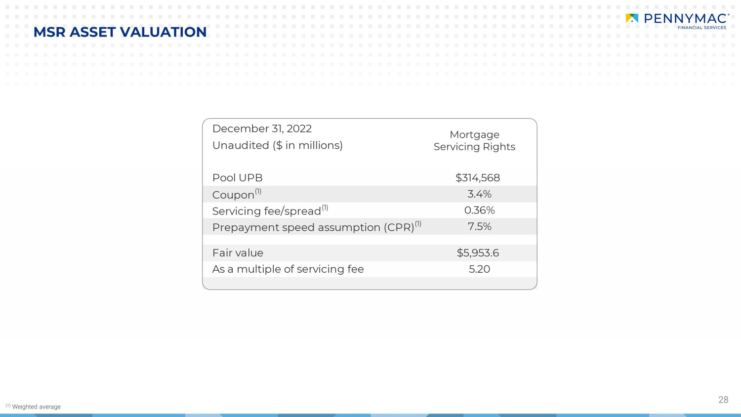 2.0% 3.0% 4.0% 5.0% 6.0% 7.0% 8.0% 0.0% 1.0% 2.0% 3.0% 4.0% 5.0% Average 30 - year fixed rate mortgage (1) 6.70% 3.83% CURRENT MARKET ENVIRONMENT AND MACROECONOMIC TRENDS 27 Macroeconomic Metrics (3) Footnotes (1) Freddie Mac Primary Mortgage Market Survey. 6.13% as of 1/26/23 (2) U.S. Department of the Treasury. 3.49% as of 1/26/23 (3) 10 - year Treasury bond yield and 2/10 year Treasury yield spread: Bloomberg. Average 30 - year fixed rate mortgage: Freddie Mac Primary Mortgage Market Survey. Average secondary mortgage rate: 30 - Year FNCL Par Coupon Index (MTGEFNCL), Bloomberg. U.S. home price appreciation: S&P CoreLogic Case - Shiller U.S. National Home Price NSA Index (SPCSUSA). Data is as of 11/30/22 Residential mortgage originations are for the quarterly period ended. Source: Inside Mortgage Finance. 10 - year Treasury Bond Yield (2) 3.87% 6.42% 12/31/21 3/31/22 6/30/22 9/30/22 12/31/22 10-year Treasury bond yield 1.5% 2.3% 3.0% 3.8% 3.9% 2/10 year Treasury yield spread 0.8% 0.0% 0.1% -0.5% -0.7% 30-year fixed rate mortgage 3.1% 4.7% 5.7% 6.7% 6.4% Secondary mortgage rate 2.1% 3.5% 4.4% 5.6% 5.3% U.S. home price appreciation (Y/Y % change) 18.8% 20.6% 19.7% 13.0% 7.7% Residential mortgage originations (in billions) $995 $725 $650 $505 $335
