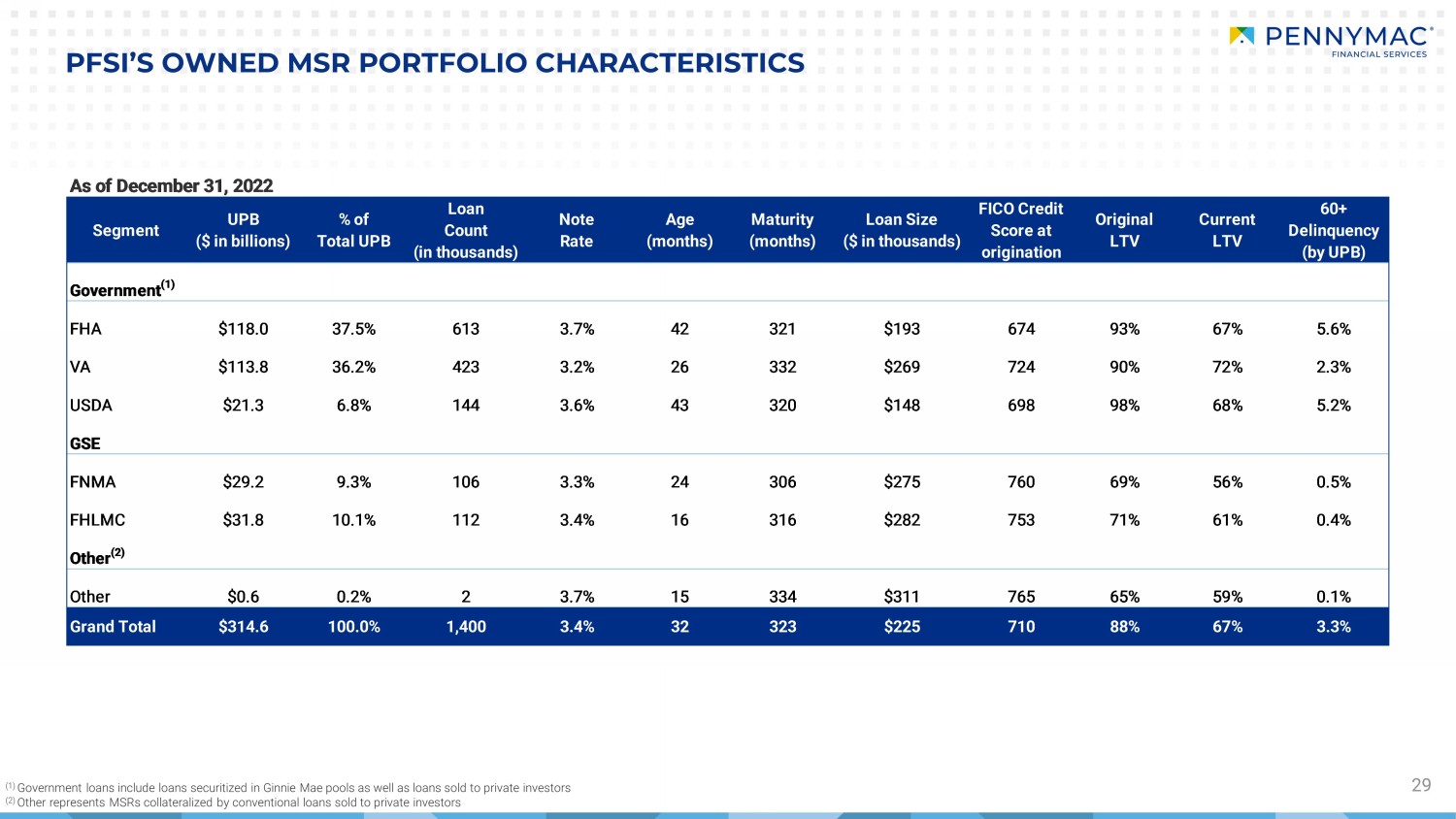 28 MSR ASSET VALUATION (1) Weighted average Mortgage Servicing Rights Pool UPB $314,568 Coupon (1) 3.4% Servicing fee/spread (1) 0.36% Prepayment speed assumption (CPR) (1) 7.5% Fair value $5,953.6 As a multiple of servicing fee 5.20 December 31, 2022 Unaudited ($ in millions)