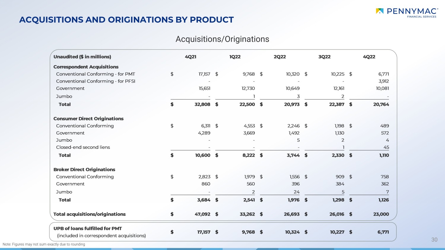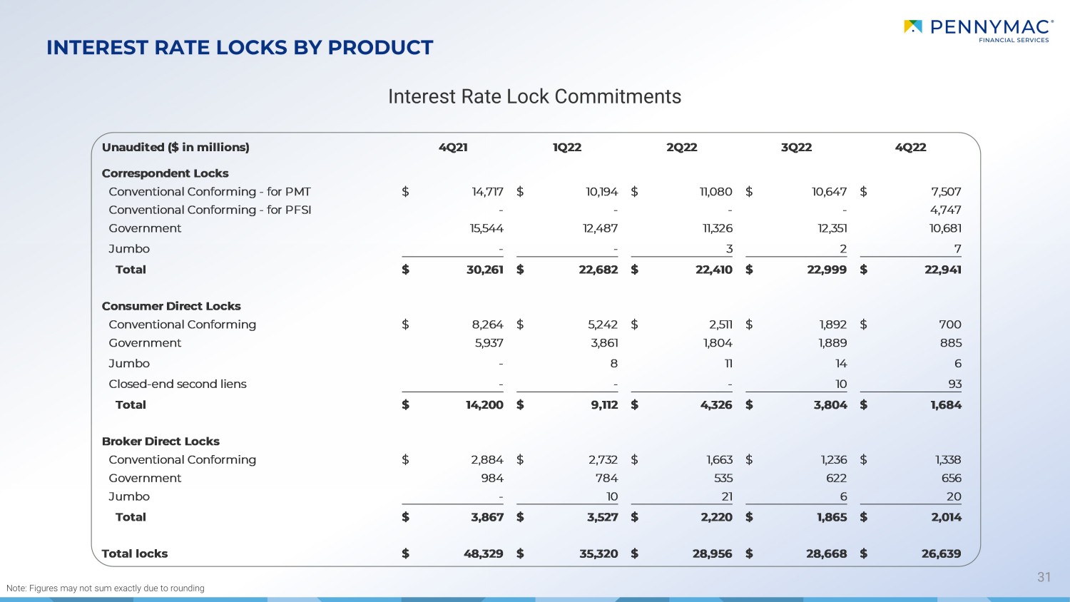 ACQUISITIONS AND ORIGINATIONS BY PRODUCT 30 Acquisitions/Originations Note: Figures may not sum exactly due to rounding Unaudited ($ in millions) 4Q21 1Q22 2Q22 3Q22 4Q22 Correspondent Acquisitions Conventional Conforming - for PMT 17,157$ 9,768$ 10,320$ 10,225$ 6,771$ Conventional Conforming - for PFSI - - - - 3,912 Government 15,651 12,730 10,649 12,161 10,081 Jumbo - 1 3 2 - Total 32,808$ 22,500$ 20,973$ 22,387$ 20,764$ Consumer Direct Originations Conventional Conforming 6,311$ 4,553$ 2,246$ 1,198$ 489$ Government 4,289 3,669 1,492 1,130 572 Jumbo - - 5 2 4 Closed-end second liens - - - 1 45 Total 10,600$ 8,222$ 3,744$ 2,330$ 1,110$ Broker Direct Originations Conventional Conforming 2,823$ 1,979$ 1,556$ 909$ 758$ Government 860 560 396 384 362 Jumbo - 2 24 5 7 Total 3,684$ 2,541$ 1,976$ 1,298$ 1,126$ Total acquisitions/originations 47,092$ 33,262$ 26,693$ 26,016$ 23,000$ UPB of loans fulfilled for PMT (included in correspondent acquisitions) 17,157$ 9,768$ 10,324$ 10,227$ 6,771$