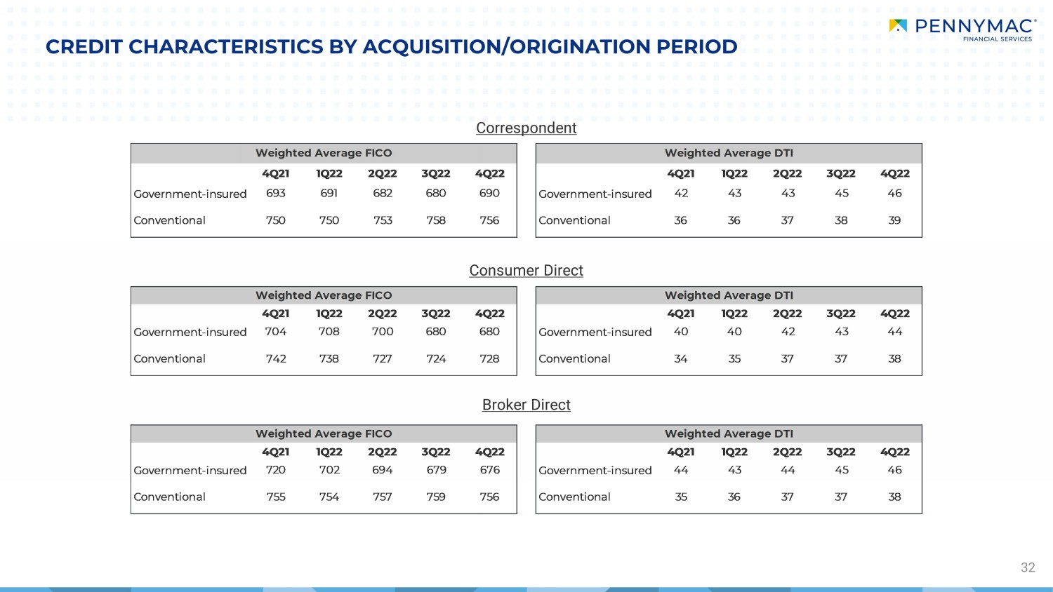 INTEREST RATE LOCKS BY PRODUCT 31 Note: Figures may not sum exactly due to rounding Interest Rate Lock Commitments Unaudited ($ in millions) 4Q21 1Q22 2Q22 3Q22 4Q22 Correspondent Locks Conventional Conforming - for PMT 14,717$ 10,194$ 11,080$ 10,647$ 7,507$ Conventional Conforming - for PFSI - - - - 4,747 Government 15,544 12,487 11,326 12,351 10,681 Jumbo - - 3 2 7 Total 30,261$ 22,682$ 22,410$ 22,999$ 22,941$ Consumer Direct Locks Conventional Conforming 8,264$ 5,242$ 2,511$ 1,892$ 700$ Government 5,937 3,861 1,804 1,889 885 Jumbo - 8 11 14 6 Closed-end second liens - - - 10 93 Total 14,200$ 9,112$ 4,326$ 3,804$ 1,684$ Broker Direct Locks Conventional Conforming 2,884$ 2,732$ 1,663$ 1,236$ 1,338$ Government 984 784 535 622 656 Jumbo - 10 21 6 20 Total 3,867$ 3,527$ 2,220$ 1,865$ 2,014$ Total locks 48,329$ 35,320$ 28,956$ 28,668$ 26,639$