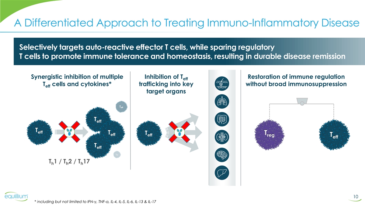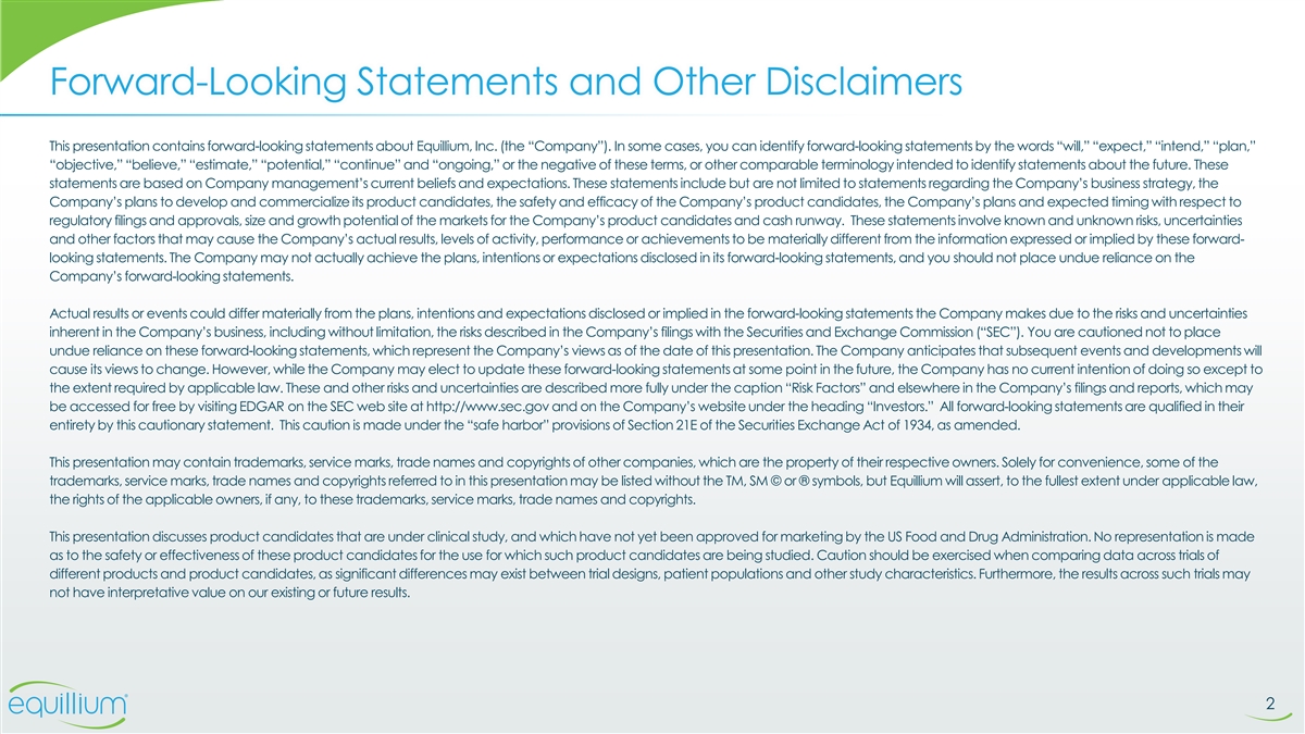 Forward-Looking Statements and Other Disclaimers This presentation contains forward-looking statements about Equillium, Inc. (the “Company”). In some cases, you can identify forward-looking statements by the words “will,” “expect,” “intend,” “plan,” “objective,” “believe,” “estimate,” “potential,” “continue” and “ongoing,” or the negative of these terms, or other comparable terminology intended to identify statements about the future. These statements are based on Company management’s current beliefs and expectations. These statements include but are not limited to statements regarding the Company’s business strategy, the Company’s plans to develop and commercialize its product candidates, the safety and efficacy of the Company’s product candidates, the Company’s plans and expected timing with respect to regulatory filings and approvals, size and growth potential of the markets for the Company’s product candidates and cash runway. These statements involve known and unknown risks, uncertainties and other factors that may cause the Company’s actual results, levels of activity, performance or achievements to be materially different from the information expressed or implied by these forward- looking statements. The Company may not actually achieve the plans, intentions or expectations disclosed in its forward-looking statements, and you should not place undue reliance on the Company’s forward-looking statements. Actual results or events could differ materially from the plans, intentions and expectations disclosed or implied in the forward-looking statements the Company makes due to the risks and uncertainties inherent in the Company’s business, including without limitation, the risks described in the Company’s filings with the Securities and Exchange Commission (“SEC”). You are cautioned not to place undue reliance on these forward-looking statements, which represent the Company’s views as of the date of this presentation. The Company anticipates that subsequent events and developments will cause its views to change. However, while the Company may elect to update these forward-looking statements at some point in the future, the Company has no current intention of doing so except to the extent required by applicable law. These and other risks and uncertainties are described more fully under the caption “Risk Factors” and elsewhere in the Company’s filings and reports, which may be accessed for free by visiting EDGAR on the SEC web site at http://www.sec.gov and on the Company’s website under the heading “Investors.” All forward-looking statements are qualified in their entirety by this cautionary statement. This caution is made under the “safe harbor” provisions of Section 21E of the Securities Exchange Act of 1934, as amended. This presentation may contain trademarks, service marks, trade names and copyrights of other companies, which are the property of their respective owners. Solely for convenience, some of the trademarks, service marks, trade names and copyrights referred to in this presentation may be listed without the TM, SM © or ® symbols, but Equillium will assert, to the fullest extent under applicable law, the rights of the applicable owners, if any, to these trademarks, service marks, trade names and copyrights. This presentation discusses product candidates that are under clinical study, and which have not yet been approved for marketing by the US Food and Drug Administration. No representation is made as to the safety or effectiveness of these product candidates for the use for which such product candidates are being studied. Caution should be exercised when comparing data across trials of different products and product candidates, as significant differences may exist between trial designs, patient populations and other study characteristics. Furthermore, the results across such trials may not have interpretative value on our existing or future results. 2