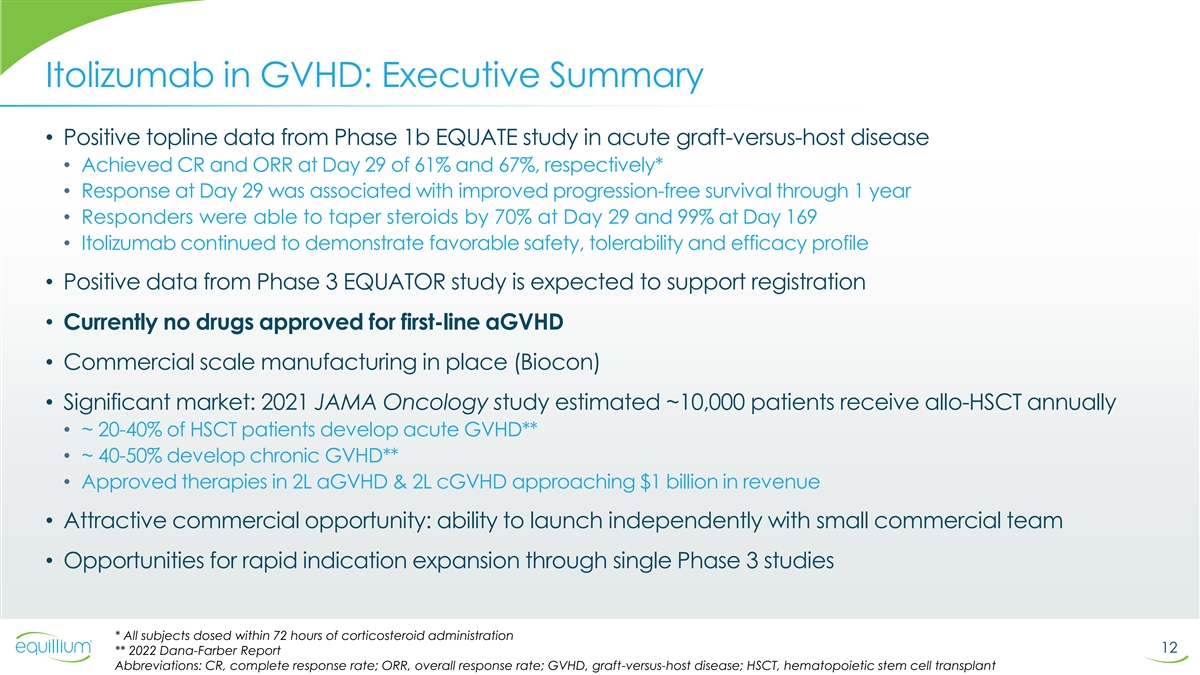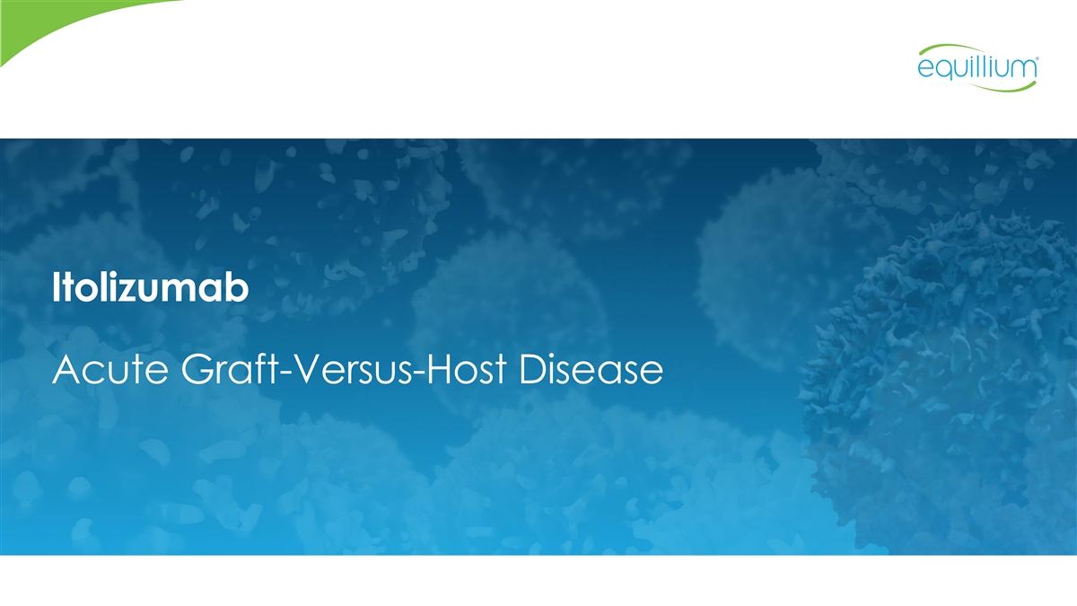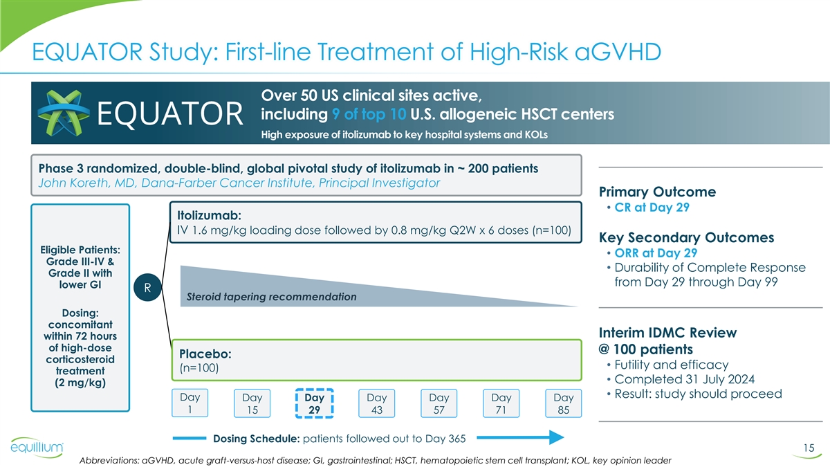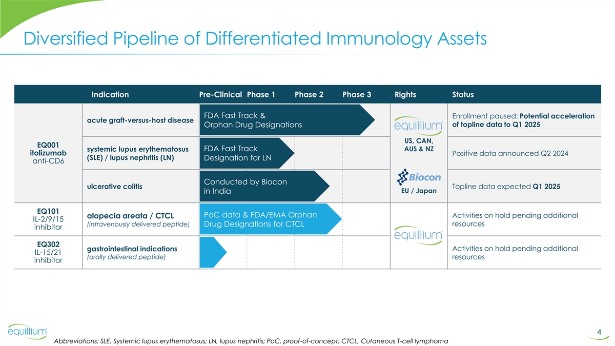 Equillium Retains Rights to Itolizumab Ono provided substantial non-dilutive funding for itolizumab through two key milestones: 1. Positive interim data analysis in Phase 3 EQUATOR study of first-line aGVHD: • “Study should proceed” recommendation from the IDMC 2. Positive PoC data in Phase 1b EQUALISE study of lupus nephritis: • Clinically meaningful, deep responses in highly proteinuric patients Ono decision to allow itolizumab option to expire due to strategic business reasons Itolizumab approaching two major data events: 1. Topline data from Phase 3 EQUATOR study in aGVHD: potential acceleration to Q1 2025 2. Topline data from Phase 2 ulcerative colitis study recently completed in India: expected Q1 2025 Equillium expects that its existing cash can fund operations into Q4 2025, based on recent operational changes and assuming acceleration of EQUATOR study completion: reduced enrollment to ~150 and unblinding after primary and key secondary endpoints at Day 29 (CR & ORR, respectively) Equillium intends to meet with the FDA to review the EQUATOR study during Q1 2025 3 Abbreviations: aGVHD, acute graft-versus-host disease; CR, complete response; ORR, overall response rate; PoC, proof of concept; IDMC, independent monitoring data committee