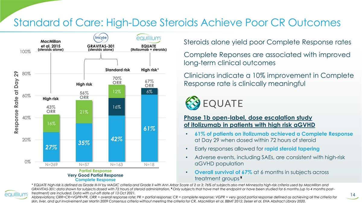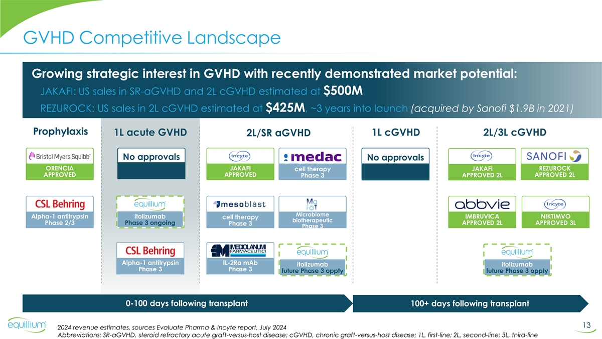 Itolizumab in GVHD: Executive Summary • Positive topline data from Phase 1b EQUATE study in acute graft-versus-host disease • Achieved CR and ORR at Day 29 of 61% and 67%, respectively* • Response at Day 29 was associated with improved progression-free survival through 1 year • Responders were able to taper steroids by 70% at Day 29 and 99% at Day 169 • Itolizumab continued to demonstrate favorable safety, tolerability and efficacy profile • Positive data from Phase 3 EQUATOR study is expected to support registration • Currently no drugs approved for first-line aGVHD • Commercial scale manufacturing in place (Biocon) • Significant market: 2021 JAMA Oncology study estimated ~10,000 patients receive allo-HSCT annually • ~ 20-40% of HSCT patients develop acute GVHD** • ~ 40-50% develop chronic GVHD** • Approved therapies in 2L aGVHD & 2L cGVHD approaching $1 billion in revenue • Attractive commercial opportunity: ability to launch independently with small commercial team • Opportunities for rapid indication expansion through single Phase 3 studies * All subjects dosed within 72 hours of corticosteroid administration 12 ** 2022 Dana-Farber Report Abbreviations: CR, complete response rate; ORR, overall response rate; GVHD, graft-versus-host disease; HSCT, hematopoietic stem cell transplant