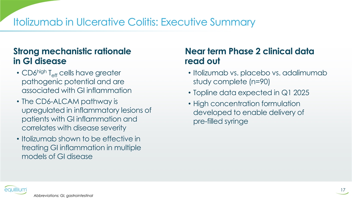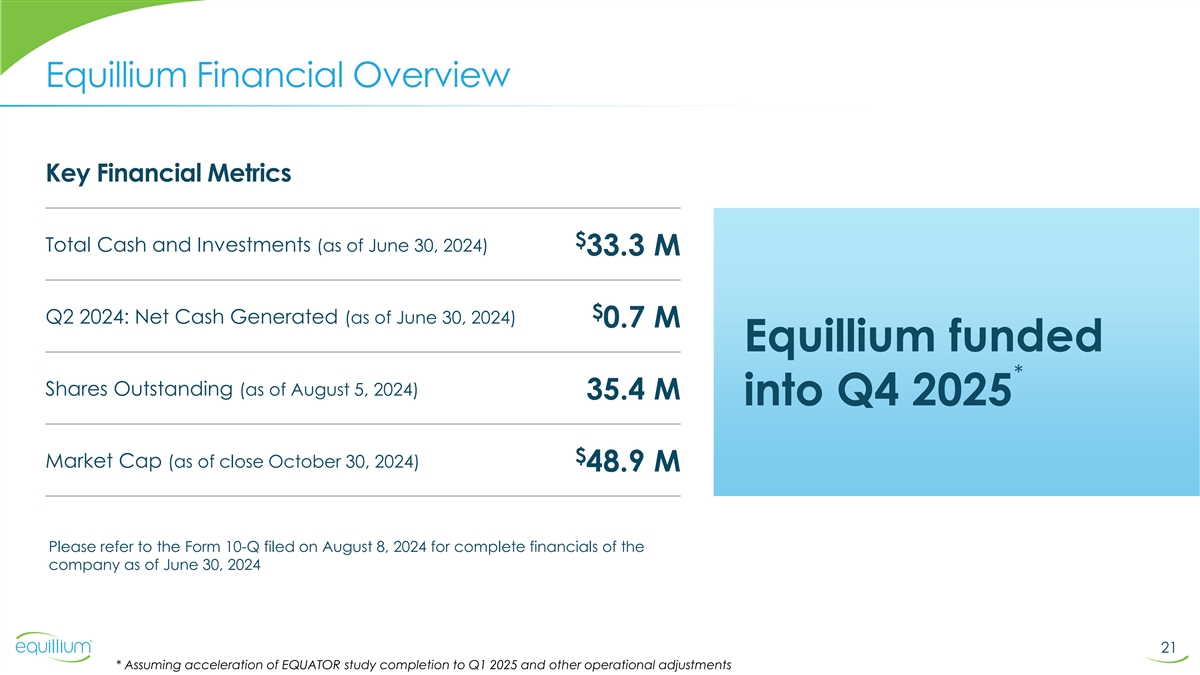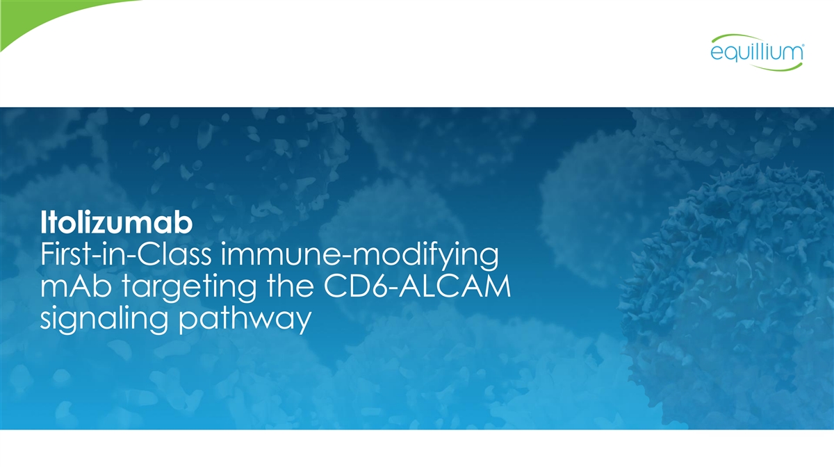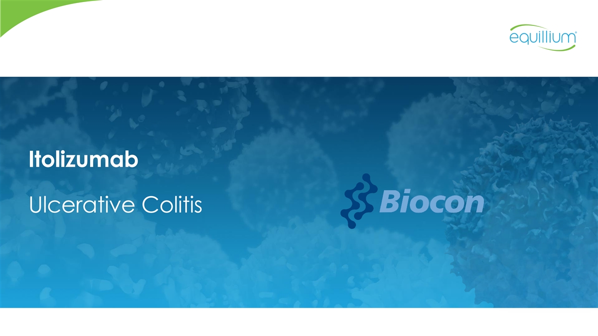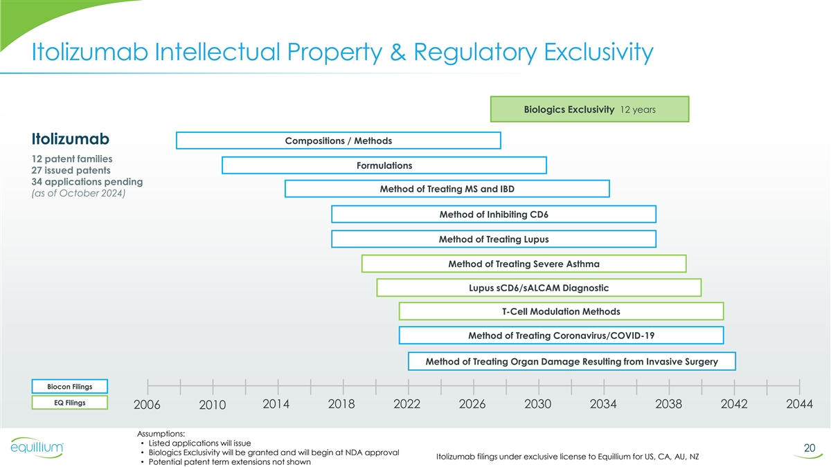 Itolizumab Intellectual Property & Regulatory Exclusivity Biologics Exclusivity 12 years Itolizumab Compositions / Methods 12 patent families Formulations 27 issued patents 34 applications pending Method of Treating MS and IBD (as of October 2024) Method of Inhibiting CD6 Method of Treating Lupus Method of Treating Severe Asthma Lupus sCD6/sALCAM Diagnostic T-Cell Modulation Methods Method of Treating Coronavirus/COVID-19 Method of Treating Organ Damage Resulting from Invasive Surgery Biocon Filings EQ Filings 2014 2018 2022 2026 2030 2034 2038 2042 2044 2006 2010 Assumptions: • Listed applications will issue 20 • Biologics Exclusivity will be granted and will begin at NDA approval Itolizumab filings under exclusive license to Equillium for US, CA, AU, NZ • Potential patent term extensions not shown
