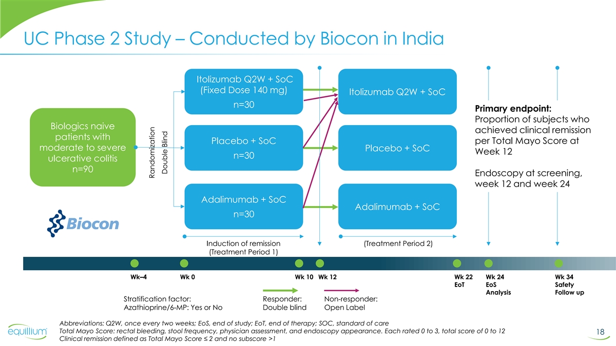 UC Phase 2 Study – Conducted by Biocon in India Itolizumab Q2W + SoC + SoC (Fixed Dose 140 mg) ltolizumab Q2W + SoC N=3 n=30 Primary endpoint: Proportion of subjects who Biologics naive achieved clinical remission patients with Placebo + SoC per Total Mayo Score at moderate to severe Placebo + SoC Week 12 n=30 ulcerative colitis n=90 Endoscopy at screening, week 12 and week 24 Adalimumab + SoC Adalimumab + SoC n=30 Induction of remission (Treatment Period 2) (Treatment Period 1) Wk–4 Wk 0 Wk 10 Wk 12 Wk 22 Wk 24 Wk 34 EoT EoS Safety Analysis Follow up Stratification factor: Responder: Non-responder: Azathioprine/6-MP: Yes or No Double blind Open Label Abbreviations: Q2W, once every two weeks; EoS, end of study; EoT, end of therapy; SOC, standard of care Total Mayo Score: rectal bleeding, stool frequency, physician assessment, and endoscopy appearance. Each rated 0 to 3, total score of 0 to 12 18 Clinical remission defined as Total Mayo Score ≤ 2 and no subscore >1 Randomization Double Blind
