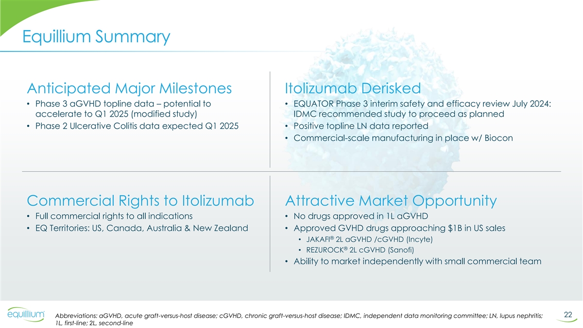 Equillium Financial Overview Key Financial Metrics $ Total Cash and Investments (as of June 30, 2024) 33.3 M $ Q2 2024: Net Cash Generated (as of June 30, 2024) 0.7 M Equillium funded * Shares Outstanding (as of August 5, 2024) 35.4 M into Q4 2025 $ Market Cap (as of close October 30, 2024) 48.9 M Please refer to the Form 10-Q filed on August 8, 2024 for complete financials of the company as of June 30, 2024 21 * Assuming acceleration of EQUATOR study completion to Q1 2025 and other operational adjustments