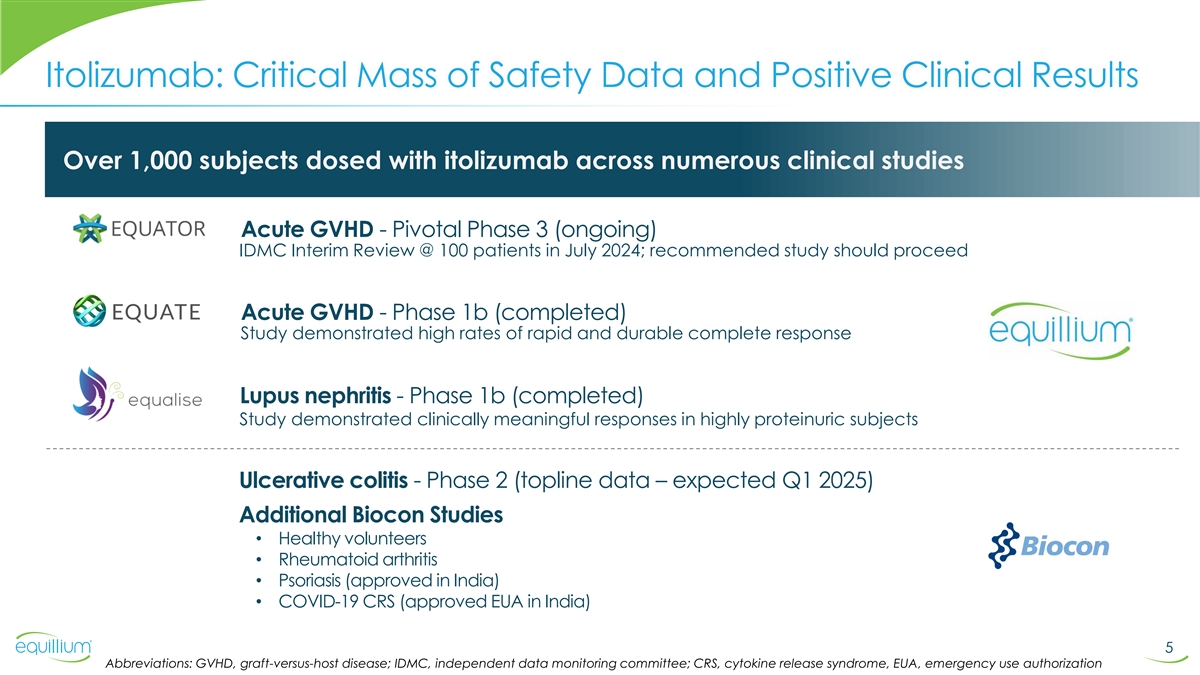 Diversified Pipeline of Differentiated Immunology Assets Indication Pre-Clinical Phase 1 Phase 2 Phase 3 Rights Status FDA Fast Track & Enrollment paused: Potential acceleration acute graft-versus-host disease of topline data to Q1 2025 Orphan Drug Designations US, CAN, EQ001 FDA Fast Track AUS & NZ systemic lupus erythematosus itolizumab Positive data announced Q2 2024 (SLE) / lupus nephritis (LN) Designation for LN anti-CD6 Conducted by Biocon ulcerative colitis Topline data expected Q1 2025 in India EU / Japan EQ101 PoC data & FDA/EMA Orphan Activities on hold pending additional alopecia areata / CTCL IL-2/9/15 resources (intravenously delivered peptide) Drug Designations for CTCL inhibitor EQ302 gastrointestinal indications Activities on hold pending additional IL-15/21 (orally delivered peptide) resources inhibitor 4 Abbreviations: SLE, Systemic lupus erythematosus; LN, lupus nephritis; PoC, proof-of-concept; CTCL, Cutaneous T-cell lymphoma