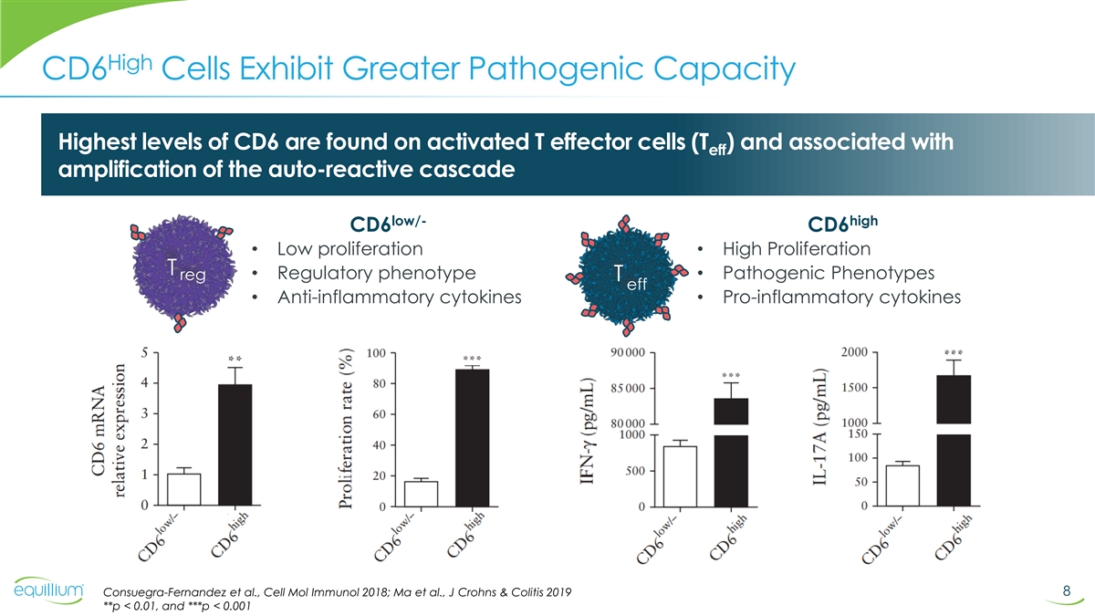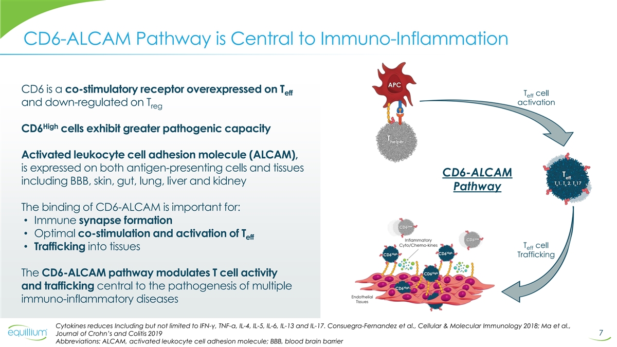 CD6-ALCAM Pathway is Central to Immuno-Inflammation CD6 is a co-stimulatory receptor overexpressed on T eff T cell eff activation and down-regulated on T reg High CD6 cells exhibit greater pathogenic capacity Activated leukocyte cell adhesion molecule (ALCAM), is expressed on both antigen-presenting cells and tissues CD6-ALCAM including BBB, skin, gut, lung, liver and kidney Pathway The binding of CD6-ALCAM is important for: • Immune synapse formation • Optimal co-stimulation and activation of T eff T cell • Trafficking into tissues eff Trafficking The CD6-ALCAM pathway modulates T cell activity and trafficking central to the pathogenesis of multiple immuno-inflammatory diseases Cytokines reduces Including but not limited to IFN-γ, TNF-α, IL-4, IL-5, IL-6, IL-13 and IL-17. Consuegra-Fernandez et al., Cellular & Molecular Immunology 2018; Ma et al., 7 Journal of Crohn’s and Colitis 2019 Abbreviations: ALCAM, activated leukocyte cell adhesion molecule; BBB, blood brain barrier