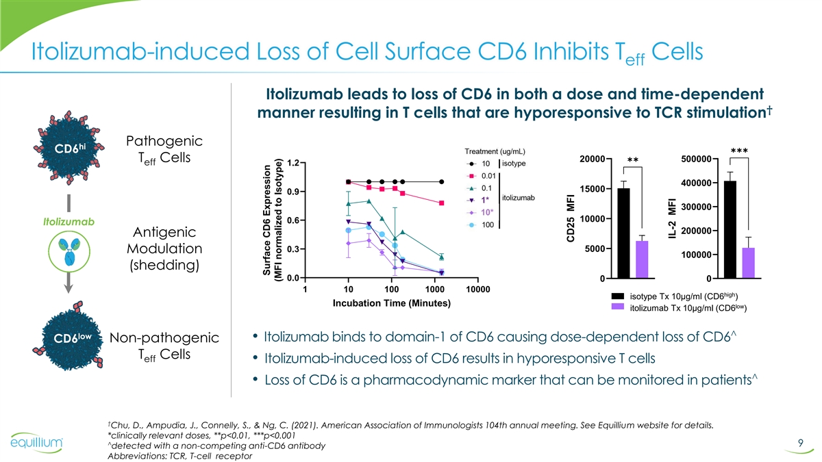 High CD6 Cells Exhibit Greater Pathogenic Capacity Highest levels of CD6 are found on activated T effector cells (T ) and associated with eff amplification of the auto-reactive cascade low/- high CD6 CD6 • Low proliferation• High Proliferation T • Regulatory phenotype• Pathogenic Phenotypes reg T eff • Anti-inflammatory cytokines• Pro-inflammatory cytokines 8 Consuegra-Fernandez et al., Cell Mol Immunol 2018; Ma et al., J Crohns & Colitis 2019 **p < 0.01, and ***p < 0.001