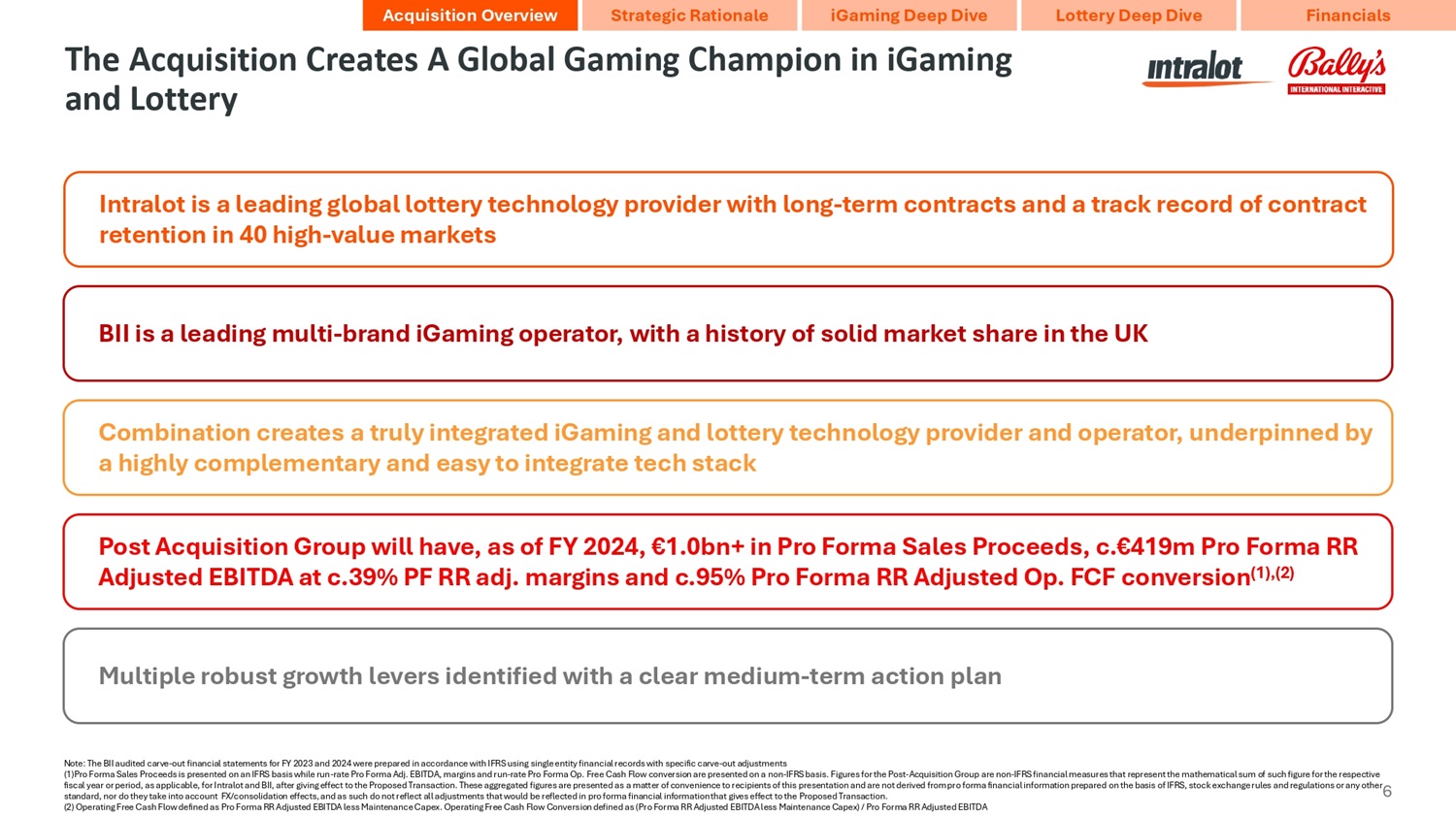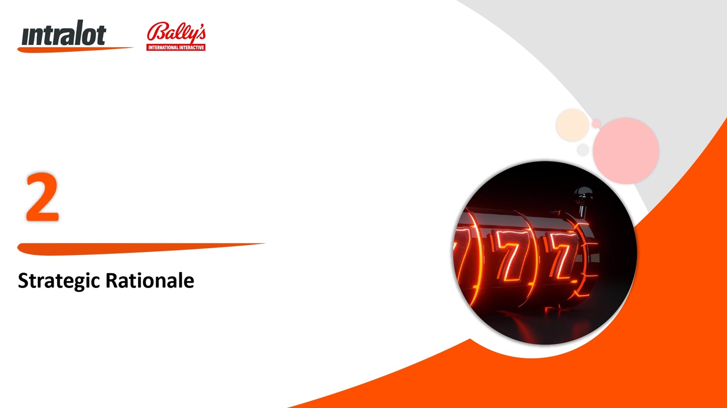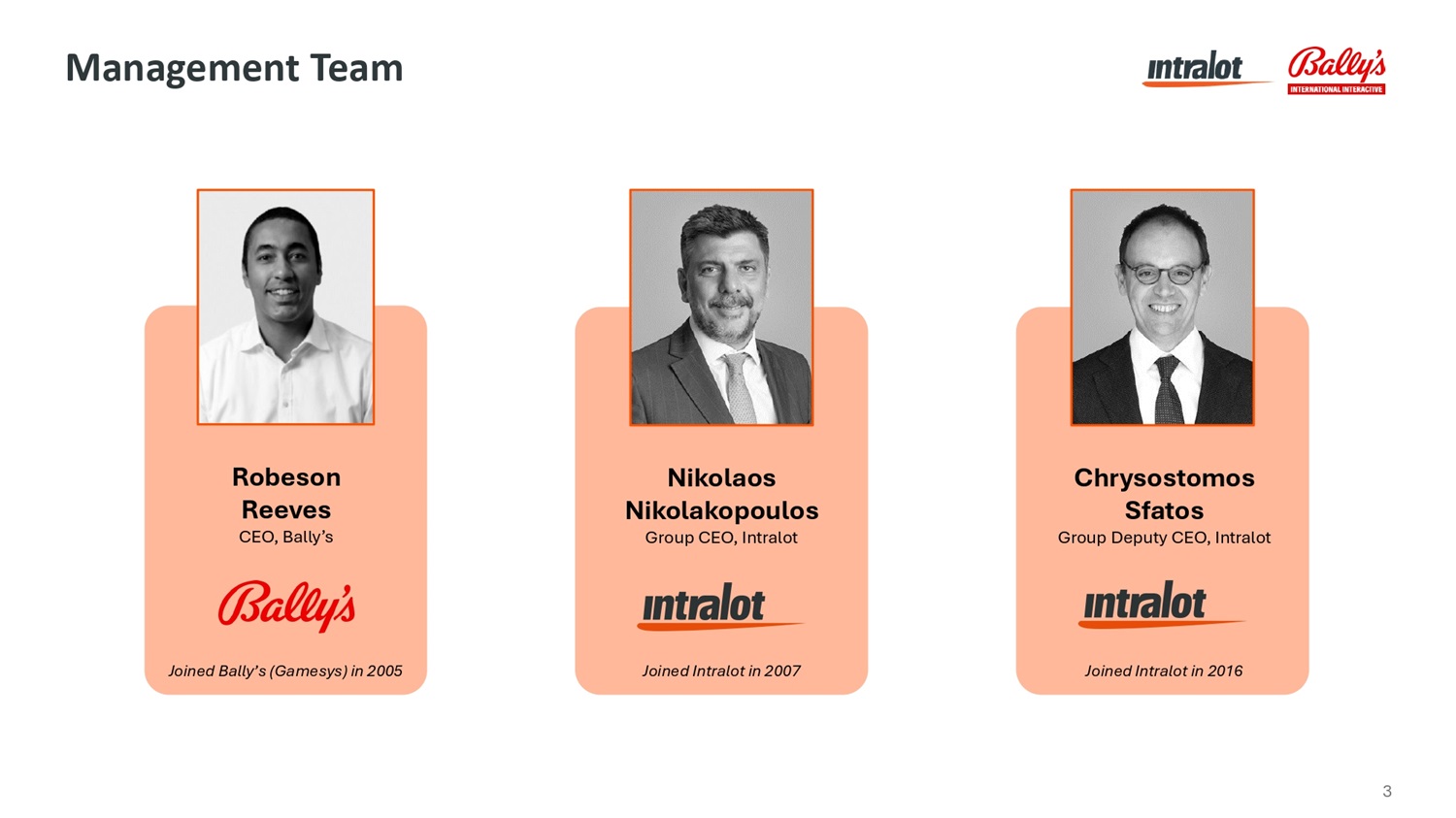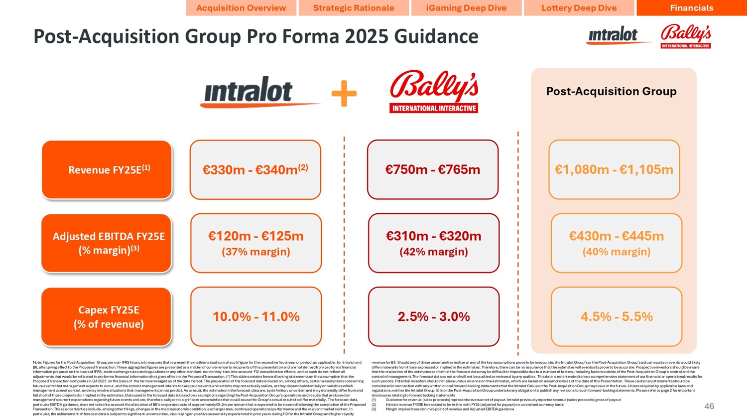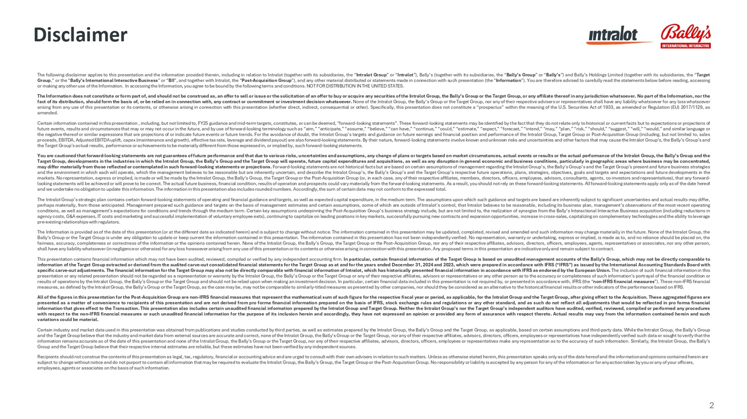 The following disclaimer applies to this presentation and the information provided therein, including in relation to Intralot (together with its subsidiaries, the “ Intralot Group ” or “ Intralot ”), Bally’s (together with its subsidiaries, the “ Bally’s Group ” or “ Bally’s ”) and Bally’s Holdings Limited (together with its subsidiaries, the “ Target Group ,” or the “ Bally’s International Interactive Business ” or “ BII ”, and together with Intralot, the “ Post - Acquisition Group ”), and any other material distributed or statements made in connection with such presentation (the “ Information ”) . You are therefore advised to carefully read the statements below before reading, accessing or making any other use of the Information . In accessing the Information, you agree to be bound by the following terms and conditions . NOT FOR DISTRIBUTION IN THE UNITED STATES . The Information does not constitute or form part of, and should not be construed as, an offer to sell or issue or the solicitation of an offer to buy or acquire any securities of the Intralot Group, the Bally’s Group or the Target Group, or any affiliate thereof in any jurisdiction whatsoever . No part of the Information, nor the fact of its distribution, should form the basis of, or be relied o n in connection with, any contract or commitment or investment decision whatsoever . None of the Intralot Group, the Bally’s Group or the Target Group, nor any of their respective advisers or representatives shall have any liability whatsoever for any loss whatsoever arising from any use of this presentation or its contents, or otherwise arising in connection with this presentation (whether direct, indirect, consequential or other) . Specifically, this presentation does not constitute a “prospectus” within the meaning of the U . S . Securities Act of 1933 , as amended or Regulation (EU) 2017 / 1129 , as amended . Certain information contained in this presentation , including, but not limited to, FY 25 guidance and mid - term targets, constitutes, or can be deemed, “forward - looking statements” . These forward - looking statements may be identified by the fact that they d o not relate only to historical or current facts but to expectations or projections of future events, results and circumstances that may or may not occur in the future, and by use of forward - looking terminology such as “aim,” “anticipate,” “assume,” “believe,” “can have,” “continue,” “could,” “estimate,” “expect,” “forecast,” “intend,” “may,” “plan,” “risk,” “should,” “suggest,” “will,” “would,” and similar language or the negative thereof or similar expressions that are projections of or indicate future events or future trends . For the avoidance of doubt, the Intralot Group’s targets and guidance on future earnings and financial position and performance of the Intralot Group, Target Group or Post - Acquisition Group (including, but not limited to, sales proceeds, EBITDA, Adjusted EBITDA uplift, capex (maintenance and growth), effective tax rate, leverage and dividend payout) are also forward - looking statements . By their nature, forward - looking statements involve known and unknown risks and uncertainties and other factors that may cause the Intralot Group’s, the Bally’s Group’s and the Target Group’s actual results, performance or achievements to be materially different from those expressed in, or implied by, such forward - looking statements . You are cautioned that forward - looking statements are not guarantees of future performance and that due to various risks, uncertainties and assumptions, any change of plans or targets based on market circumstances, actual events or results or the actual performance of the Intralot Group, the Bally’s Group and the Target Group, developments in the industries in which the Intralot Group, the Bally’s Group and the Target Group will operate, future capital expenditures and acquisitions, as well as any disruption in general economic and business conditions, particularly in geographic areas where business may be concentrated, may differ materially from those reflected or contemplated in such forward - looking statements or projections . Forward - looking statements are not historical facts but are based on certain assumptions of management regarding the Intralot Group’s, the Bally’s Group’s and the Target Group’s present and future business strategies and the environment in which each will operate, which the management believes to be reasonable but are inherently uncertain, and describe the Intralot Group’s, the Bally’s Group’s and the Target Group’s respective future operations, plans, strategies, objectives, goals and targets and expectations and future developments in the markets . No representation, express or implied, is made or will be made by the Intralot Group, the Bally’s Group, the Target Group or the Post - Acquisition Group (or, in each case, any of their respective affiliates, members, directors, officers, employees, advisors, consultants, agents, co - investors and representatives), that any forward - looking statements will be achieved or will prove to be correct . The actual future business, financial condition, results of operation and prospects could vary materially from the forward - looking statements . As a result, you should not rely on these forward - looking statements . All forward - looking statements apply only as of the date hereof and we undertake no obligation to update this information . The information in this presentation also includes rounded numbers . Accordingly, the sum of certain data may not conform to the expressed total . The Intralot Group’s strategic plan contains certain forward - looking statements of operating and financial guidance and targets, as well as expected capital expenditure, in the medium term . The assump