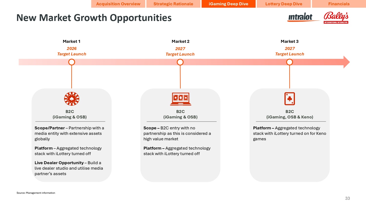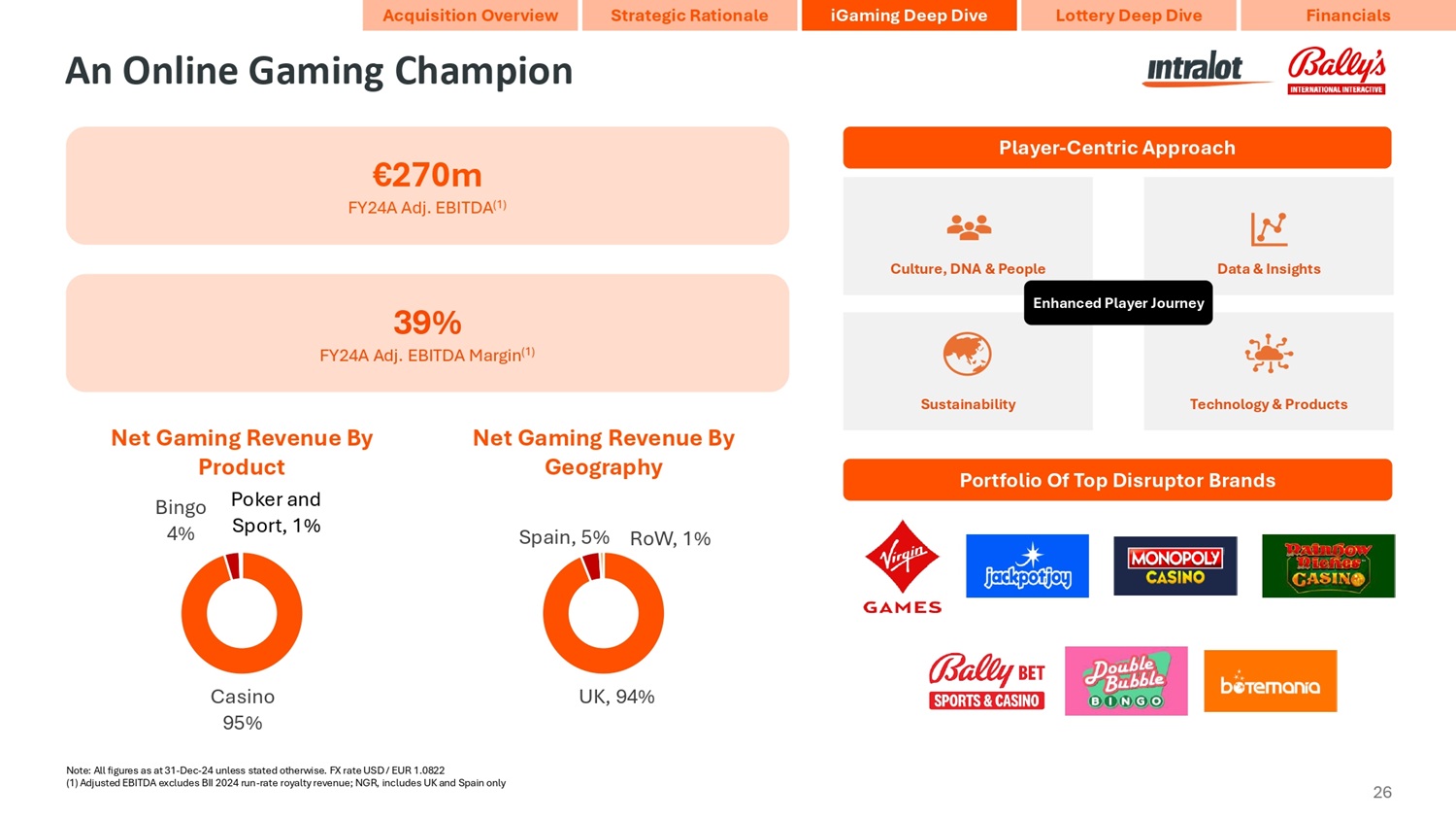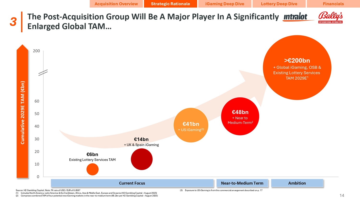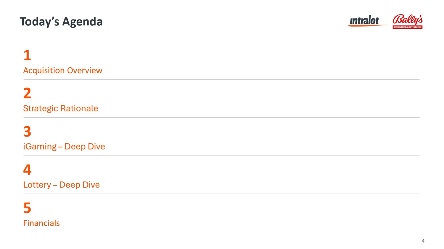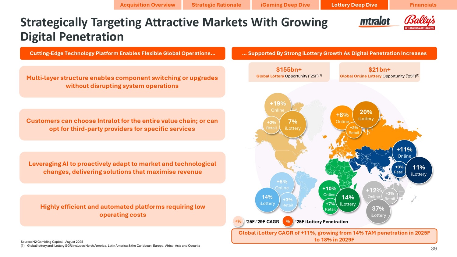 The following disclaimer applies to this presentation and the information provided therein, including in relation to Intralot (together with its subsidiaries, the “ Intralot Group ” or “ Intralot ”), Bally’s (together with its subsidiaries, the “ Bally’s Group ” or “ Bally’s ”) and Bally’s Holdings Limited (together with its subsidiaries, the “ Target Group ,” or the “ Bally’s International Interactive Business ” or “ BII ”, and together with Intralot, the “ Post - Acquisition Group ”), and any other material distributed or statements made in connection with such presentation (the “ Information ”) . You are therefore advised to carefully read the statements below before reading, accessing or making any other use of the Information . In accessing the Information, you agree to be bound by the following terms and conditions . NOT FOR DISTRIBUTION IN THE UNITED STATES . The Information does not constitute or form part of, and should not be construed as, an offer to sell or issue or the solicitation of an offer to buy or acquire any securities of the Intralot Group, the Bally’s Group or the Target Group, or any affiliate thereof in any jurisdiction whatsoever . No part of the Information, nor the fact of its distribution, should form the basis of, or be relied o n in connection with, any contract or commitment or investment decision whatsoever . None of the Intralot Group, the Bally’s Group or the Target Group, nor any of their respective advisers or representatives shall have any liability whatsoever for any loss whatsoever arising from any use of this presentation or its contents, or otherwise arising in connection with this presentation (whether direct, indirect, consequential or other) . Specifically, this presentation does not constitute a “prospectus” within the meaning of the U . S . Securities Act of 1933 , as amended or Regulation (EU) 2017 / 1129 , as amended . Certain information contained in this presentation , including, but not limited to, FY 25 guidance and mid - term targets, constitutes, or can be deemed, “forward - looking statements” . These forward - looking statements may be identified by the fact that they d o not relate only to historical or current facts but to expectations or projections of future events, results and circumstances that may or may not occur in the future, and by use of forward - looking terminology such as “aim,” “anticipate,” “assume,” “believe,” “can have,” “continue,” “could,” “estimate,” “expect,” “forecast,” “intend,” “may,” “plan,” “risk,” “should,” “suggest,” “will,” “would,” and similar language or the negative thereof or similar expressions that are projections of or indicate future events or future trends . For the avoidance of doubt, the Intralot Group’s targets and guidance on future earnings and financial position and performance of the Intralot Group, Target Group or Post - Acquisition Group (including, but not limited to, sales proceeds, EBITDA, Adjusted EBITDA uplift, capex (maintenance and growth), effective tax rate, leverage and dividend payout) are also forward - looking statements . By their nature, forward - looking statements involve known and unknown risks and uncertainties and other factors that may cause the Intralot Group’s, the Bally’s Group’s and the Target Group’s actual results, performance or achievements to be materially different from those expressed in, or implied by, such forward - looking statements . You are cautioned that forward - looking statements are not guarantees of future performance and that due to various risks, uncertainties and assumptions, any change of plans or targets based on market circumstances, actual events or results or the actual performance of the Intralot Group, the Bally’s Group and the Target Group, developments in the industries in which the Intralot Group, the Bally’s Group and the Target Group will operate, future capital expenditures and acquisitions, as well as any disruption in general economic and business conditions, particularly in geographic areas where business may be concentrated, may differ materially from those reflected or contemplated in such forward - looking statements or projections . Forward - looking statements are not historical facts but are based on certain assumptions of management regarding the Intralot Group’s, the Bally’s Group’s and the Target Group’s present and future business strategies and the environment in which each will operate, which the management believes to be reasonable but are inherently uncertain, and describe the Intralot Group’s, the Bally’s Group’s and the Target Group’s respective future operations, plans, strategies, objectives, goals and targets and expectations and future developments in the markets . No representation, express or implied, is made or will be made by the Intralot Group, the Bally’s Group, the Target Group or the Post - Acquisition Group (or, in each case, any of their respective affiliates, members, directors, officers, employees, advisors, consultants, agents, co - investors and representatives), that any forward - looking statements will be achieved or will prove to be correct . The actual future business, financial condition, results of operation and prospects could vary materially from the forward - looking statements . As a result, you should not rely on these forward - looking statements . All forward - looking statements apply only as of the date hereof and we undertake no obligation to update this information . The information in this presentation also includes rounded numbers . Accordingly, the sum of certain data may not conform to the expressed total . The Intralot Group’s strategic plan contains certain forward - looking statements of operating and financial guidance and targets, as well as expected capital expenditure, in the medium term . The assump
