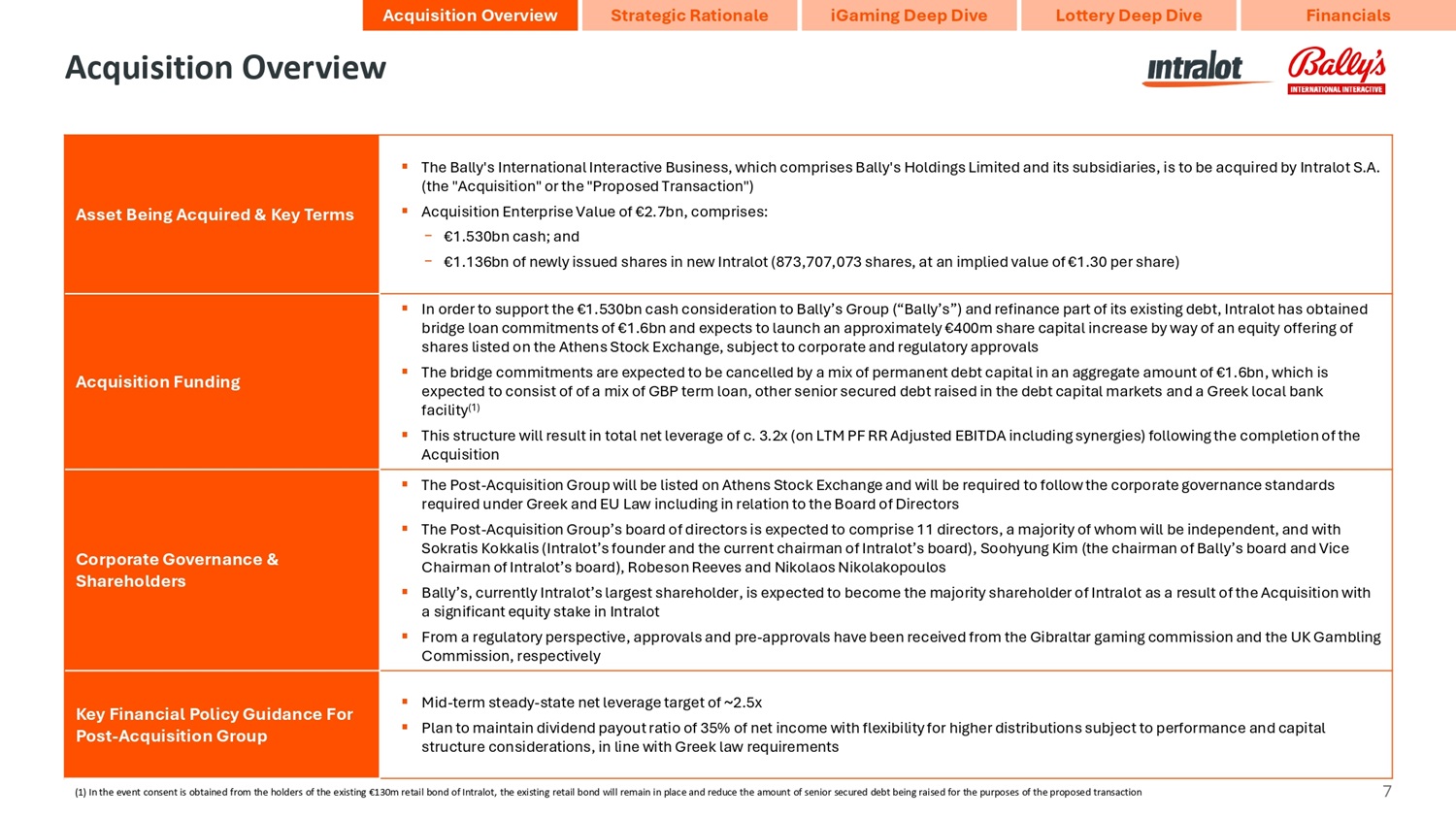 The Acquisition Creates A Global Gaming Champion in iGaming and Lottery Financials Lottery Deep Dive iGaming Deep Dive Strategic Rationale Acquisition Overview Intralot is a leading global lottery technology provider with long - term contracts and a track record of contract retention in 40 high - value markets BII is a leading multi - brand iGaming operator, with a history of solid market share in the UK Combination creates a truly integrated iGaming and lottery technology provider and operator, underpinned by a highly complementary and easy to integrate tech stack Post Acquisition Group will have, as of FY 2024, €1.0bn+ in Pro Forna Sales Proceeds, c.€41Gn Pro Forna RR Adjusted EBITDA at c.3G% PF RR adj. margins and c.G5% Pro Forma RR Adjusted Op. FCF conversion (1),(2) Multiple robust growth levers identified with a clear medium - term action plan Note: The BII audited carve - out financial statements for FY 2023 and 2024 were prepared in accordance with IFRS using single entity financial records with specific carve - out adjustments (1)Pro Forma Sales Proceeds is presented on an IFRS basis while run - rate Pro Forma Adj. EBITDA, margins and run - rate Pro Forma Op. Free Cash Flow conversion are presented on a non - IFRS basis. Figures for the Post - Acquisition Group are non - IFRS financial measures that represent the mathematical sum of such figure for the respective fiscal year or period, as applicable, for Intralot and BII, after giving effect to the Proposed Transaction. These aggregated figures are presented as a matter of convenience to recipients of this presentation and are not derived from pro forma financial information prepared on the basis of IFRS, stock exchange rules and regulations or any other 6 standard, nor do they take into account FX/consolidation effects, and as such do not reflect all adjustments that would be reflected in pro forma financial information that gives effect to the Proposed Transaction. (2) Operating Free Cash Flow defined as Pro Forma RR Adjusted EBITDA less Maintenance Capex. Operating Free Cash Flow Conversion defined as (Pro Forma RR Adjusted EBITDA less Maintenance Capex) / Pro Forma RR Adjusted EBITDA