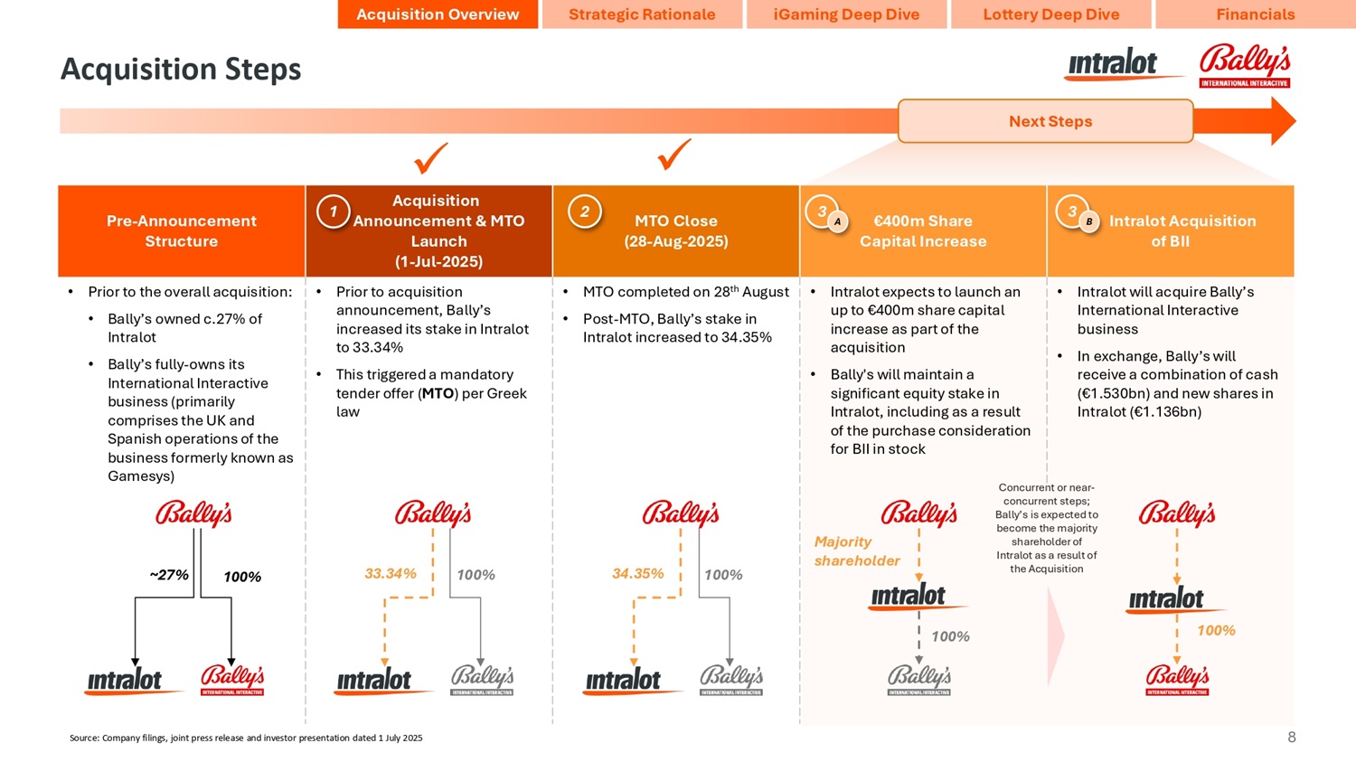 ▪ The Bally's International Interactive Business, which comprises Bally's Holdings Limited and its subsidiaries, is to be acquired by Intralot S.A. (the "Acquisition" or the "Proposed Transaction") ▪ Acquisition Enterprise Value of €2.7bn, comprises: - €1.530bn cash; and - €1.136bn of newly issued shares in new Intralot (873,707,073 shares, at an implied value of €1.30 per share) Asset Being Acquired s Key Terms ▪ In order to support the €1.530bn cash consideration to Bally’s Group (“Bally’s”) and refinance part of its existing debt, Intralot has obtained bridge loan commitments of €1.6bn and expects to launch an approximately €400m share capital increase by way of an equity offering of shares listed on the Athens Stock Exchange, subject to corporate and regulatory approvals ▪ The bridge commitments are expected to be cancelled by a mix of permanent debt capital in an aggregate amount of €1.6bn, which is expected to consist of of a mix of GBP term loan, other senior secured debt raised in the debt capital markets and a Greek local bank facility (1) ▪ This structure will result in total net leverage of c. 3.2x (on LTM PF RR Adjusted EBITDA including synergies) following the completion of the Acquisition Acquisition Funding ▪ The Post - Acquisition Group will be listed on Athens Stock Exchange and will be required to follow the corporate governance standards required under Greek and EU Law including in relation to the Board of Directors ▪ The Post - Acquisition Group’s board of directors is expected to comprise 11 directors, a majority of whom will be independent, and with Sokratis Kokkalis (Intralot’s founder and the current chairman of Intralot’s board), Soohyung Kim (the chairman of Bally’s board and Vice Chairman of Intralot’s board), Robeson Reeves and Nikolaos Nikolakopoulos ▪ Bally’s, currently Intralot’s largest shareholder, is expected to become the majority shareholder of Intralot as a result of the Acquisition with a significant equity stake in Intralot ▪ From a regulatory perspective, approvals and pre - approvals have been received from the Gibraltar gaming commission and the UK Gambling Commission, respectively Corporate Governance s Shareholders ▪ Mid - term steady - state net leverage target of ~2.5x ▪ Plan to maintain dividend payout ratio of 35% of net income with flexibility for higher distributions subject to performance and capital structure considerations, in line with Greek law requirements Key Financial Policy Guidance For Post - Acquisition Group Acquisition Overview 7 (1) In the event consent is obtained from the holders of the existing €130m retail bond of Intralot, the existing retail bond will remain in place and reduce the amount of senior secured debt being raised for the purposes of the proposed transaction Financials Lottery Deep Dive iGaming Deep Dive Strategic Rationale Acquisition Overview