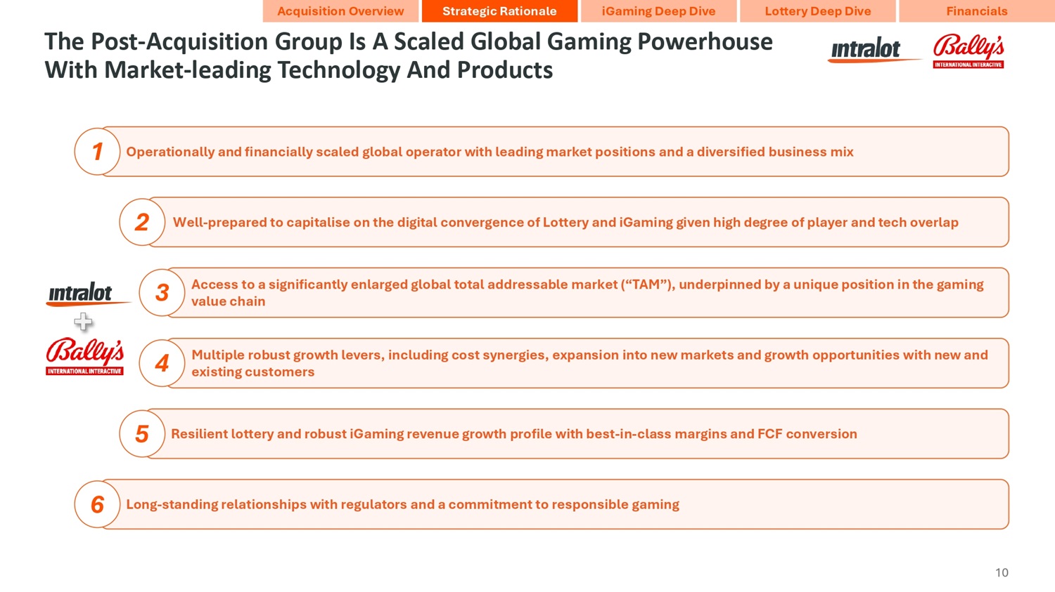 The Post - Acquisition Group Is A Scaled Global Gaming Powerhouse With Market - leading Technology And Products 10 Operationally and financially scaled global operator with leading market positions and a diversified business mix 1 Resilient lottery and robust iGaming revenue growth profile with best - in - class margins and FCF conversion 5 Multiple robust growth levers, including cost synergies, expansion into new markets and growth opportunities with new and existing customers 4 Access to a significantly enlarged global total addressable narket (“TAM”), underpinned by a unique position in the ganing value chain 3 Well - prepared to capitalise on the digital convergence of Lottery and iGaming given high degree of player and tech overlap 2 Long - standing relationships with regulators and a commitment to responsible gaming C Financials Lottery Deep Dive iGaming Deep Dive Strategic Rationale Acquisition Overview