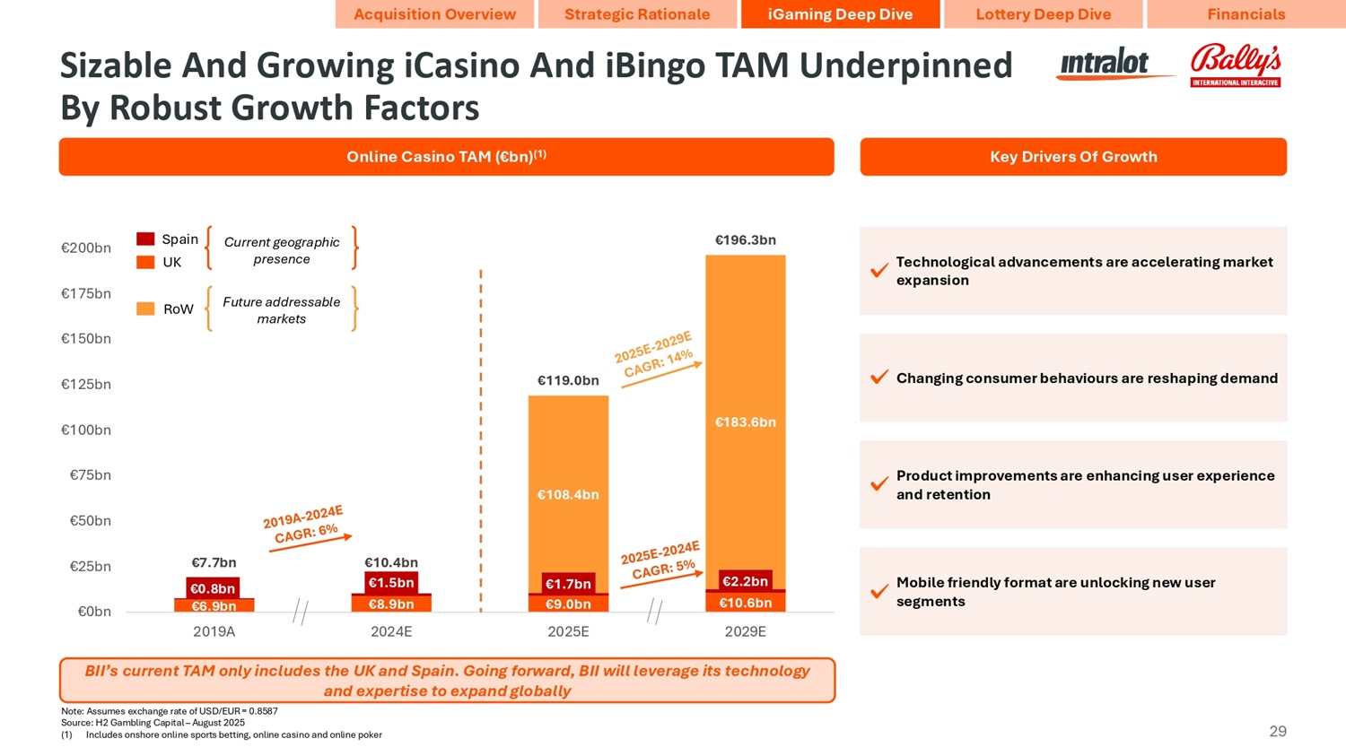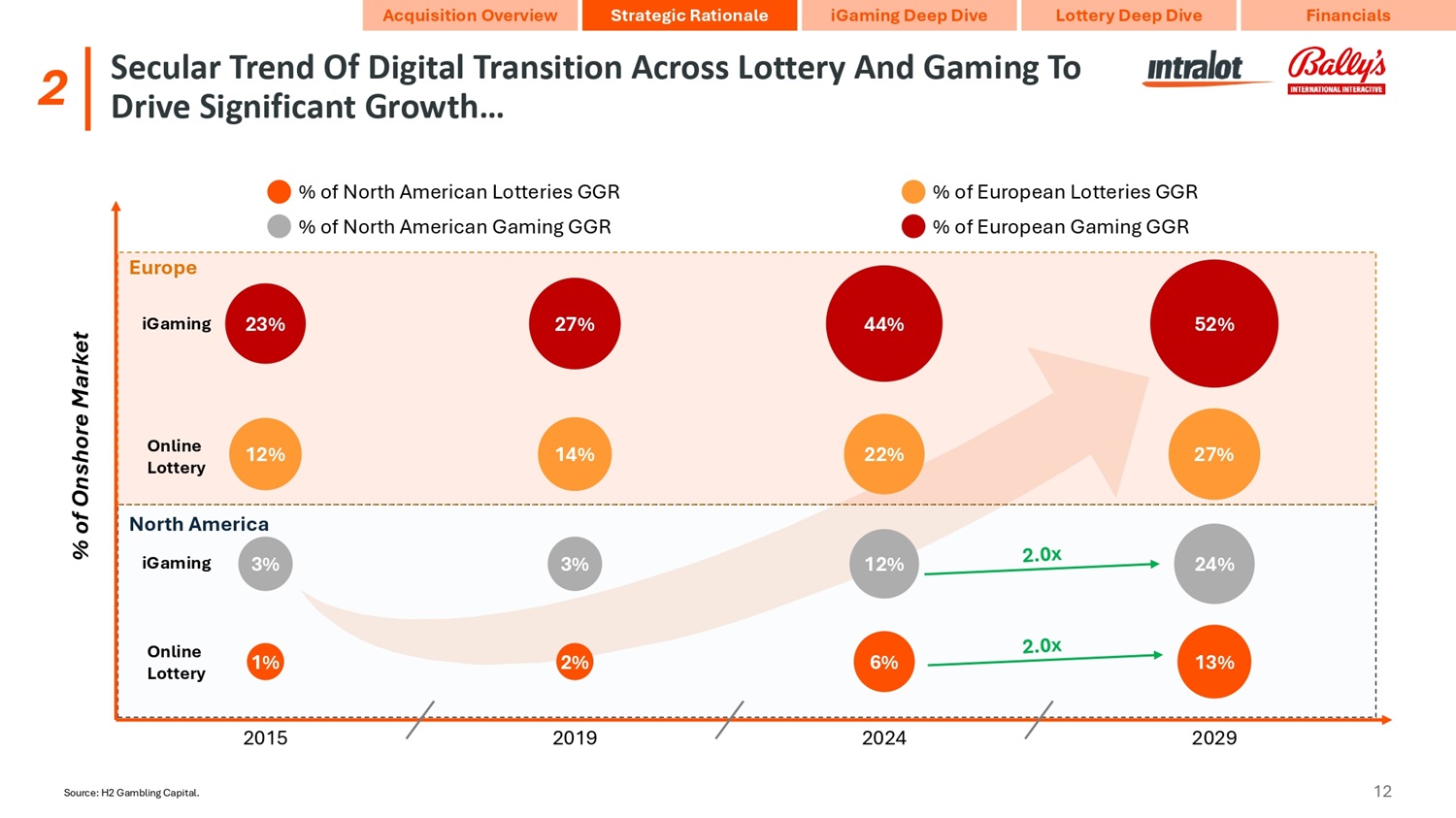 Post Acquisition Group Will Have Leading Positions In Attractive End Markets And Will Be Operationally And Financially Scaled 11 Leading Market Positions Attractive End Target Markets Operationally Scaled Financial Strength #2 UK iGaming Operator 40 Countries & Jurisdictions €1,067m FY24 PF Sales Proceeds (1) Top 3 US Lottery Solutions Operator (9) Top 3 North America VLT Monitoring Operator 49 Lottery Contracts ~700k Active Players €1.4bn+ Lottery Backlog Sales Proceeds (3) 39% FY24 PF RR Adj. EBITDA Margin 95% FY24 PF RR Adj. Op. FCF Conversion (11) €419m FY24 PF RR Adj. EBITDA (2) 1 Sports Betting and iGaming 73% Lottery Games 19 % VLTs 4% IT product and services 4% UK 60% Americas 21% RoW 11% Europe 8% Intralot Bally’s Int. Product Split (10) Geographic Split (10) Global Presence with Meaningful Diversification Across Geography and Product €6bn Lottery Services 2029E TAM – Existing Markets (4) €8bn iGaming 2029E TAM - Existing Markets (5) €200bn+ Total 2029E Target TAM (8) 100% Regulated Lotteries and B2C iGaming Markets €27bn US iGaming 2029E TAM (6),(7) Financials Lottery Deep Dive iGaming Deep Dive Strategic Rationale Acquisition Overview company filings Note: All figures as at 31 - Dec - 24 unless stated otherwise. FX rate USD / EUR 1.0822 Figures for the Post - Acquisition Group are non - IFRS financial measures that represent the Source: H2 Gambling Capital. BII Audited carve - out financial statements, Bally’s and Intralot public information prepared on the basis of IFRS, stock exchange rules and regulations or any other standard, nor do they take into account FX/consolidation effects, and as such do not reflect all adjustmentsthat(3) would be reflected in pro forma financial information that gives effect to the Proposed Transaction. (4) (1) BII Revenue, includes UK and Spain only; includes ~€26mm of run - rate royalty revenue; run - (5) mathematical sum of such figure for the respective fiscal year or period, as applicable, for Intralot and rate defined as on an annualised basis. Intralot sales proceedsare net of winners payouts (6) BII, after giving effect to the Proposed Transaction. These aggregated figures are presented as a matter (2) Adjustmentsfor BII run - rate Adjusted EBITDA include removal of ~€7m of FY2024 royalties, (7) of convenience to recipients of this presentation and are not derived from pro forma financial addition of €32.6m of run - rate adjustmentsfor royalties, and removal of ~€9m of corporate (8) cost allocation Up to 2029 and excluding 2024 Suppliersrevenues 2029 E H 2 Gambling Capital – August 2025 (Spain and UK onshore iGaming GGR 2029 E) H 2 Gambling Capital – August 2025 (United States onshore iGaming GGR 2029 E) Exposure to US iGaming is from the commercial arrangement described on p . 17 Includes North America, Latin America C the Caribbean, Africa, Asia C Middle East, Europe and Oceania onshore iGaming and OSB 2029E GGR (H2 Gambling Capital – August 2025) (9) Lottery Facility Management (10) Based on unaudited management accounts (11) Operating Free Cash Flow defined as Pro Forma RR Adjusted EBITDA less Maintenance Capex. Operating Free Cash Flow Conversion defined as (Pro Forma RR Adjusted EBITDA less Maintenance Capex) / Pro Forma RR Adjusted EBITDA