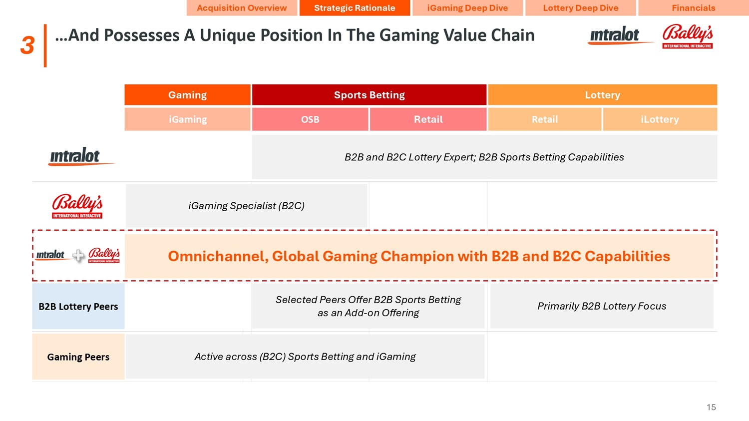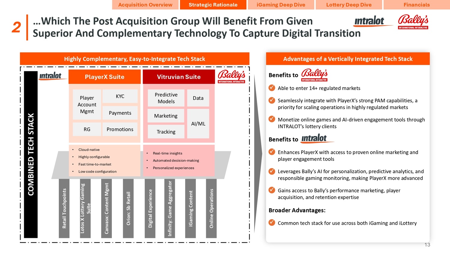 …Which The Post Acquisition Group Will Benefit From Given Superior And Complementary Technology To Capture Digital Transition 2 Benefits to Able to enter 14+ regulated markets Benefits to Advantages of a Vertically Integrated Tech Stack Highly Complementary, Easy - to - Integrate Tech Stack x x x x Seamlessly integrate with PlayerX’s strong PAM capabilities, a priority for scaling operations in highly regulated markets Retail Touchpoints Lotos X Lottery Gaming Suite Canvasx: Content Mgmt Orion: Sb Retail Infinity: Game Aggregator iGaming Content Digital Experience Online Operations PlayerX Suite Vitruvian Suite COMBINED TECH STACK KYC Player Account Mgmt Payments Promotions RG Data Predictive Models AI/ML Marketing Tracking • Cloud - native • Highly configurable • Fast time - to - market • Low code configuration • Real - time insights • Automated decision - making • Personalized experiences x x Monetize online games and AI - driven engagement tools through INTRALOT’s lottery clients x x Enhances PlayerX with access to proven online marketing and player engagement tools x x Leverages Bally’s AI for personalization, predictive analytics, and responsible gaming monitoring, making PlayerX more advanced x x Gains access to Bally’s performance marketing, player acquisition, and retention expertise Broader Advantages: x x Common tech stack for use across both iGaming and iLottery 13 Financials Lottery Deep Dive iGaming Deep Dive Strategic Rationale Acquisition Overview