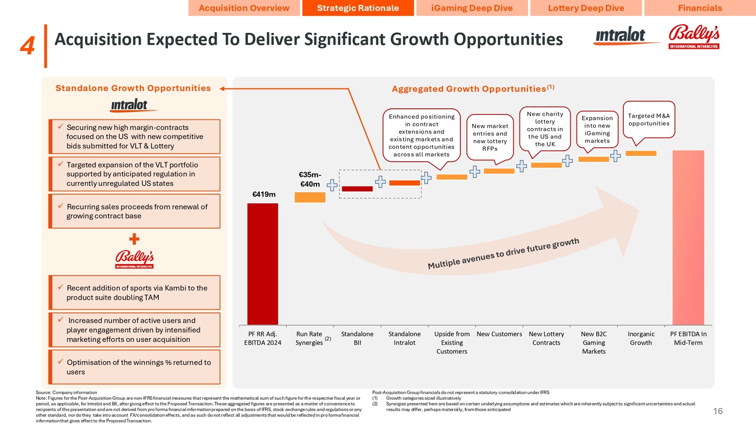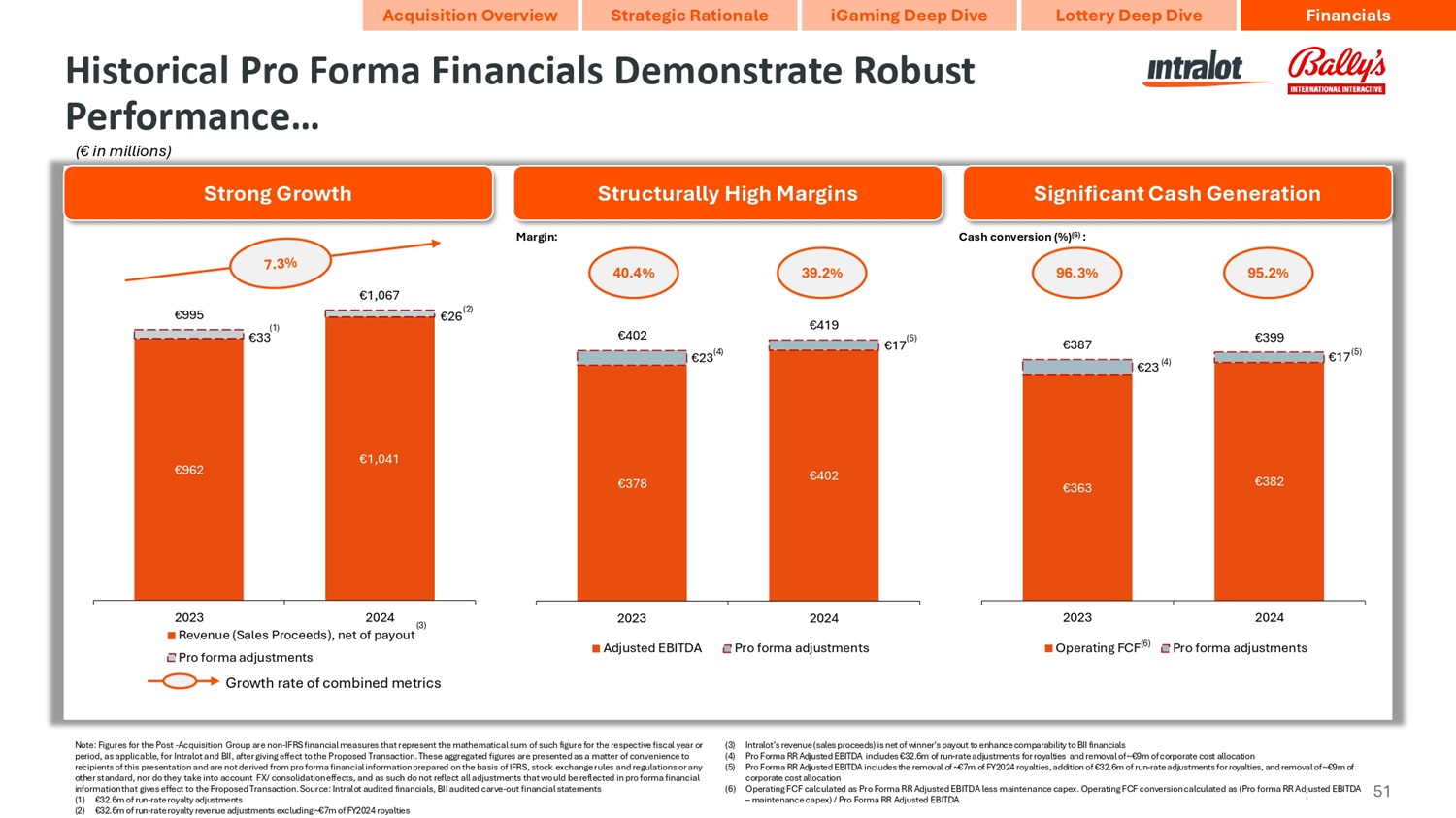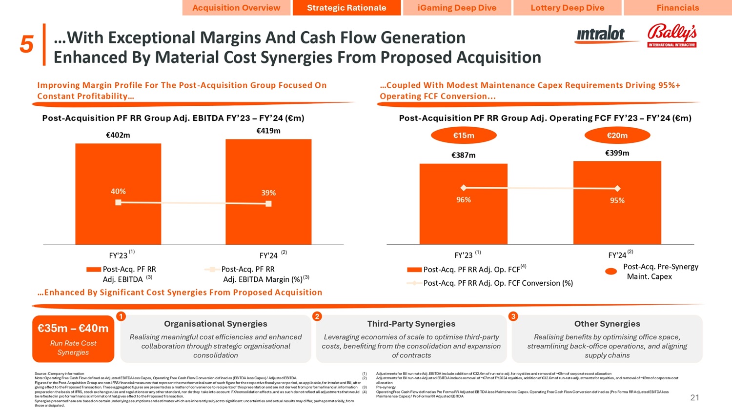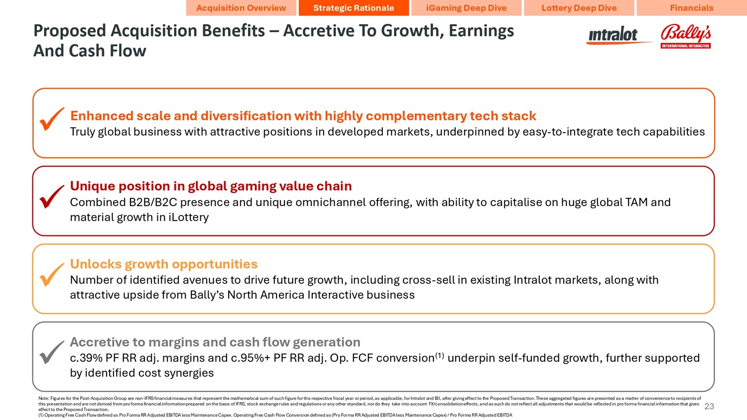 Proposed Acquisition Benefits – Accretive To Growth, Earnings And Cash Flow (1) x Enh a globa l d bu s al e ines s an d wit h di v e r s i f i c a t i o n tio n wi t h i n hig h de v elope d co mpl e m enta r u n derp i e c h n n e d s tac k ea s y b y t y mar k e t s , l y s pos i ti v e a tt r a c s c nc e T r ul y - to - integrate tech capabilities x Combined B2B/B2C presence and unique omnichannel offering, with ability to capitalise on huge global TAM and Unique position in global gaming value chain material growth in iLottery x Number of identified avenues to drive future growth, including cross - sell in existing Intralot markets, along with Unlocks growth opportunities attractive upside from Bally’s North America Interactive business Accretive to margins and cash flow generation x c.39% PF RR adj. margins and c.95%+ PF RR adj. Op. FCF conversion underpin self - funded growth, further supported by identified cost synergies 23 Note: Figures for the Post - Acquisition Group are non - IFRS financial measures that represent the mathematical sum of such figure for the respective fiscal year or period, as applicable, for Intralot and BII, after giving effect to the Proposed Transaction. These aggregated figures are presented as a matter of convenience to recipients of this presentation and are not derived from pro forma financial information prepared on the basis of IFRS, stock exchange rules and regulations or any other standard, nor do they take into account FX/consolidation effects, and as such do not reflect all adjustments that would be reflected in pro forma financial information that gives effect to the Proposed Transaction. (1) Operating Free Cash Flow defined as Pro Forma RR Adjusted EBITDA less Maintenance Capex. Operating Free Cash Flow Conversion defined as (Pro Forma RR Adjusted EBITDA less Maintenance Capex) / Pro Forma RR Adjusted EBITDA Financials Lottery Deep Dive iGaming Deep Dive Strategic Rationale Acquisition Overview