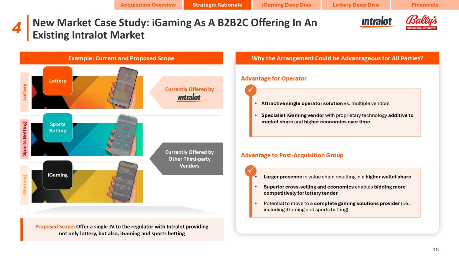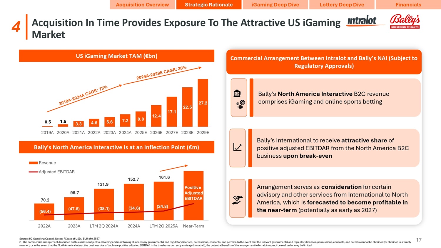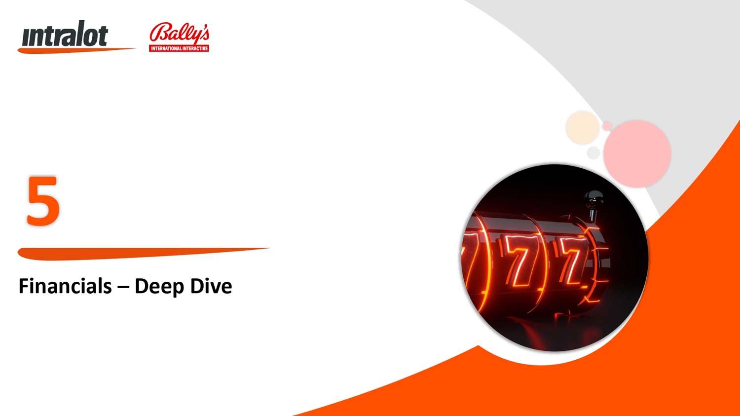 70.2 G6.7 131.G 152.7 161.6 (56.4) (47.8) (38.1) (34.6) (24.8) Revenue Adjusted EBITDAR Acquisition In Time Provides Exposure To The Attractive US iGaming Market 17 Commercial Arrangement Between Intralot and Bally’s NAI (Subject to Regulatory Approvals) 2022A 2023A LTM 2Q 2024A 2024A LTM 2Q 2025A Near - Term Source: H2 Gambling Capital. Notes: FX rate of USD / EUR of 0.8587 (1) The commercial arrangement described on this slide is subject to obtaining and maintaining all necessary governmental and regulatory licenses, permissions, consents, and permits. In the event that the relevant governmental and regulatory licenses, permissions, consents, and permits cannot be obtained (or obtained in a timely manner), or in the event that the North America Interactive business doesn't achieve positive adjusted EBITDAR in the timeframe currently envisaged (or at all), the potential benefits of the arrangement to Intralot may not be realized or may be limited US iGaming Market TAM (€bn) 0.5 1.5 3.3 4.6 5.6 7.2 8.8 12.4 17.1 22.5 27.2 2019A 2020A 2021A 2022A 2023A 2024A 2025E 2026E 2027E 2028E 2029E 4 Positive Adjusted EBITDAR Bally’s North America Interactive Is at an Inflection Point (€m) Bally’s North America Interactive B2C revenue comprises iGaming and online sports betting Bally’s International to receive attractive share of positive adjusted EBITDAR from the North America B2C business upon break - even Arrangement serves as consideration for certain advisory and other services from International to North America, which is forecasted to become profitable in the near - term (potentially as early as 2027) Financials Lottery Deep Dive iGaming Deep Dive Strategic Rationale Acquisition Overview