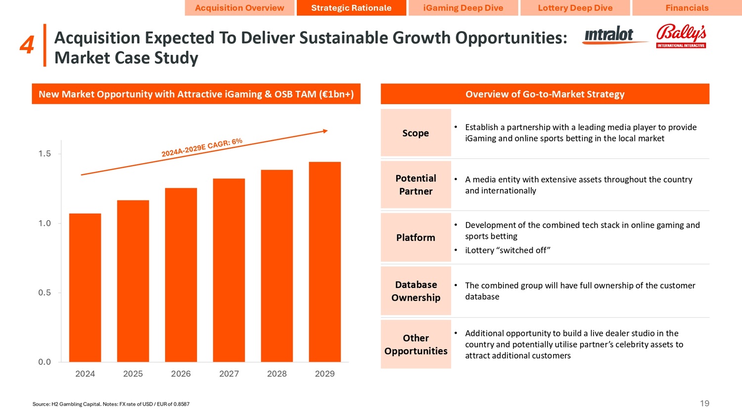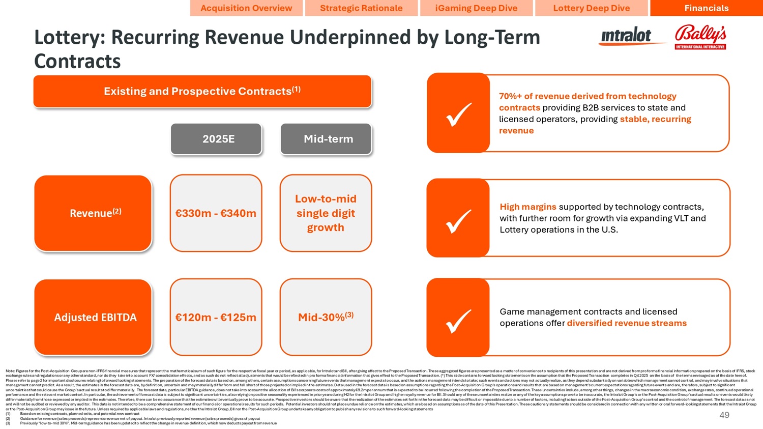 iGaming: Solid Growth with Class - Leading Margins 48 Existing Markets Only Revenue Adjusted EBITDA 2025E Mid - term €750n - €765n Mid - single digit growth €310n - €320n ~40% margin Positioned for steady revenue growth, driven by strategic expansion, diversified revenue streams, and operational efficiencies across core segments x Strong margin profile of ~40% supported by cost efficiencies and high - margin royalty streams x Low expense growth, with costs rising slower than revenue due to strategic marketing and streamlined content and processing fees x Note: Figures for the Post - Acquisition Group are non - IFRS financial measures that represent the mathematical sum of such figure for the respective fiscal year or period, as applicable, for Intralot and BII, after giving effect to the Proposed Transaction. These aggregated figures are presented as a matter of convenience to recipients of this presentation and are not derived from pro forma financial information prepared on the basis of IFRS, stock exchange rules and regulations or any other standard, nor do they take into account FX/ consolidation effects, and as such do not reflect all adjustmentsthat would be reflected in pro forma financial information that gives effect to the Proposed Transaction. (*) This slide contains forward looking statementson the assumption that the Proposed Transaction completes in Q4 2025 on the basis of the terms envisaged as of the date hereof. Please refer to page 2 for important disclosuresrelating to forward looking statements. The preparation of the forecast data is based on, among others, certain assumptionsconcerning future events that management expects to occur, and the actions management intends to take; such events and actions may not actually realize, as they depend substantially on variables which management cannot control, and may involve situations that management cannot predict. As a result, the estimates in the forecast data are, by definition, uncertain and may materially differ from and fall short of those projected or implied in the estimates. Data used in the forecast data is based on assumptions regarding the Post - Acquisition Group’s operations and results that are based on management'scurrent expectations regarding future events and are, therefore, subject to significant uncertainties that could cause the Group’s actual results to differ materially. The forecast data, particular EBITDA guidance, does not take into account the allocation of BII's corporate costs of approximately €9.2m per annum that is expected to be incurred following the completion of the Proposed Transaction. These uncertainties include, among other things, changes in the macroeconomic condition, exchange rates, continued operational performance and the relevant market context. In particular, the achievement of forecast data is subject to significant uncertainties, also relying on positive seasonality experienced in prior years during H2 for the Intralot Group and higher royalty revenue for BII. Should any of these uncertainties realize or any of the key assumptions prove to be inaccurate, the Intralot Group’s or the Post - Acquisition Group’s actual results or events would likely differ materially from those expressed or implied in the estimates. Therefore, there can be no assurance that the estimates will eventually prove to be accurate. Prospective investors should be aware that the realization of the estimates set forth in the forecast data may be difficult or impossible due to a number of factors, including factors outside of the Post - Acquisition Group’s control and the control of management. The forecast data as not and will not be audited or reviewed by any auditor. This data is not intended to be a comprehensive statement of our financial or operational results for such periods. Potential investors should not place undue reliance on the estimates, which are based on assumptionsas of the date of this Presentation. These cautionary statementsshould be considered in connection with any written or oral forward - looking statements that the Intralot Group or the Post - Acquisition Group may issue in the future. Unless required by applicable laws and regulations, neither the Intralot Group, BII nor the Post - Acquisition Group undertake any obligation to publish any revisions to such forward - looking statements. Financials Lottery Deep Dive iGaming Deep Dive Strategic Rationale Acquisition Overview