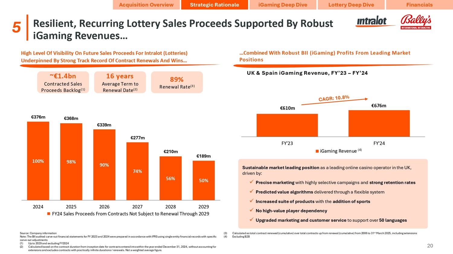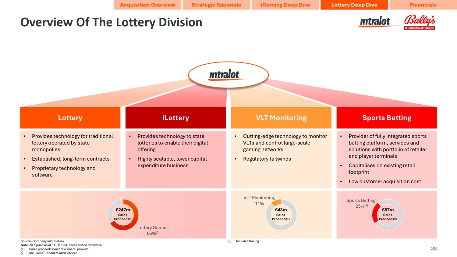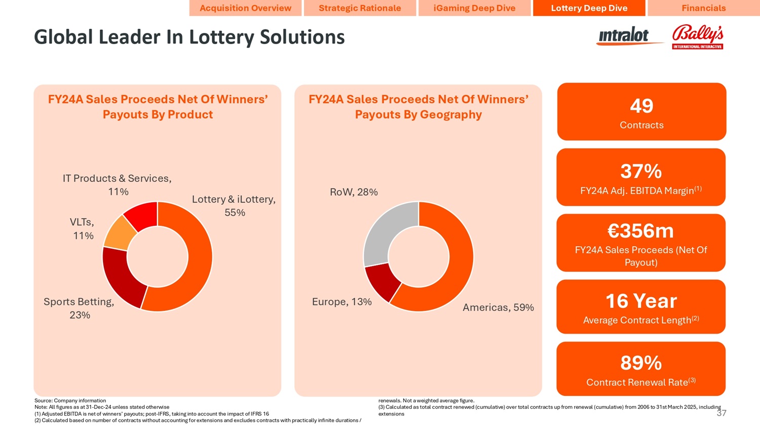 Global Leader In Lottery Solutions 37 Americas, 59% Europe, 13% RoW, 28% Lottery C iLottery, 55% Sports Betting, 23% VLTs, 11% IT Products C Services, 11% FY24A Sales Proceeds Net Of Winners’ Payouts By Product FY24A Sales Proceeds Net Of Winners’ Payouts By Geography 16 Year Average Contract Length (2) €356n FY24A Sales Proceeds (Net Of Payout) 37% FY24A Adj. EBITDA Margin (1) 8G% Contract Renewal Rate (3) 4G Contracts Source: Company information Note: All figures as at 31 - Dec - 24 unless stated otherwise (1) Adjusted EBITDA is net of winners’ payouts; post - IFRS, taking into account the impact of IFRS 16 (2) Calculated based on number of contracts without accounting for extensions and excludes contracts with practically infinite durations / renewals. Not a weighted average figure. (3) Calculated as total contract renewed (cumulative) over total contracts up from renewal (cumulative) from 2006 to 31st March 2025, including extensions Financials Lottery Deep Dive iGaming Deep Dive Strategic Rationale Acquisition Overview