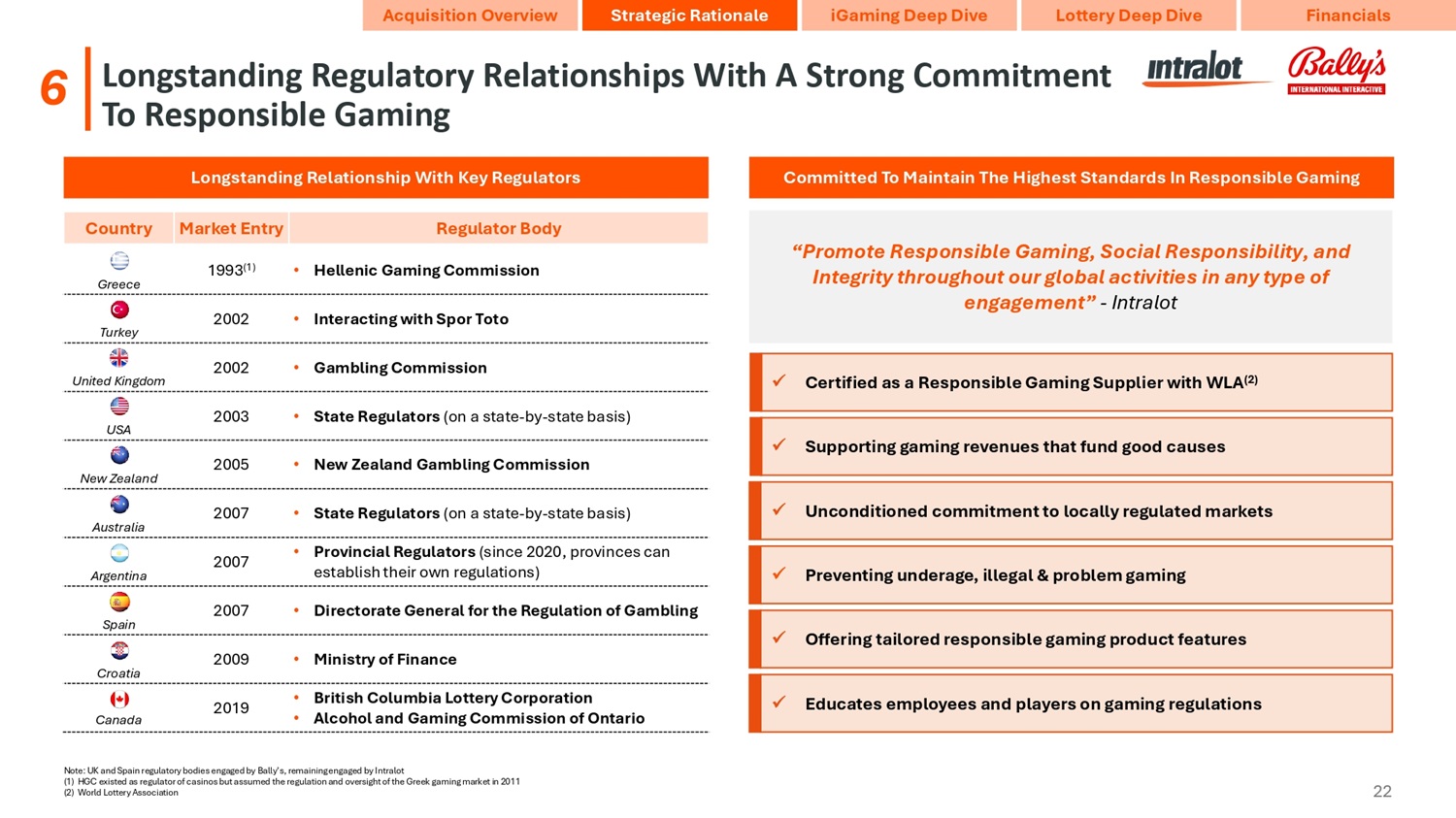 …With Exceptional Margins And Cash Flow Generation Enhanced By Material Cost Synergies From Proposed Acquisition 21 Source: Company information Note: Operating Free Cash Flow defined as Adjusted EBITDA less Capex, Operating Free Cash Flow Conversion defined as (EBITDA less Capex) / Adjusted EBITDA. Figures for the Post - Acquisition Group are non - IFRS financial measures that represent the mathematical sum of such figure for the respective fiscal year or period, as applicable, for Intralot and BII, after giving effect to the Proposed Transaction . These aggregated figures are presented as a matter of convenience to recipients of this presentation and are not derived from pro forma financial information ( 3 ) prepared on the basis of IFRS, stock exchange rules and regulations or any other standard, nor do they take into account FX/consolidation effects, and as such do not reflect all adjustmentsthat would ( 4 ) be reflected in pro forma financial information that gives effect to the Proposed Transaction . Synergies presented here are based on certain underlying assumptions and estimates which are inherently subject to significant uncertainties and actual results may differ, perhaps materially, from those anticipated . (1) (2) Adjustmentsfor BII run - rate Adj. EBITDA include addition of €32.6m of run - rate adj. for royalties and removal of ~€9m of corporate cost allocation Adjustmentsfor BII run - rate Adjusted EBITDA include removal of ~€7m of FY2024 royalties, addition of €32.6m of run - rate adjustmentsfor royalties, and removal of ~€9m of corporate cost allocation Pre - synergy Operating Free Cash Flow defined as Pro Forma RR Adjusted EBITDA less Maintenance Capex. Operating Free Cash Flow Conversion defined as (Pro Forma RR Adjusted EBITDA less Maintenance Capex) / Pro Forma RR Adjusted EBITDA …Enhanced By Significant Cost Synergies From Proposed Acquisition Organisational Synergies Realising meaningful cost efficiencies and enhanced collaboration through strategic organisational consolidation Third - Party Synergies Leveraging economies of scale to optimise third - party costs, benefiting from the consolidation and expansion of contracts Other Synergies Realising benefits by optimising office space, streamlining back - office operations, and aligning supply chains 1 2 3 €35n – €40n Run Rate Cost Synergies €402m €419m 40% 39% FY'23 (1) Post - Acq. PF RR Adj. EBITDA (3) FY'24 (2) Post - Acq. PF RR Adj. EBITDA Margin (%) (3) Improving Margin Profile For The Post - Acquisition Group Focused On Constant Profitability… Post - Acquisition PF RR Group Adj. EBITDA FY’23 – FY’24 (€n) …Coupled With Modest Maintenance Capex Requirements Driving 95%+ Operating FCF Conversion... €387m €399m 96% 95% FY'23 (1) Post - Acq. PF RR Adj. Op. FCF (4) Post - Acq. PF RR Adj. Op. FCF Conversion (%) FY'24 (2) Post - Acq. Pre - Synergy Maint. Capex 5 Financials Lottery Deep Dive iGaming Deep Dive Strategic Rationale Acquisition Overview Post - Acquisition PF RR Group Adj. Operating FCF FY’23 – FY’24 (€n) €15n €20n