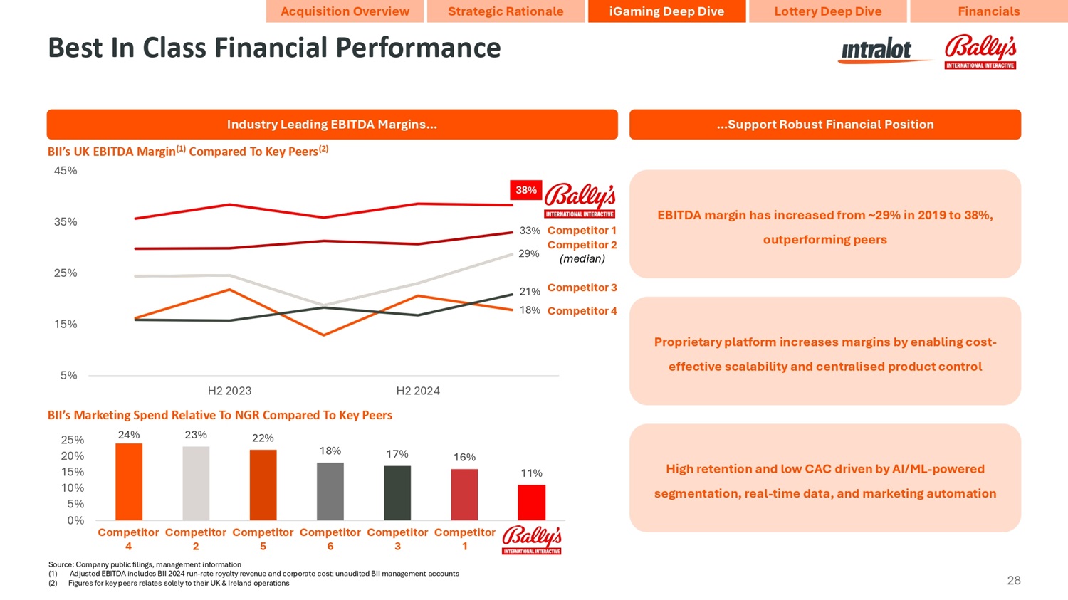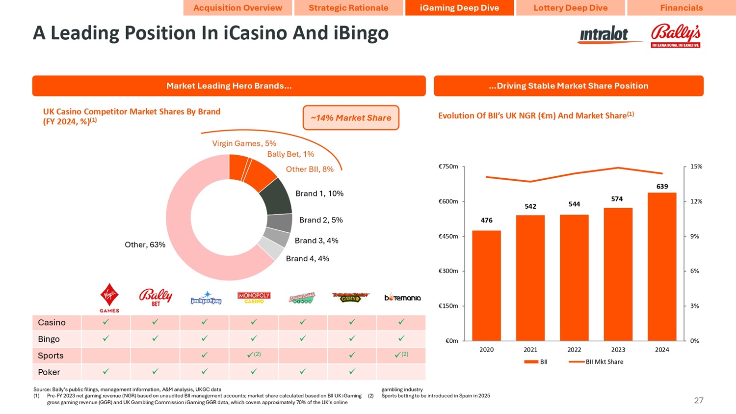 x x x x x x x Casino x x x x x x x Bingo x (2) x x (2) x Sports x x x x x x Poker 27 476 542 544 574 639 0% 3% 6% 9% 12% 15% €0m €150m €300m €450m €600m €750m 2020 2021 2022 2023 BII Mkt Share 2024 BII Evolution Of BII’s UK NGR (€m) And Market Share (1) UK Casino Competitor Market Shares By Brand (FY 2024, %) (1) Virgin Games, 5% Bally Bet, 1% Other BII, 8% Brand 1, 10% Brand 2, 5% Brand 3, 4% Brand 4, 4% Other, 63% A Leading Position In iCasino And iBingo Market Leading Hero Brands… …Driving Stable Market Share Position Source: Bally’s public filings, management information, ACM analysis, UKGC data (1) Pre - FY 2023 net gaming revenue (NGR) based on unaudited BII management accounts; market share calculated based on BII UK iGaming gross gaming revenue (GGR) and UK Gambling Commission iGaming GGR data, which covers approximately 70% of the UK’s online gambling industry (2) Sports betting to be introduced in Spain in 2025 ~14% Market Share Financials Lottery Deep Dive iGaming Deep Dive Strategic Rationale Acquisition Overview