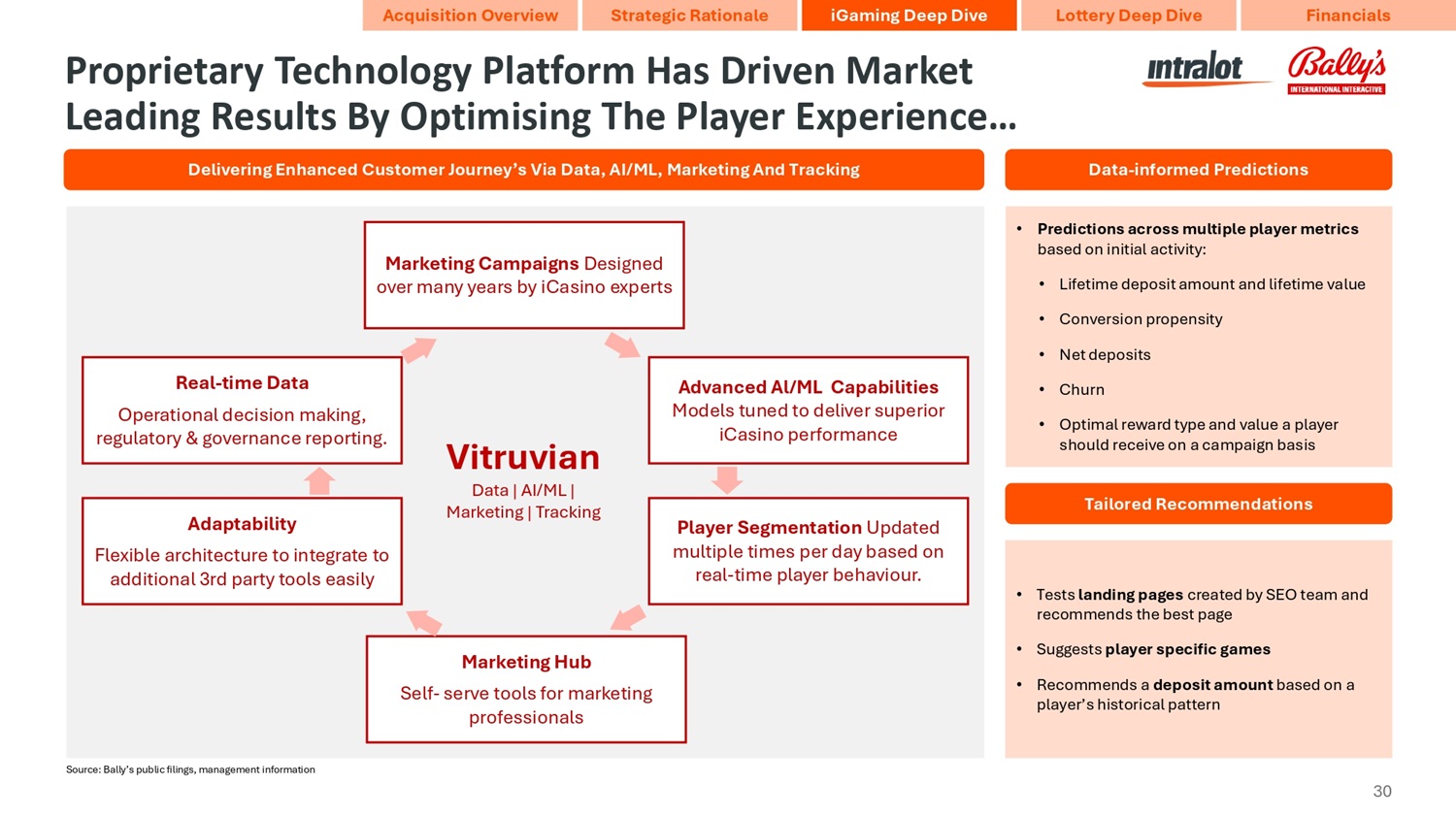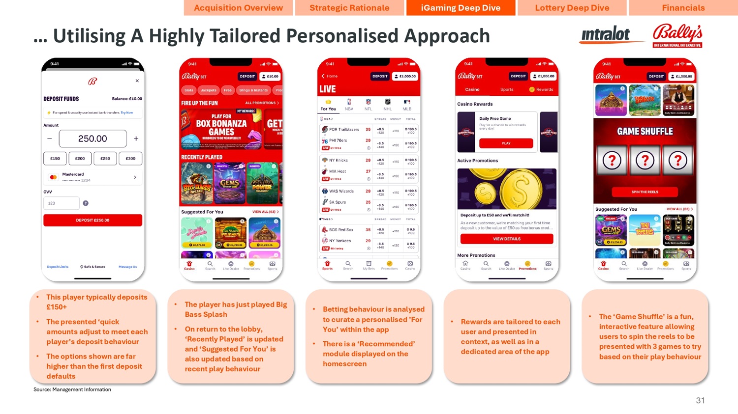 Proprietary Technology Platform Has Driven Market Leading Results By Optimising The Player Experience… Advanced Al/ML Capabilities Models tuned to deliver superior iCasino performance Player Segmentation Updated multiple times per day based on real - time player behaviour. Adaptability Flexible architecture to integrate to additional 3rd party tools easily Real - time Data Operational decision making, regulatory C governance reporting. Marketing Campaigns Designed over many years by iCasino experts Marketing Hub Self - serve tools for marketing professionals Vitruvian Data | AI/ML | Marketing | Tracking • Tests landing pages created by SEO team and recommends the best page • Suggests player specific games • Recommends a deposit amount based on a player’s historical pattern • Predictions across multiple player metrics based on initial activity: • Lifetime deposit amount and lifetime value • Conversion propensity • Net deposits • Churn • Optimal reward type and value a player should receive on a campaign basis 30 Delivering Enhanced Custoner Journey’s Via Data, AI/ML, Marketing And Tracking Data - informed Predictions Tailored Recommendations Source: Bally’s public filings, management information Financials Lottery Deep Dive iGaming Deep Dive Strategic Rationale Acquisition Overview