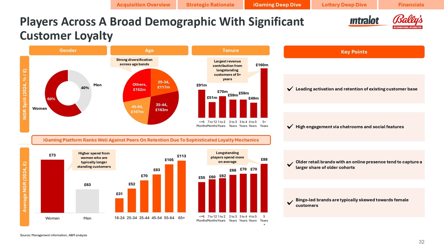 Players Across A Broad Demographic With Significant Customer Loyalty 32 Average NGR (2024, £) £31 £52 £70 £83 £105 £113 18 - 24 25 - 34 35 - 44 45 - 54 55 - 64 65+ £55 £60 £62 £68 £70 £70 £88 <=6 7 to 12 1 to 2 2 to 3 3 to 4 4 to 5 5 MonthsMonthsYears Years Years Years Years + £73 £63 Women Men Longstanding players spend more on average £G1m £51m £70m £5Gm £5Gm £4Gm £160m <=6 7 to 12 1 to 2 2 to 3 3 to 4 4 to 5 5+ MonthsMonthsYears Years Years Years Years Gender NGR Split (2024, % / £) 40% 60% 25 - 34, £117m 35 - 44, £163m 45 - 54, £107m Others, £152m Tenure Largest revenue contribution from longstanding customers of 5+ years Men Women Age Strong diversification across age bands Higher spend from women who are typically longer standing customers Leading activation and retention of existing customer base High engagement via chatrooms and social features Older retail brands with an online presence tend to capture a larger share of older cohorts Bingo - led brands are typically skewed towards female customers Source: Management information, ACM analysis Key Points iGaming Platform Ranks Well Against Peers On Retention Due To Sophisticated Loyalty Mechanics Financials Lottery Deep Dive iGaming Deep Dive Strategic Rationale Acquisition Overview