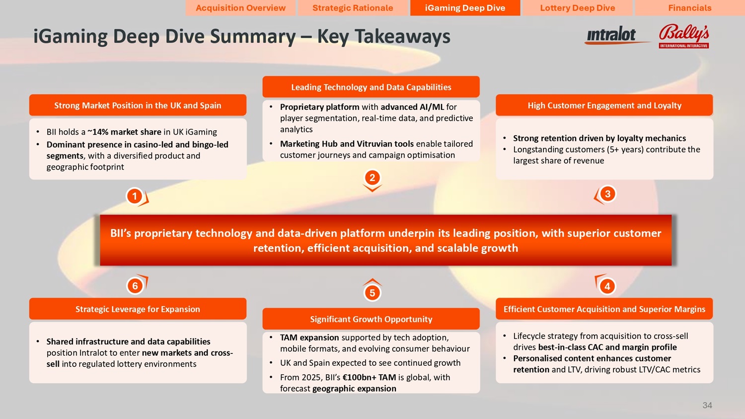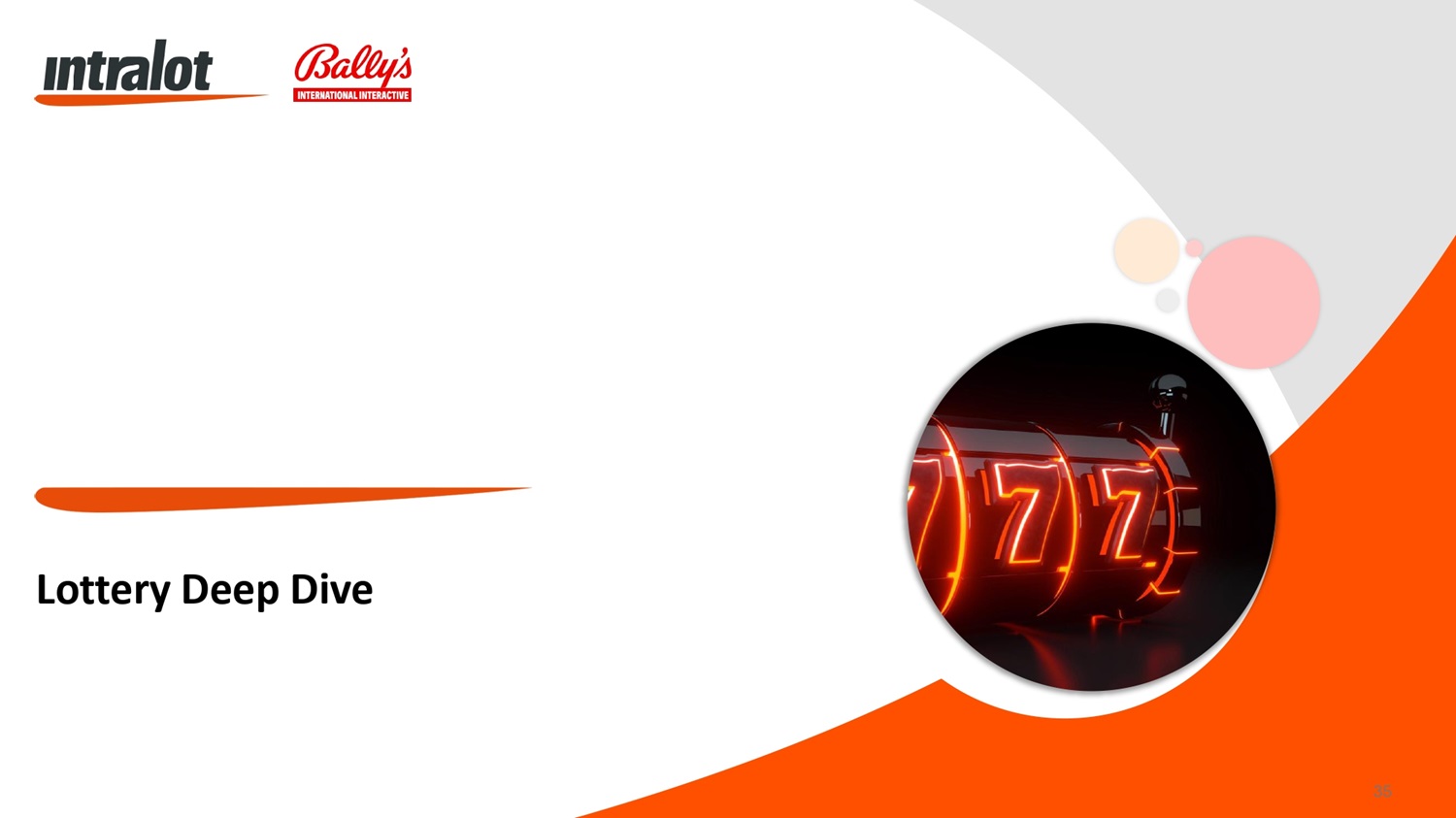 iGaming Deep Dive Summary – Key Takeaways BII’s proprietary technology and data - driven platform underpin its leading position, with superior customer retention, efficient acquisition, and scalable growth 34 2 3 1 Leading Technology and Data Capabilities • Proprietary platform with advanced AI/ML for player segmentation, real - time data, and predictive analytics • Marketing Hub and Vitruvian tools enable tailored customer journeys and campaign optimisation High Customer Engagement and Loyalty • Strong retention driven by loyalty mechanics • Longstanding customers (5+ years) contribute the largest share of revenue Strong Market Position in the UK and Spain • BII holds a ~14% market share in UK iGaming • Dominant presence in casino - led and bingo - led segments , with a diversified product and geographic footprint 5 6 4 • TAM expansion supported by tech adoption, mobile formats, and evolving consumer behaviour • UK and Spain expected to see continued growth • From 2025, BII’s €100bn+ TAM is global, with forecast geographic expansion • Lifecycle strategy from acquisition to cross - sell drives best - in - class CAC and margin profile • Personalised content enhances customer retention and LTV, driving robust LTV/CAC metrics Strategic Leverage for Expansion Efficient Customer Acquisition and Superior Margins Significant Growth Opportunity • Shared infrastructure and data capabilities position Intralot to enter new markets and cross - sell into regulated lottery environments Financials Lottery Deep Dive iGaming Deep Dive Strategic Rationale Acquisition Overview