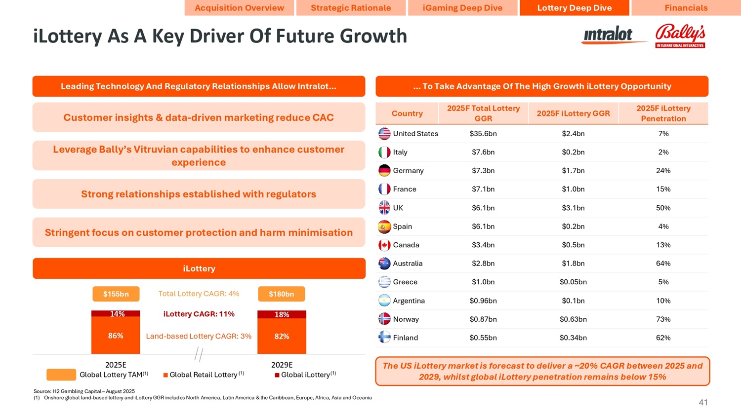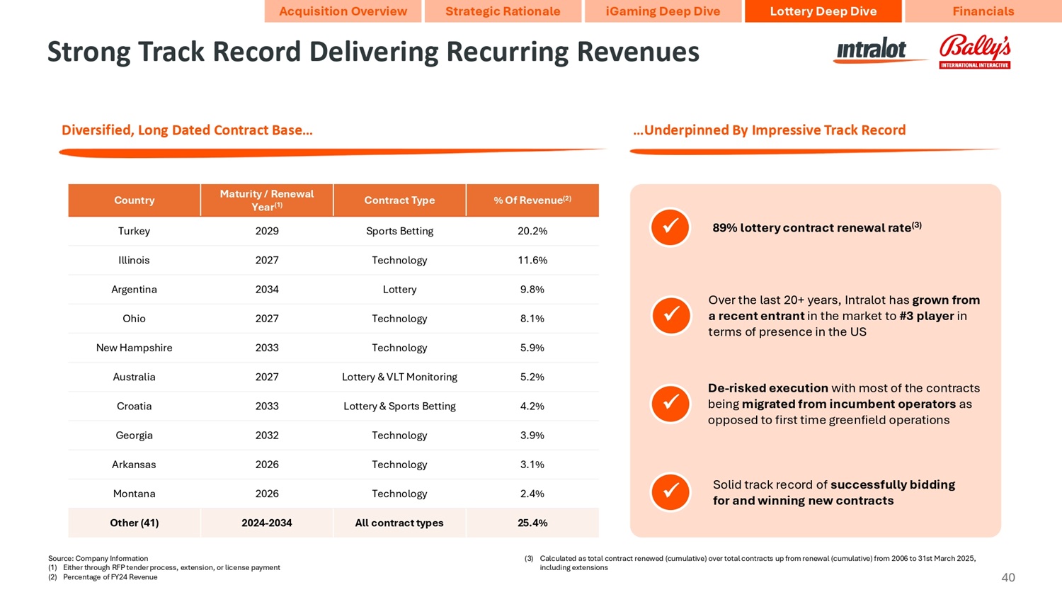 Strategically Targeting Attractive Markets With Growing Digital Penetration 39 Cutting - Edge Technology Platforn Enables Flexible Global Operations… … Supported By Strong iLottery Growth As Digital Penetration Increases Source: H2 Gambling Capital – August 2025 (1) Global lottery and iLottery GGR includes North America, Latin America C the Caribbean, Europe, Africa, Asia and Oceania +1G% Online +2% Retail +6% Online +3% Retail +8% Online +2% Retail +10% Online +7% Retail +12% Online +11% Online +3% Retail Multi - layer structure enables component switching or upgrades without disrupting system operations Customers can choose Intralot for the entire value chain; or can opt for third - party providers for specific services Leveraging AI to proactively adapt to market and technological changes, delivering solutions that maximise revenue Highly efficient and automated platforms requiring low operating costs 7% iLottery 20% iLottery 11% iLottery 14% iLottery 14% iLottery +% ‘25F - ’2GF CAGR % ’25F iLottery Penetration Global iLottery CAGR of +11%, growing from 14% TAM penetration in 2025F to 18% in 202GF $155bn+ Global Lottery Opportunity (’25F) (1) $21bn+ Global Online Lottery Opportunity (’25F) (1) +3% Retail 37% iLottery Financials Lottery Deep Dive iGaming Deep Dive Strategic Rationale Acquisition Overview