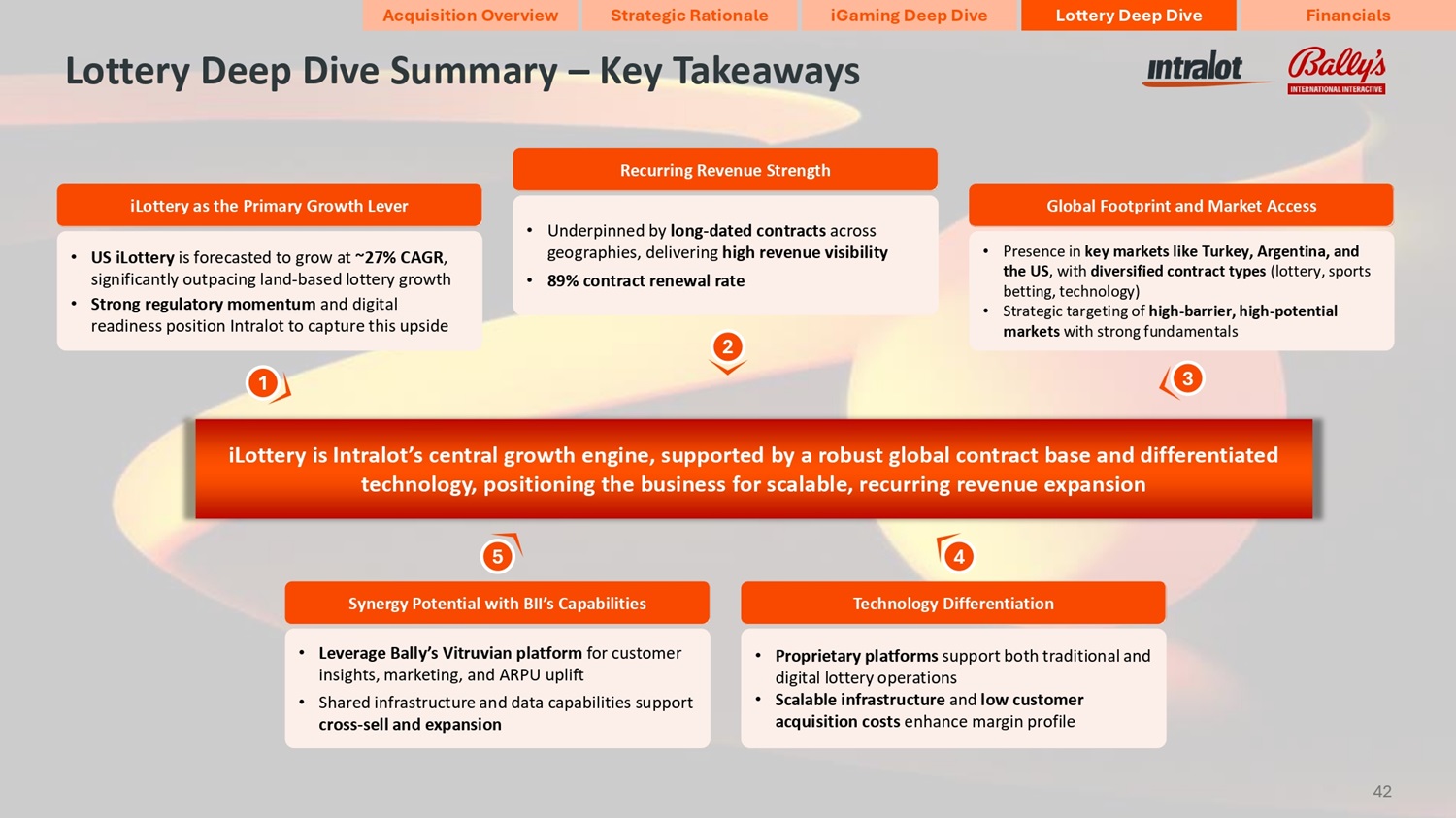86% 82% 14% 18% 2029E Global iLottery (1) 2025E Global Lottery TAM (1) Global Retail Lottery (1) iLottery As A Key Driver Of Future Growth 41 The US iLottery market is forecast to deliver a ~20% CAGR between 2025 and 2023, whilst global iLottery penetration remains below 15% Source: H2 Gambling Capital – August 2025 (1) Onshore global land - based lottery and iLottery GGR includes North America, Latin America C the Caribbean, Europe, Africa, Asia and Oceania Leading Technology And Regulatory Relationships Allow Intralot… … To Take Advantage Of The High Growth iLottery Opportunity 2025F iLottery Penetration 2025F iLottery GGR 2025F Total Lottery GGR Country 7% $2.4bn $35.6bn United States 2% $0.2bn $7.6bn Italy 24% $1.7bn $7.3bn Germany 15% $1.0bn $7.1bn France 50% $3.1bn $6.1bn UK 4% $0.2bn $6.1bn Spain 13% $0.5bn $3.4bn Canada 64% $1.8bn $2.8bn Australia 5% $0.05bn $1.0bn Greece 10% $0.1bn $0.96bn Argentina 73% $0.63bn $0.87bn Norway 62% $0.34bn $0.55bn Finland Customer insights s data - driven marketing reduce CAC Leverage Bally’s Vitruvian capabilities to enhance custoner experience Strong relationships established with regulators Stringent focus on customer protection and harm minimisation iLottery $180bn $155bn Total Lottery CAGR: 4% iLottery CAGR: 11% Land - based Lottery CAGR: 3% Financials Lottery Deep Dive iGaming Deep Dive Strategic Rationale Acquisition Overview