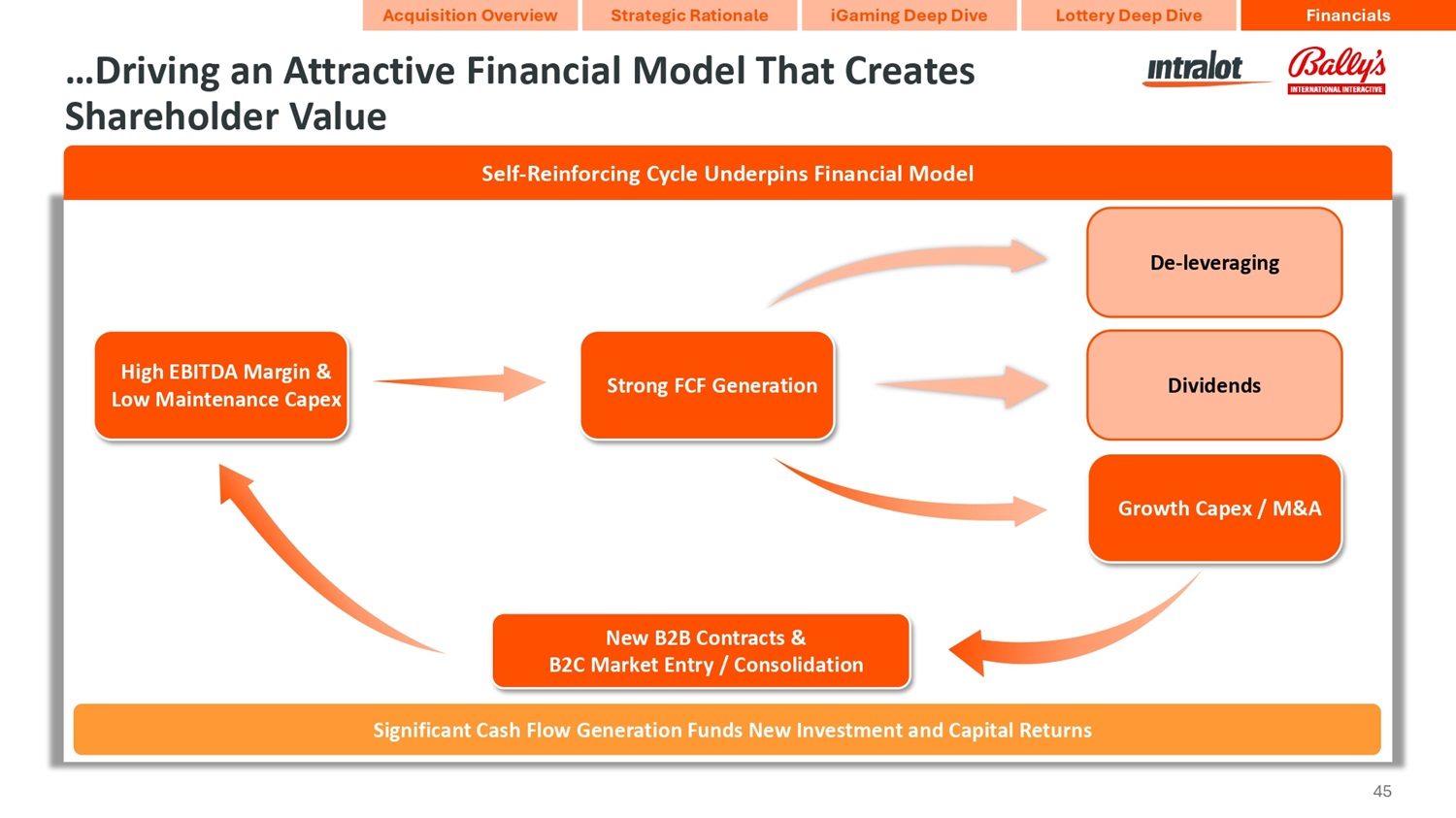 Post - Acquisition Group to Deliver Strong Financial Performance… 44 Predictable Revenue Growth 16 Yrs Contract Length (2) 8G% Contracts Renewal Rate (1) 100% Regulated Markets Structurally High Margins Benefiting Operating Leverage ~3G% FY24 Pro Forma RR Adjusted EBITDA margin (3) Robust Cash Flow Generation Underpinned By Low Maintenance Capex ~G5% FY24 Pro Forma RR Operating FCF Conversion (3,4) Material Upside Through Multiple Growth Avenues x New B2C market entry x Charity lottery (UK / US) x Servicing revenue from NAI x iLottery digital content x US iLottery technology x B2B cross - selling Note: Figures for the Post - Acquisition Group are non - IFRS financial measures that represent the mathematical sum of such figure for the respective fiscal year or period, as applicable, for Intralot and BII, after giving effect to the Proposed Transaction. These aggregated figures are presented as a matter of convenience to recipients of this presentation and are not derived from pro forma financial information prepared on the basis of IFRS, stock exchange rules and regulations or any other standard, nor do they take into account FX/consolidation effects, and as such do not reflect all adjustments that would be reflected in pro forma financial information that gives effect to the Proposed Transaction. (1) Calculated as total contracts renewed (cumulative) over total contracts up from renewal (cumulative) from 2007 to April 2025, including extensions (2) Calculated based on number of contracts without accounting for extensions and excludes contracts with practically infinite durations / renewals. Not a weighted average figure (3) FY24 Pro Forma figures are presented on an aggregated basis and representing the mathematical sum of each such figure for the fiscal year ended December 31, 2024, for Intralot and BII, after giving effect to the Proposed Transaction. These aggregated figures are presented as a matter of convenience to recipients of this presentation and are not derived from pro forma financial information prepared on the basis of IFRS, stock exchange rules and regulations or any other standard, nor do they take into account FX/ consolidation effects, and as such do not reflect all adjustments that would be reflected in pro forma financial information that gives effect to the Proposed Transaction (4) Operating Free Cash Flow defined as Pro Forma RR Adjusted EBITDA less Maintenance Capex, Operating Free Cash Flow Conversion defined as (Pro Forma RR Adjusted EBITDA less Maintenance Capex) / Pro Forma RR Adjusted EBITDA Financials Lottery Deep Dive iGaming Deep Dive Strategic Rationale Acquisition Overview