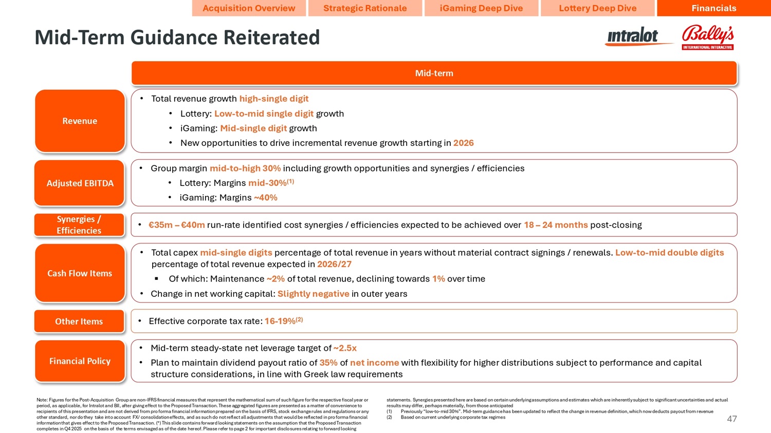 Post - Acquisition Group Pro Forma 2025 Guidance 46 €330n - €340n (2) €120n - €125n (37% margin) Revenue FY25E (1) Adjusted EBITDA FY25E (% margin) (3) €310n - €320n (42% margin) €430n - €445n (40% margin) €750n - €765n €1,080n - €1,105n + Post - Acquisition Group 10.0% - 11.0% Capex FY25E (% of revenue) 2.5% - 3.0% 4.5% - 5.5% Note: Figures for the Post - Acquisition Group are non - IFRS financial measures that represent the mathematical sum of such figure for the respective fiscal year or period, as applicable, for Intralot and BII, after giving effect to the Proposed Transaction. These aggregated figures are presented as a matter of convenience to recipients of this presentation and are not derived from pro forma financial information prepared on the basis of IFRS, stock exchange rules and regulations or any other standard, nor do they take into account FX/ consolidation effects, and as such do not reflect all adjustmentsthat would be reflected in pro forma financial information that gives effect to the Proposed Transaction. (*) This slide contains forward looking statementson the assumption that the Proposed Transaction completes in Q4 2025 on the basis of the terms envisaged as of the date hereof. The preparation of the forecast data is based on, among others, certain assumptions concerning future events that management expects to occur, and the actions management intends to take; such events and actions may not actually realize, as they depend substantially on variables which management cannot control, and may involve situations that management cannot predict. As a result, the estimates in the forecast data are, by definition, uncertain and may materially differ from and fall short of those projected or implied in the estimates. Data used in the forecast data is based on assumptionsregarding the Post - Acquisition Group’s operations and results that are based on management'scurrent expectations regarding future events and are, therefore, subject to significant uncertainties that could cause the Group’s actual results to differ materially. The forecast data, particular EBITDA guidance, does not take into account the allocation of BII's corporate costs of approximately €9.2m per annum that is expected to be incurred following the completion of the Proposed Transaction. These uncertainties include, among other things, changes in the macroeconomic condition, exchange rates, continued operational performance and the relevant market context. In particular, the achievement of forecast data is subject to significant uncertainties, also relying on positive seasonality experienced in prior years during H2 for the Intralot Group and higher royalty revenue for BII. Should any of these uncertainties realize or any of the key assumptions prove to be inaccurate, the Intralot Group’s or the Post - Acquisition Group’s actual results or events would likely differ materially from those expressed or implied in the estimates. Therefore, there can be no assurance that the estimates will eventually prove to be accurate. Prospective investors should be aware that the realization of the estimates set forth in the forecast data may be difficult or impossible due to a number of factors, including factors outside of the Post - Acquisition Group’s control and the control of management. The forecast data as not and will not be audited or reviewed by any auditor. This data is not intended to be a comprehensive statement of our financial or operational results for such periods. Potential investors should not place undue reliance on the estimates, which are based on assumptionsas of the date of this Presentation. These cautionary statementsshould be considered in connection with any written or oral forward - looking statementsthat the Intralot Group or the Post - Acquisition Group may issue in the future. Unless required by applicable laws and regulations, neither the Intralot Group, BII nor the Post - Acquisition Group undertake any obligation to publish any revisions to such forward - looking statements. Please refer to page 2 for important disclosures relating to forward looking statements (1) Guidance for revenue (sales proceeds) representsrevenue net of payout. Intralot previously reported revenue (sales proceeds) gross of payout (2) Intralot revenue FY25E forecasted to be in - line with FY24 (adjusted for payout) on a constant currency basis (3) Margin implied based on mid - point of revenue and Adjusted EBITDA guidance Financials Lottery Deep Dive iGaming Deep Dive Strategic Rationale Acquisition Overview