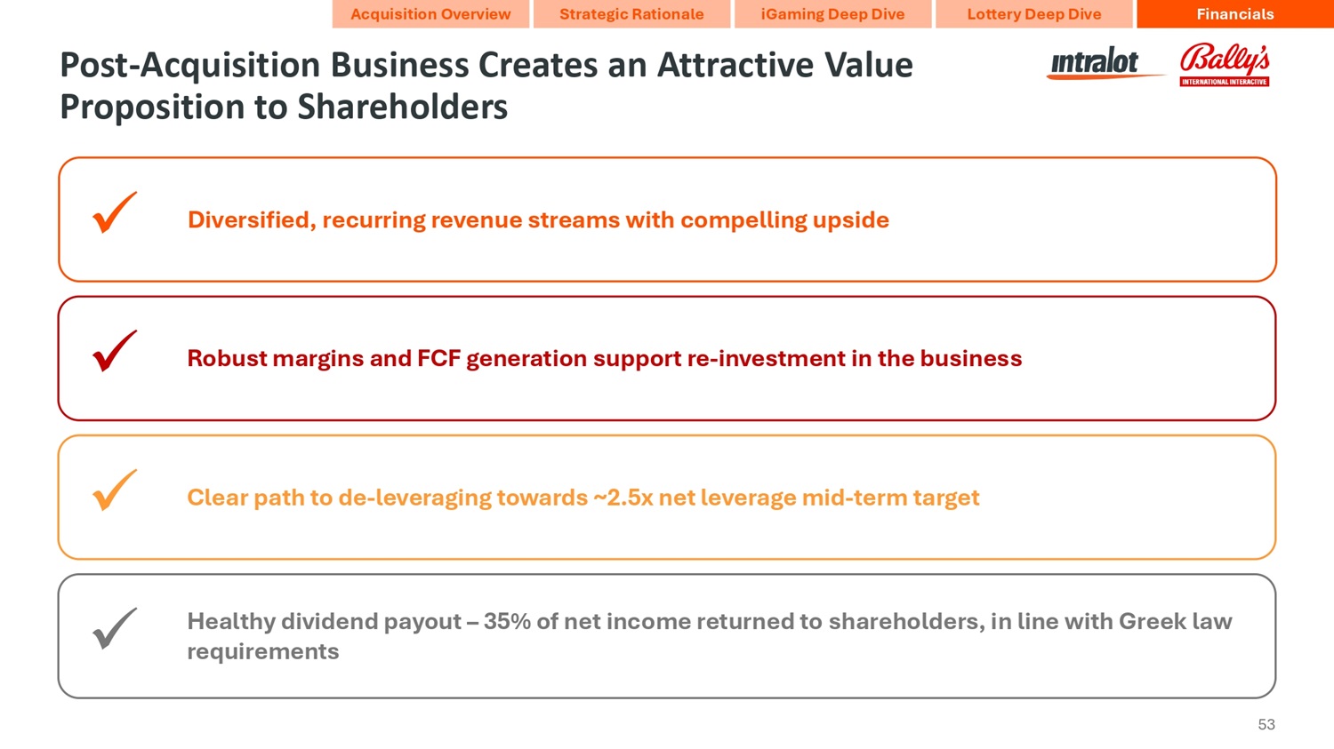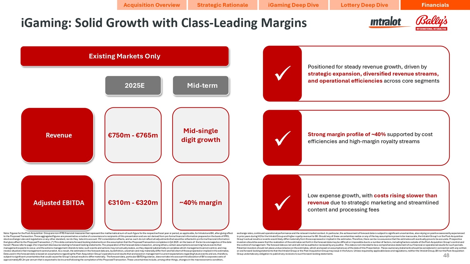 Mid - Term Guidance Reiterated 47 Revenue • Total revenue growth high - single digit • Lottery: Low - to - mid single digit growth • iGaming: Mid - single digit growth • New opportunities to drive incremental revenue growth starting in 2026 Mid - term Adjusted EBITDA • Group margin mid - to - high 30% including growth opportunities and synergies / efficiencies • Lottery: Margins mid - 30% (1) • iGaming: Margins ~40% Financial Policy • Mid - term steady - state net leverage target of ~2.5x • Plan to maintain dividend payout ratio of 35% of net income with flexibility for higher distributions subject to performance and capital structure considerations, in line with Greek law requirements Cash Flow Items • Total capex mid - single digits percentage of total revenue in years without material contract signings / renewals. Low - to - mid double digits percentage of total revenue expected in 2026/27 ▪ Of which: Maintenance ~2% of total revenue, declining towards 1% over time • Change in net working capital: Slightly negative in outer years Synergies / Efficiencies • €35n – €40n run - rate identified cost synergies / efficiencies expected to be achieved over 18 – 24 months post - closing Other Items • Effective corporate tax rate: 16 - 1G% (2) Note: Figures for the Post - Acquisition Group are non - IFRS financial measures that represent the mathematical sum of such figure for the respective fiscal year or period, as applicable, for Intralot and BII, after giving effect to the Proposed Transaction. These aggregated figures are presented as a matter of convenience to recipients of this presentation and are not derived from pro forma financial information prepared on the basis of IFRS, stock exchange rules and regulations or any other standard, nor do they take into account FX/ consolidation effects, and as such do not reflect all adjustments that would be reflected in pro forma financial information that gives effect to the Proposed Transaction. (*) This slide contains forward looking statements on the assumption that the Proposed Transaction completes in Q4 2025 on the basis of the terms envisaged as of the date hereof. Please refer to page 2 for important disclosures relating to forward looking statements. Synergies presented here are based on certain underlying assumptions and estimates which are inherently subject to significant uncertainties and actual results may differ, perhaps materially, from those anticipated (1) Previously “low - to - mid 30%”. Mid - term guidance has been updated to reflect the change in revenue definition, which now deducts payout from revenue (2) Based on current underlying corporate tax regimes Financials Lottery Deep Dive iGaming Deep Dive Strategic Rationale Acquisition Overview