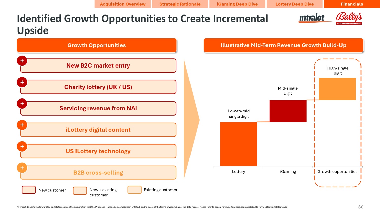 Lottery iGaming Growth opportunities Identified Growth Opportunities to Create Incremental Upside 50 Growth Opportunities Illustrative Mid - Term Revenue Growth Build - Up New B2C market entry + US iLottery technology + Charity lottery (UK / US) + iLottery digital content + B2B cross - selling + Servicing revenue from NAI + New customer Existing customer New + existing customer Low - to - mid single digit Mid - single digit High - single digit Financials Lottery Deep Dive iGaming Deep Dive Strategic Rationale Acquisition Overview (*) This slide contains forward looking statements on the assumption that the Proposed Transaction completes in Q4 2025 on the basis of the terms envisaged as of the date hereof. Please refer to page 2 for important disclosures relating to forward looking statements.