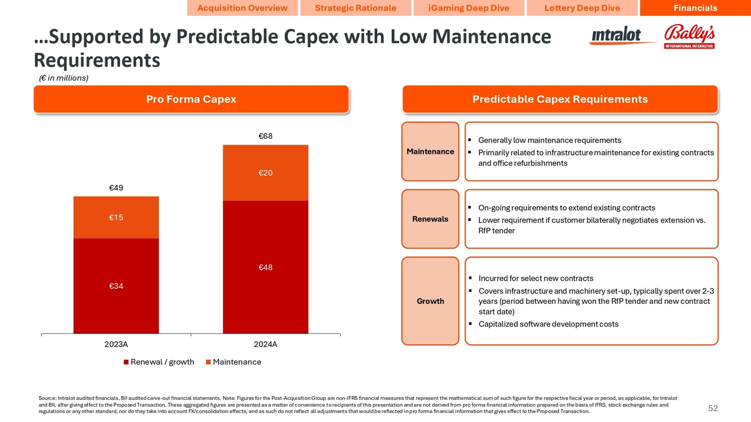 €363 €382 €23 €387 €399 2024 Pro forma adjustments Historical Pro Forma Financials Demonstrate Robust Performance… 51 Note: Figures for the Post - Acquisition Group are non - IFRS financial measures that represent the mathematical sum of such figure for the respective fiscal year or period, as applicable, for Intralot and BII, after giving effect to the Proposed Transaction. These aggregated figures are presented as a matter of convenience to recipients of this presentation and are not derived from pro forma financial information prepared on the basis of IFRS, stock exchange rules and regulations or any other standard, nor do they take into account FX/ consolidation effects, and as such do not reflect all adjustments that would be reflected in pro forma financial information that gives effect to the Proposed Transaction. Source: Intralot audited financials, BII audited carve - out financial statements (1) €32.6m of run - rate royalty adjustments (2) €32.6m of run - rate royalty revenue adjustments excluding ~€7m of FY2024 royalties (3) Intralot’s revenue (sales proceeds) is net of winner’s payout to enhance comparability to BII financials (4) Pro Forma RR Adjusted EBITDA includes €32.6m of run - rate adjustments for royalties and removal of ~€9m of corporate cost allocation (5) Pro Forma RR Adjusted EBITDA includes the removal of ~€7m of FY2024 royalties, addition of €32.6m of run - rate adjustments for royalties, and removal of ~€9m of corporate cost allocation (6) Operating FCF calculated as Pro Forma RR Adjusted EBITDA less maintenance capex. Operating FCF conversion calculated as (Pro forma RR Adjusted EBITDA – maintenance capex) / Pro Forma RR Adjusted EBITDA (€ in millions) Strong Growth Structurally High Margins Significant Cash Generation Cash conversion (%) (6) : G6.3% G5.2% Margin: 3G.2% 40.4% (5) (4) €17 (5) Growth rate of combined metrics 2023 Operating FCF (6) (1) Financials Lottery Deep Dive iGaming Deep Dive Strategic Rationale Acquisition Overview (3) €962 €1,041 €33 €26 (2) €995 €1,067 2023 2024 Revenue (Sales Proceeds), net of payout Pro forma adjustments €378 €402 €23 (4) €17 €402 €419 2023 Adjusted EBITDA 2024 Pro forma adjustments