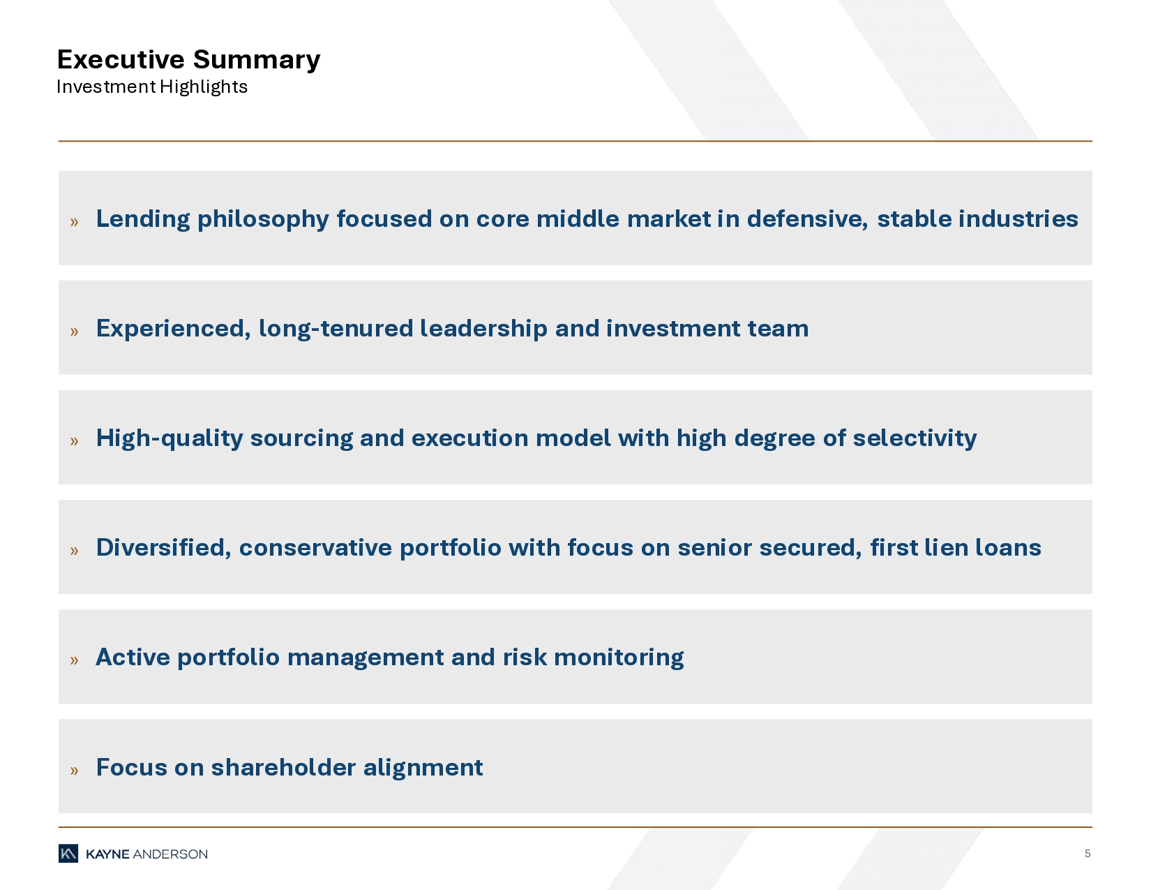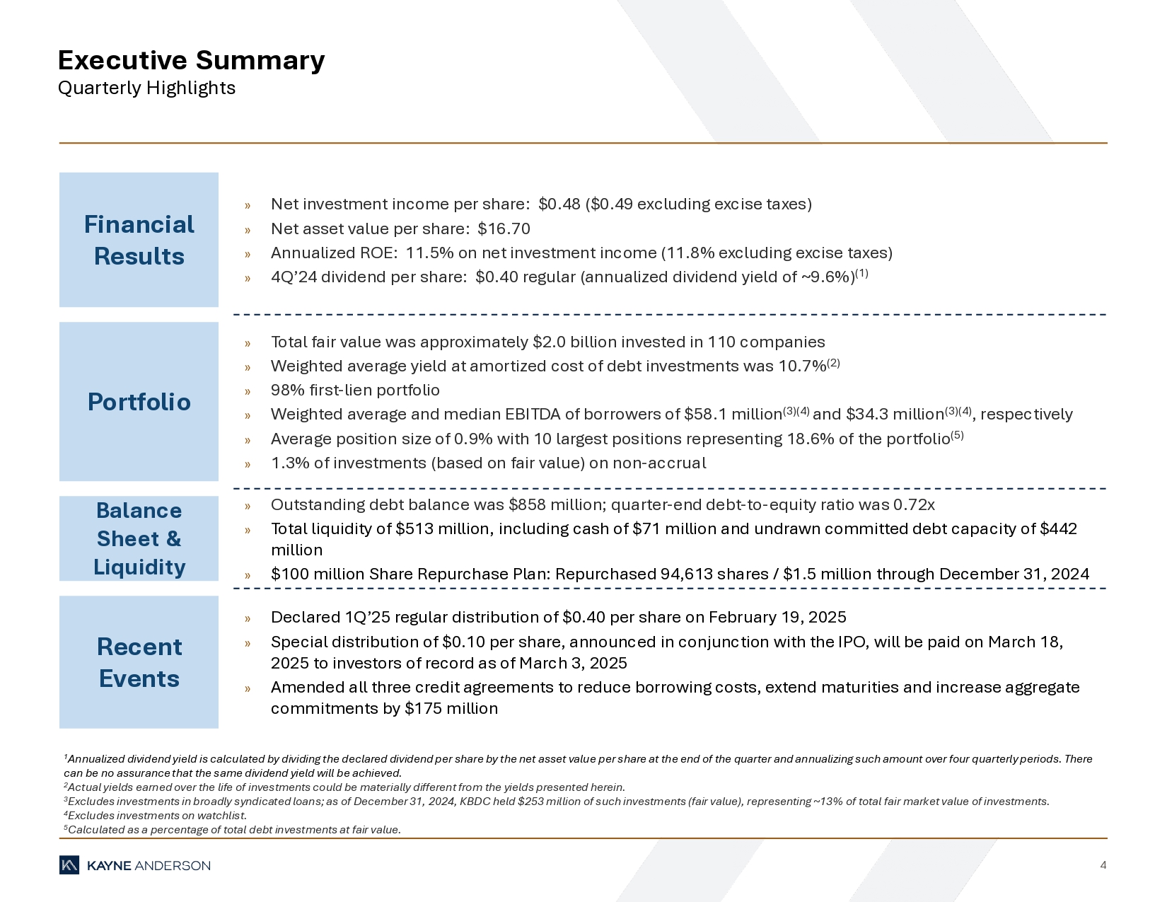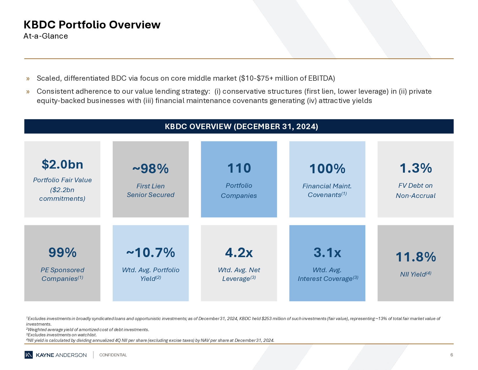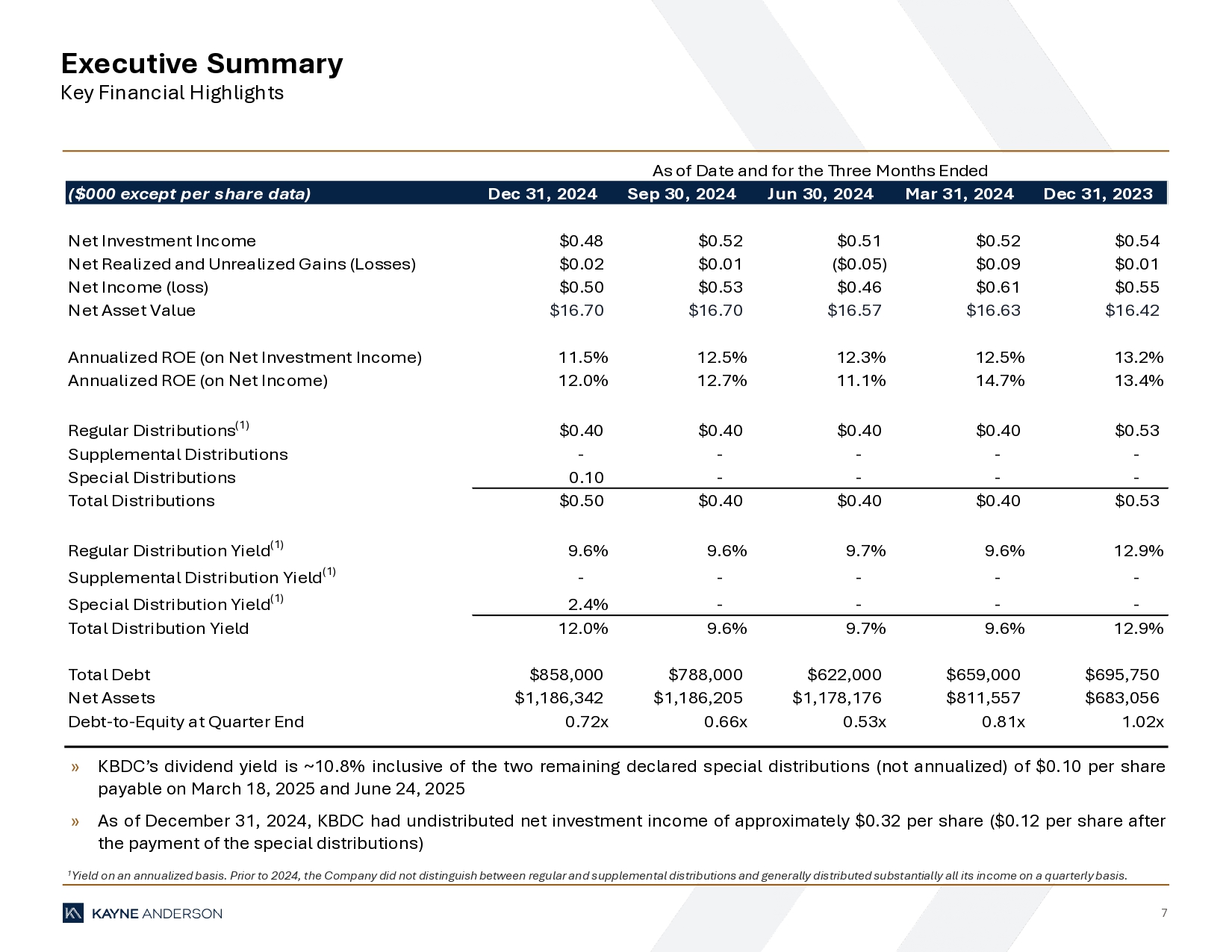 4 Executive Summary Quarterly Highlights 1 Annualized dividend yield is calculated by dividing the declared dividend per share by the net asset value per share at the e nd of the quarter and annualizing such amount over four quarterly periods. There can be no assurance that the same dividend yield will be achieved. 2 Actual yields earned over the life of investments could be materially different from the yields presented herein. 3 Excludes investments in broadly syndicated loans; as of December 31 , 2024, KBDC held $ 253 million of such investments (fair value), representing ~13% of total fair market value of investments. 4 Excludes investments on watchlist. 5 Calculated as a percentage of total debt investments at fair value. Financial Results Portfolio Balance Sheet & Liquidity Recent Events » Net investment income per share: $0.48 ($0.49 excluding excise taxes) » Net asset value per share: $16.70 » Annualized ROE: 11.5% on net investment income (11.8% excluding excise taxes) » 4Q’24 dividend per share: $0.40 regular (annualized dividend yield of ~9.6%) (1) » Total fair value was approximately $2.0 billion invested in 110 companies » Weighted average yield at amortized cost of debt investments was 10.7% (2) » 98% first - lien portfolio » Weighted average and median EBITDA of borrowers of $58.1 million (3)(4) and $34.3 million (3)(4) , respectively » Average position size of 0.9% with 10 largest positions representing 18.6% of the portfolio (5) » 1.3% of investments (based on fair value) on non - accrual » Outstanding debt balance was $858 million; quarter - end debt - to - equity ratio was 0.72x » Total liquidity of $513 million, including cash of $71 million and undrawn committed debt capacity of $442 million » $100 million Share Repurchase Plan: Repurchased 94,613 shares / $1.5 million through December 31, 2024 » Declared 1Q’25 regular distribution of $0.40 per share on February 19, 2025 » Special distribution of $0.10 per share, announced in conjunction with the IPO, will be paid on March 18, 2025 to investors of record as of March 3, 2025 » Amended all three credit agreements to reduce borrowing costs, extend maturities and increase aggregate commitments by $175 million